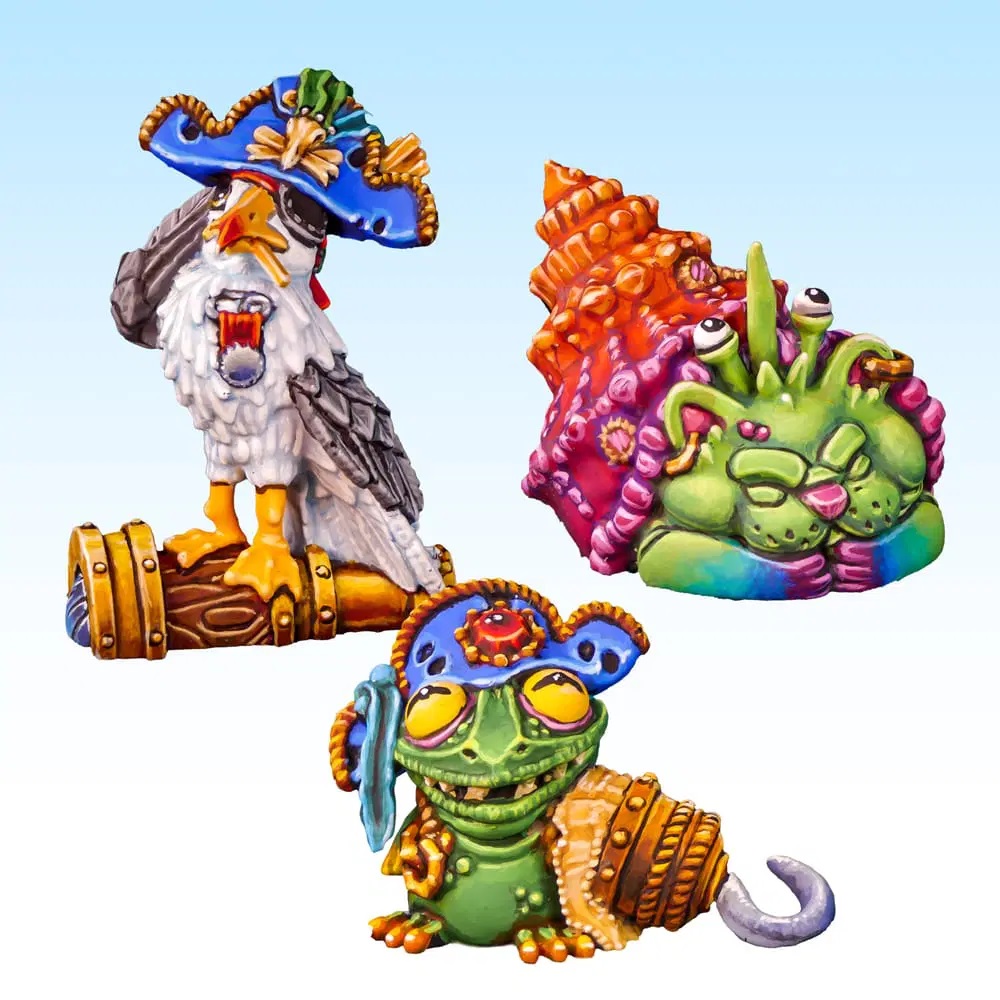 This set comes with a gang/crew of little fellows to help your piratically minded mischief makers on the tabletop. You get the sleeping hermit critter, a frog who has dreams of grandeur and a seagull who understood the assignment.