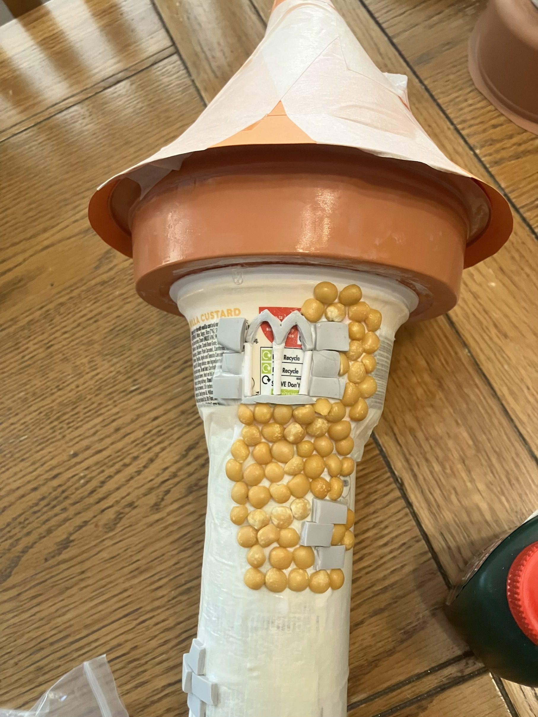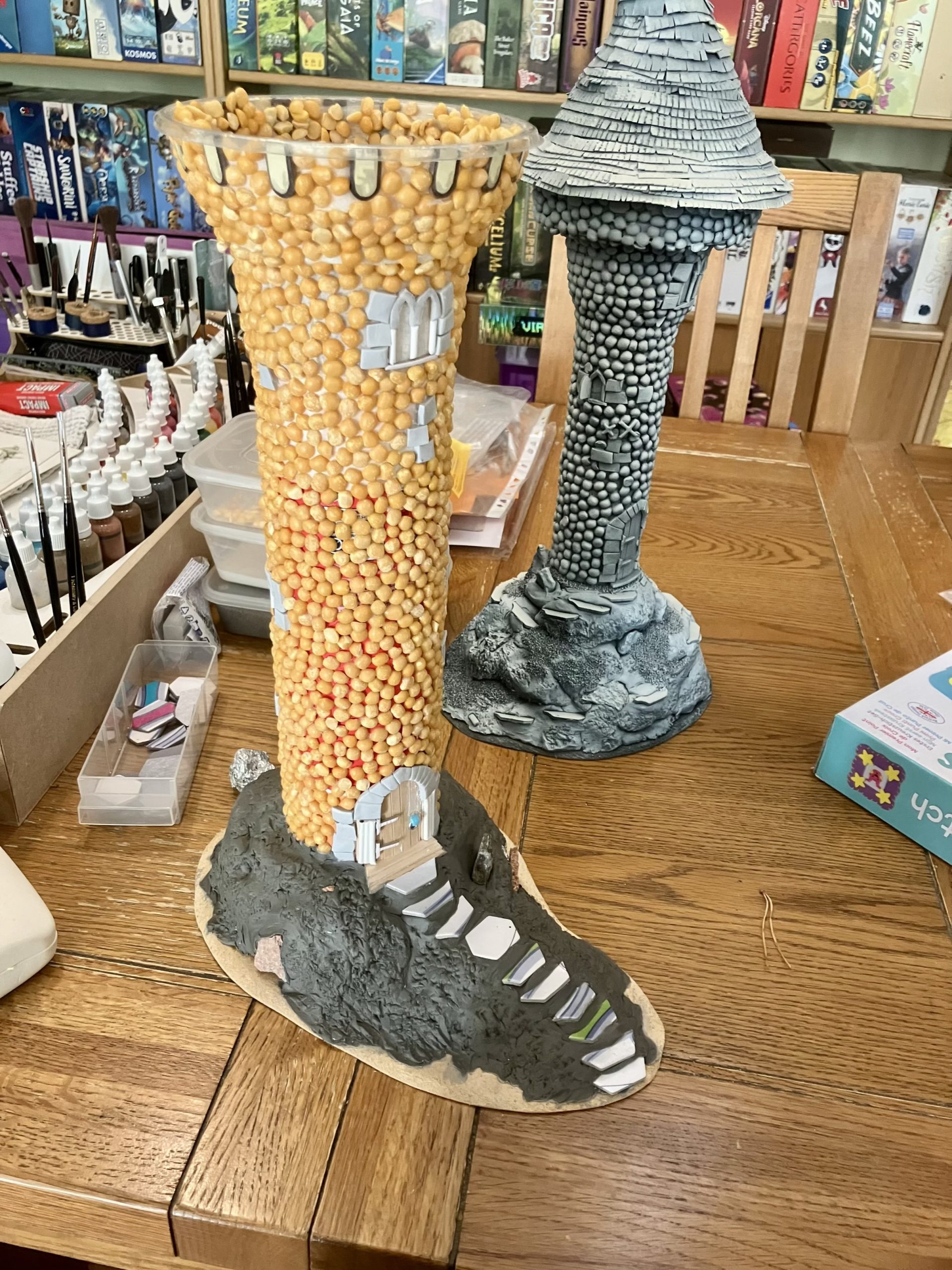 Classically, this tower started off as a humble Pringles tube. A few cans, tubes and tubs were then taken and fashioned into the additional bits and pieces that would make up this rickety tower. A few sculpted details were added here and there, like window frames and you'll also notice some stone slabs in places. The majority of the building however, was actually crafted from another number of ingredients, the powerful split pea!