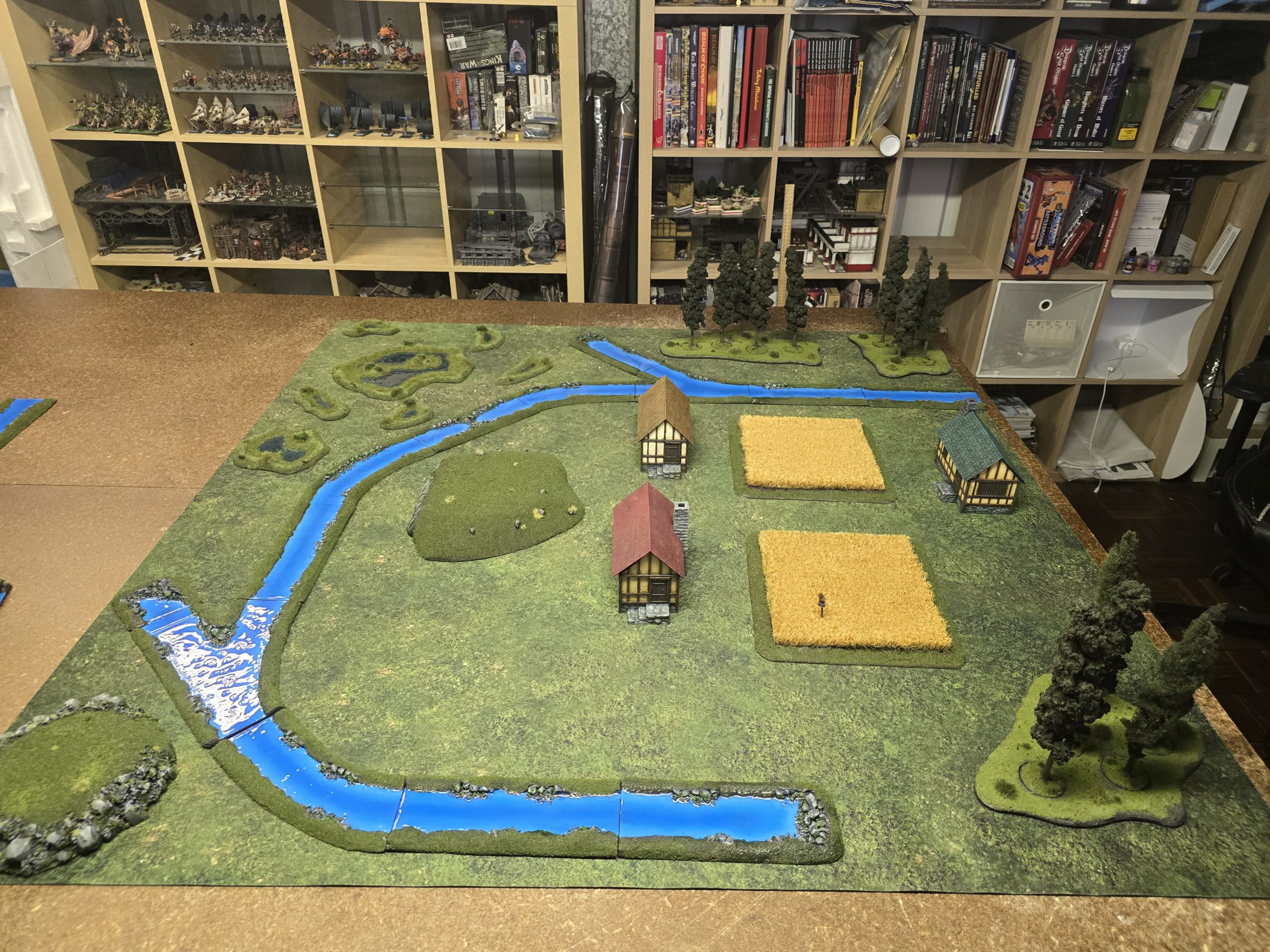 As you can see, the tabletop is looking rather good after a good month or so of work on this collection. A bunch of set-on terrain like hills, marshes, swamps, rivers, fields and houses helps to show off just how much character you can suddenly get with a tabletop.