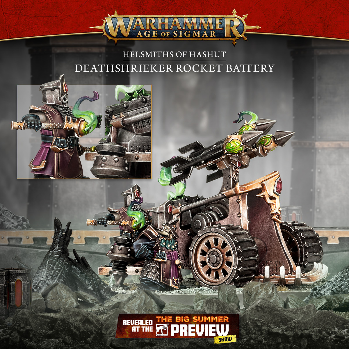 Last but not least, we have another impressive war machine that the Helsmiths can wheel out of their factories. The Deathshrieker Rocket Battery will do exactly what it says on the tin, hammering the enemy from range.