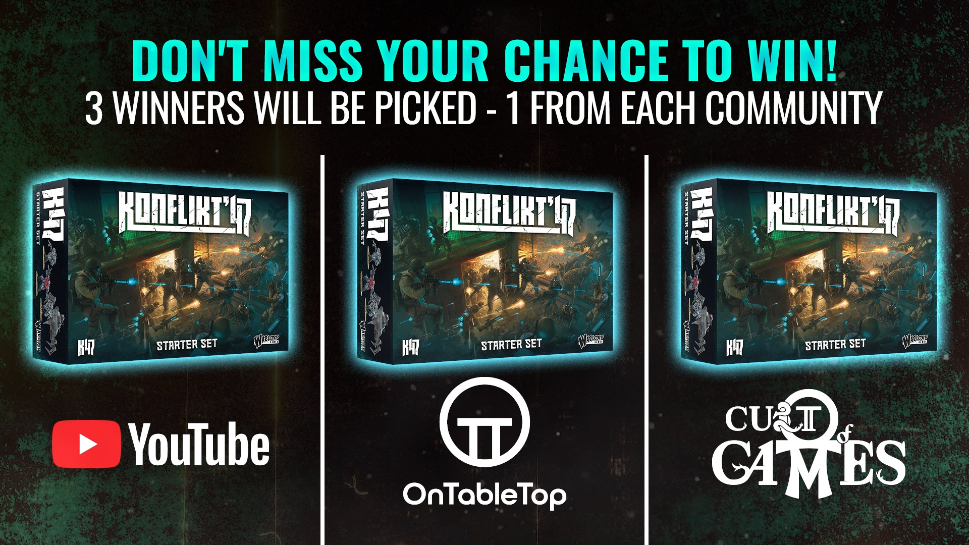 Three lucky winners from comments on YouTube, OnTableTop and Cult of Games will win one of the brand new Konflikt '47 Starter Sets, which features the new miniatures for the Axis and the United States.