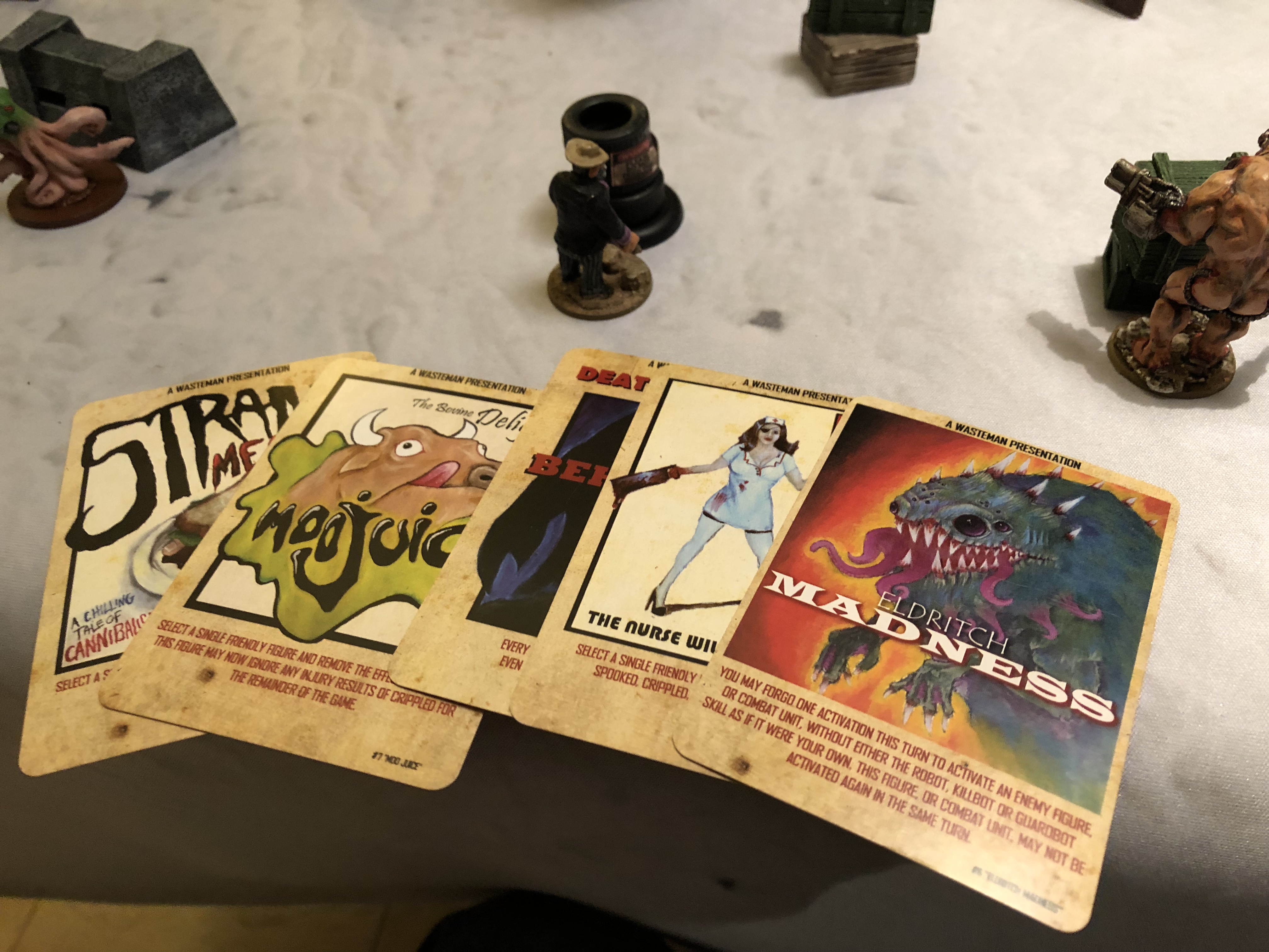 Wasteman is my go to game, I introduced it to my club and they loved it. Its regularly requested on a games night and we always have a great laugh. This is the main point for me, its easy to learn but has enough tactical depth should you need it. The miniatures are bonkers and varied allowing you to create a posse of your design. Each one comes with its own stat card which gives a sample set of stats to get you going. These can be modified should you wish or you can create your own for your miniatures. The artwork on the cards and rulebook are amazing and have their own unique style. With the Rulebook comes a set of MAD cards (Mutually Assured Destruction ) These cards are drawn and played throughout the game and add a really good fun aspect to the game, they vary from alien abductions to Tornados & Oil slicks.
