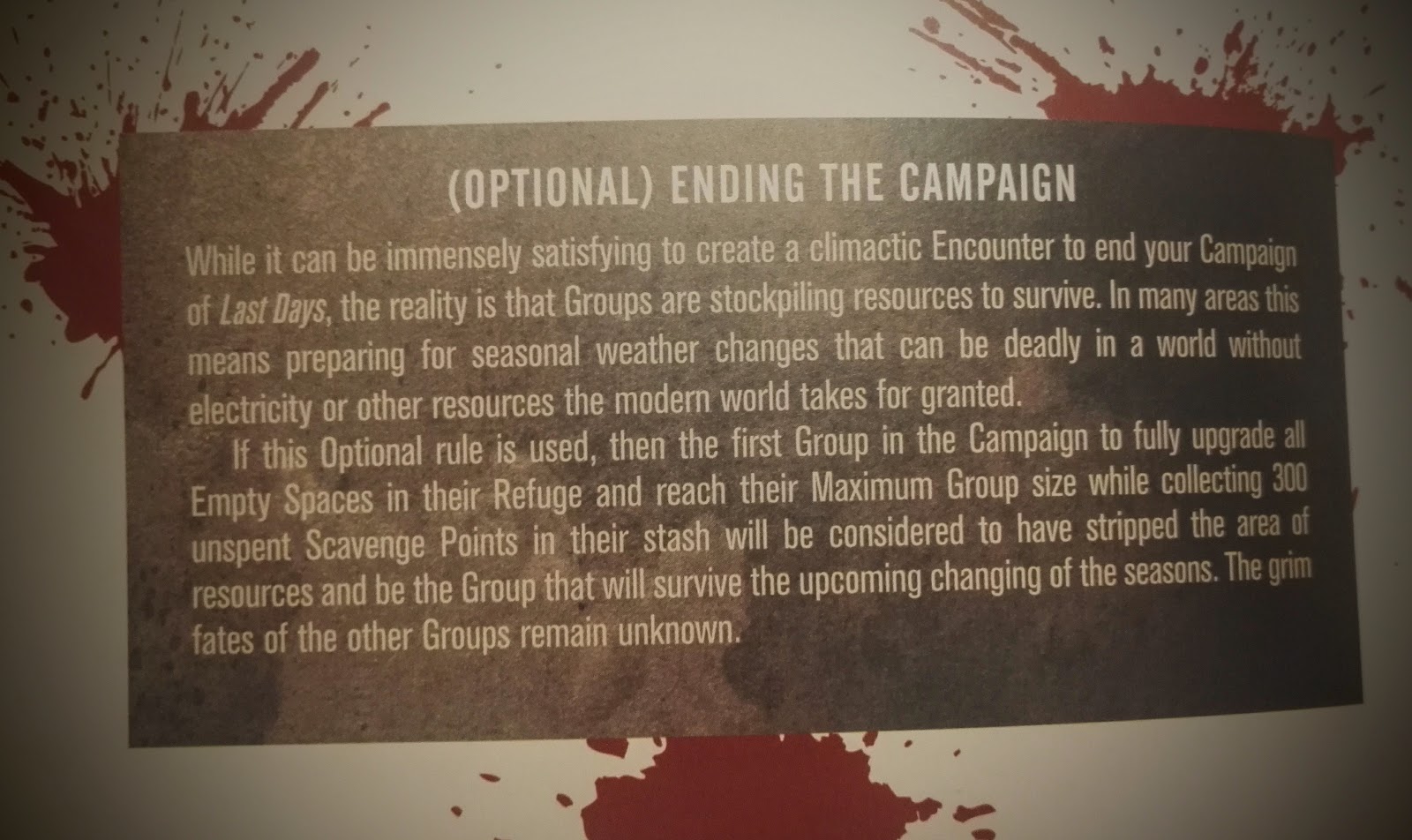 Skirmish games begs for campaigning and for this Last Days seems to shine. After scenarios character might get new skills, new gear, improve the refuge or find new survivors. But they'll also take damage, get wounds, amputated limbs and get attacked by zombies at their home.
