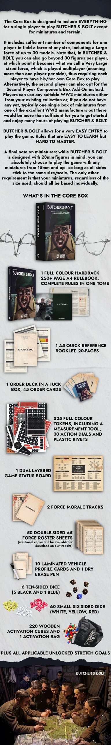 Butcher & Bolt has been designed so it's easy for you to get started with their Core Box, giving you a great starting point. Because you can use literally any World War II miniatures that you have access to, you simply need the components for Butcher & Bolt and you can dive right in.