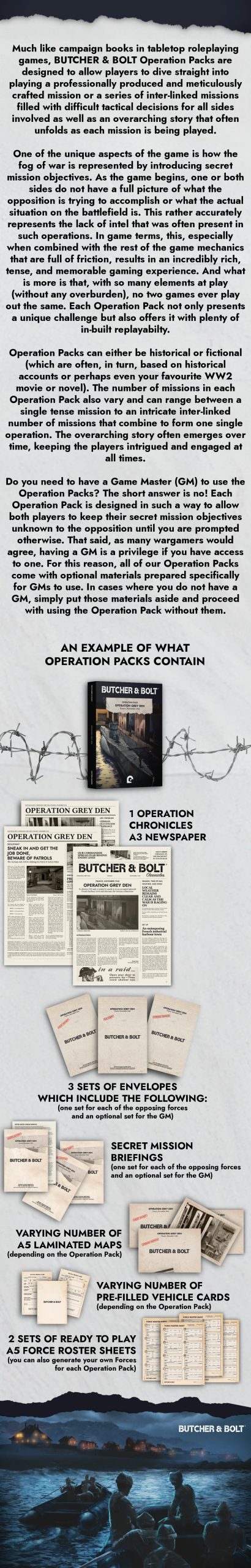 Operation Packs also highlight the key Fog of War mechanic present in Butcher & Bolt. Both sides will never have a full picture of what they are trying to accomplish and what events await them when the fighting starts. This means that the games that you play will be dynamic and interesting experiences where you have to think on the fly in order to achieve your objectives!