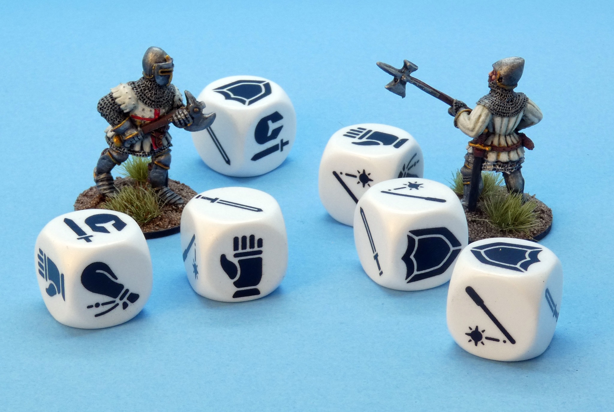 The idea was to emulate the real feel of Medieval combat, including the strength of armour and how the decision to charge in and fight hand-to-hand was not made lightly. You can use normal d6 to play Écorcheurs but Robert W. Jones was impressed with how the unique dice stopped people considering the odds and instead got into the cut and thrust of the moments playing out on the field of battle.