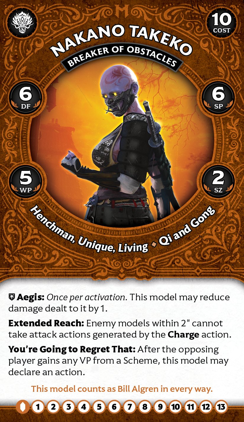 Nakano Takeko is a unique alternate sculpt that counts as the character Bill Algren in Malifaux Fourth Edition. While the rules remain the same, the miniature introduces a completely new aesthetic for the character, giving players a fresh option to represent him on the tabletop.
