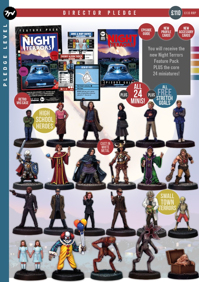 You can also get the Director Pledge which comes with the Feature Pack and a bunch of miniatures for you to be diving into 7TV with. There is also a full collection of terrain themed to Pilgrim's Bluff that you can pick up as part of the Kickstarter.