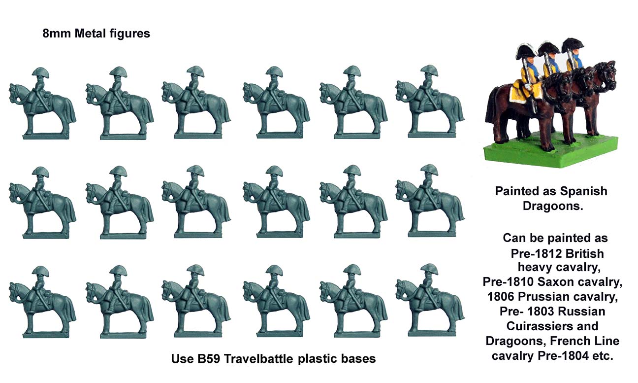 These give you more options for the Spanish, painted as you can see here, like Dragoons. They could also be British Heavy Cavalry, Saxon Cavalry, Prussian Cavalry, Russian Cuirassiers and Dragoons or French Line Cavalry. Another lovely, simple set of miniatures that you could finish off very quickly for use in Travelbattle.