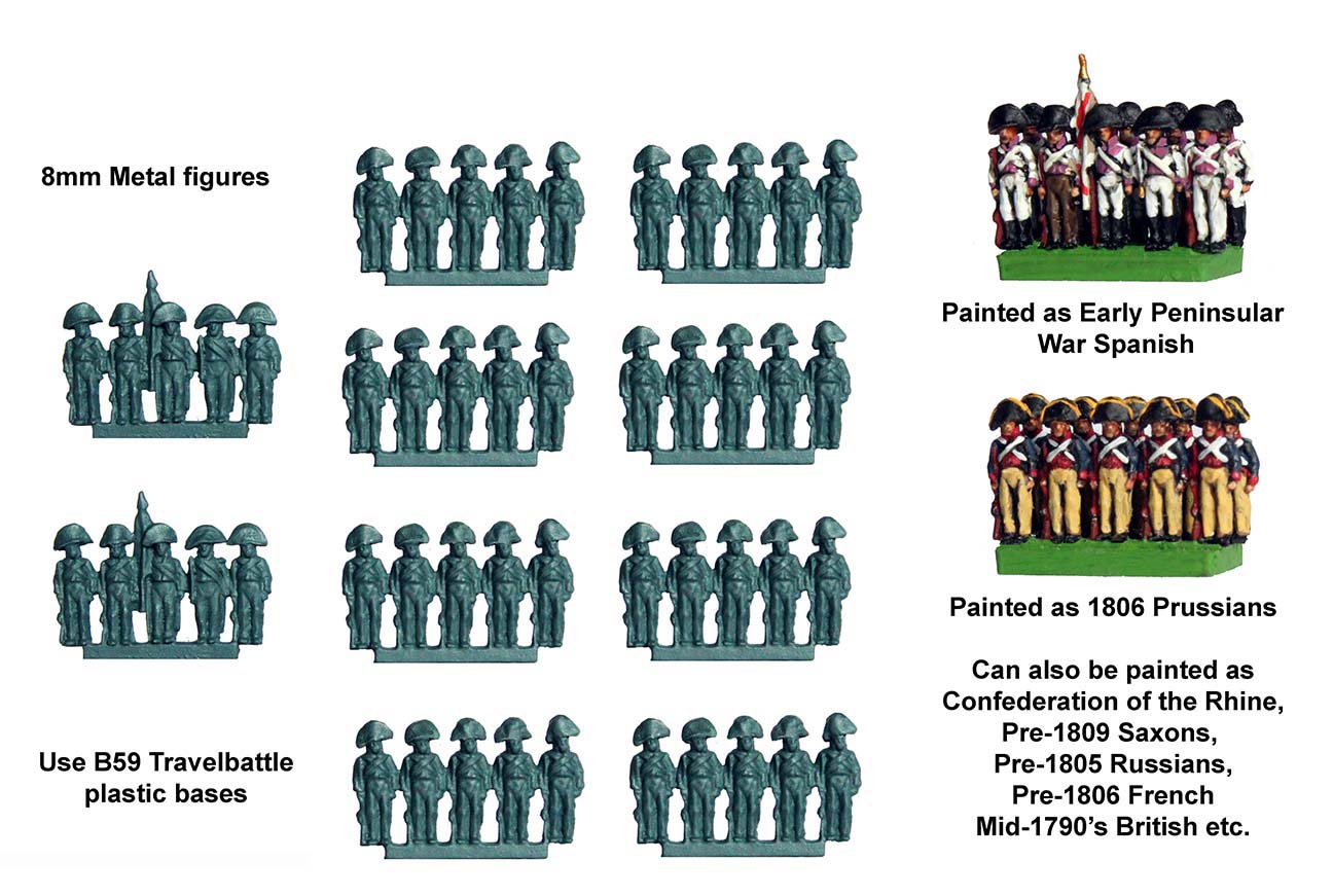 These have been painted here as Early Peninsular War Spanish and 1806 Prussians. They could also be painted as the Confederation of the Rhine, Saxons, Russians, French and even the British from the mid-1790s.