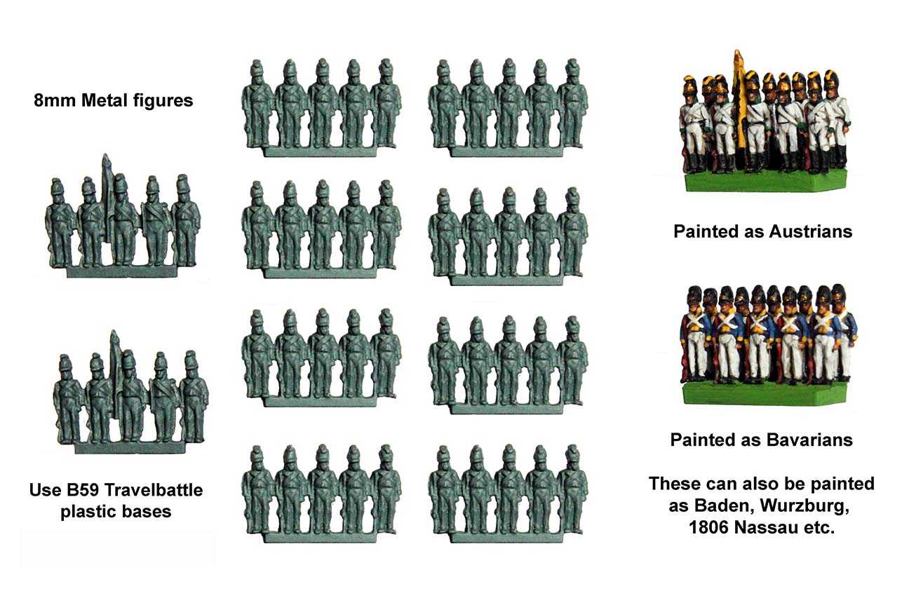 These here have been painted as Austrians and Bavarians, but could also be based on the forces of Baden, Wurzbaurg and 1806 Nassau if you like. Again, they are in the right scale for Travelbattle and you could just paint them up in the classic Red vs Blue scheme of the game. Or, go more detailed with the schemes as you can see here.