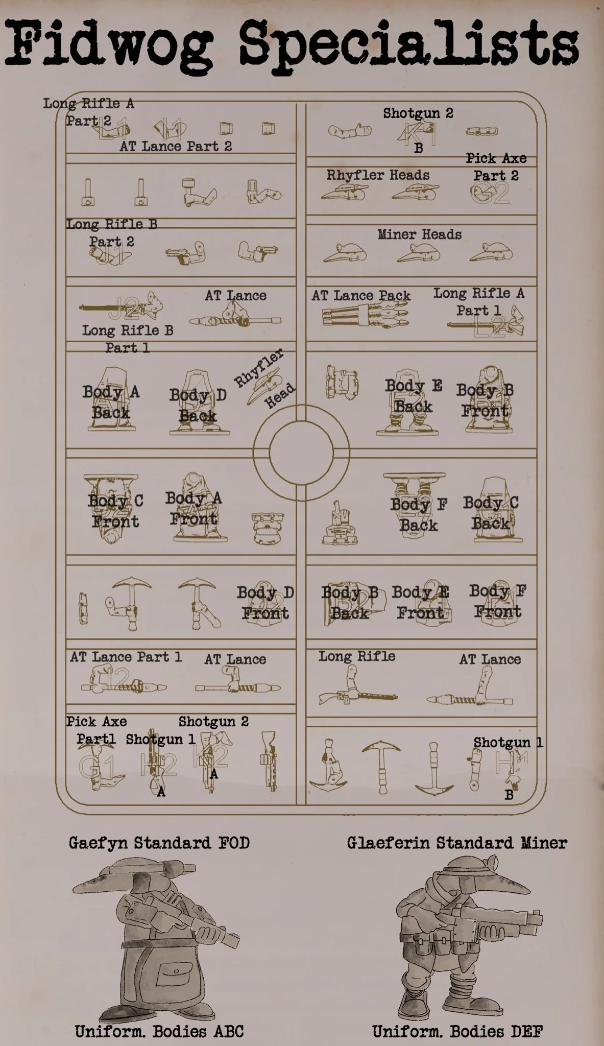 This set comes with enough components for you to build twelve of the new Fidwog Specialists armed with a variety of different weapons. The options within allow you to make Lancers, Miners and Marksquar so you can cover all manner of varying battlefield roles.