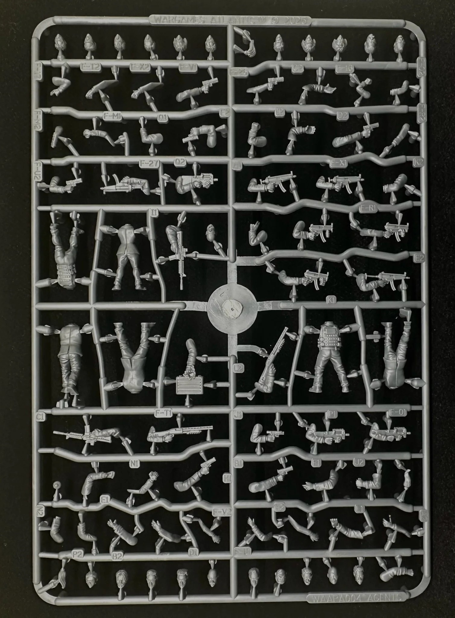 The sprues give you options for making men in suits, women in suits, plus male and female bodies with tactical vests. You also have all sorts of different weapons included in the set, like Shotguns, Pistols, MP-5s, P-90s (yes!), HKs and M-class Rifles.
