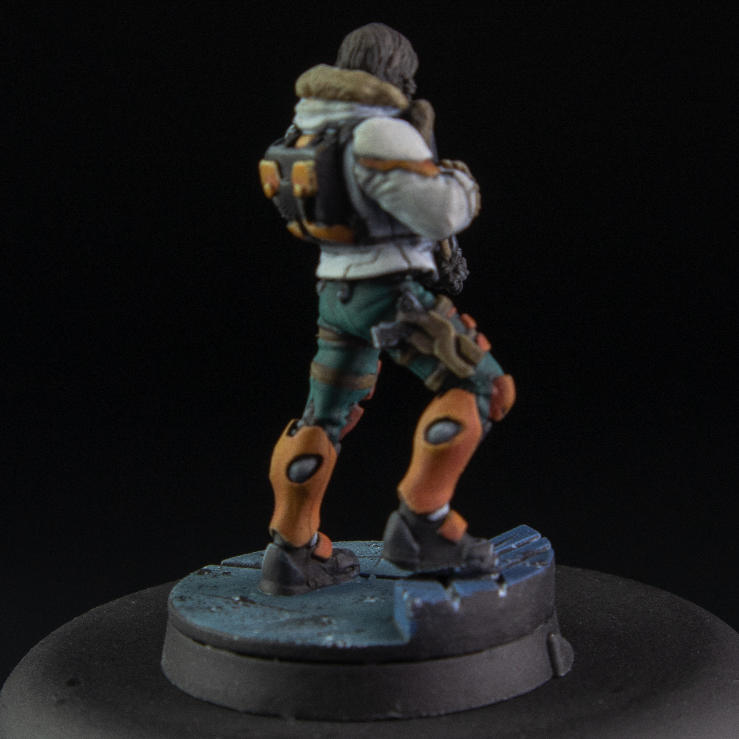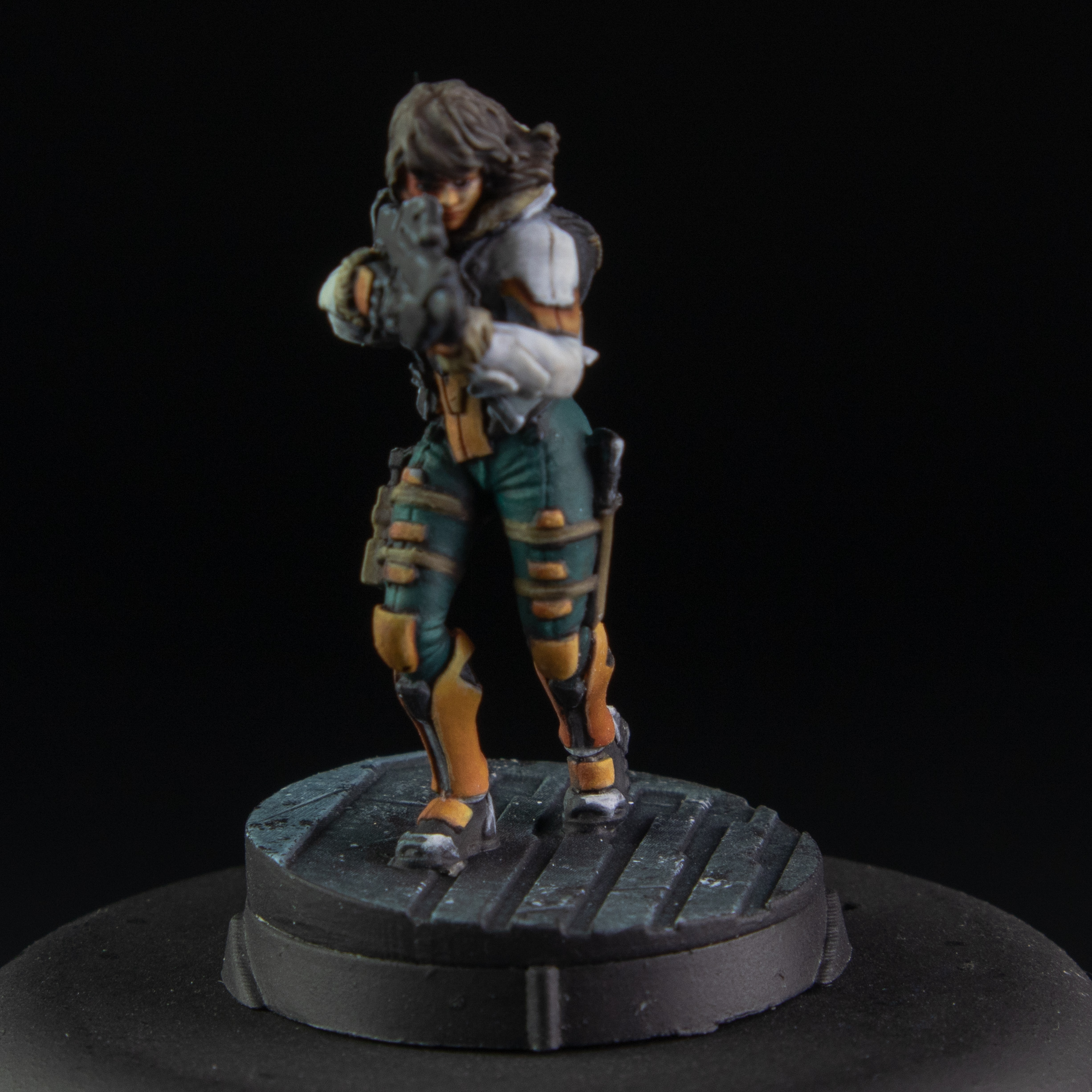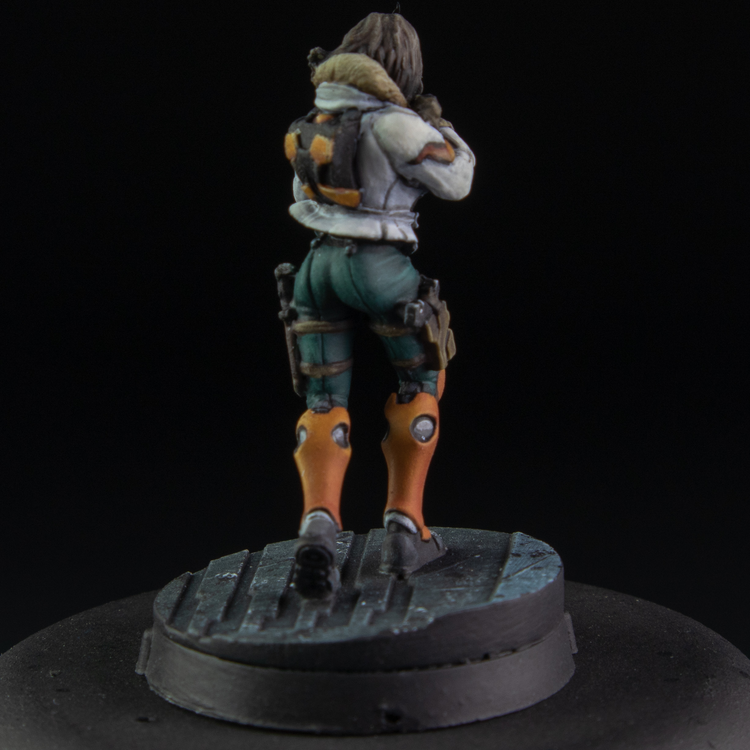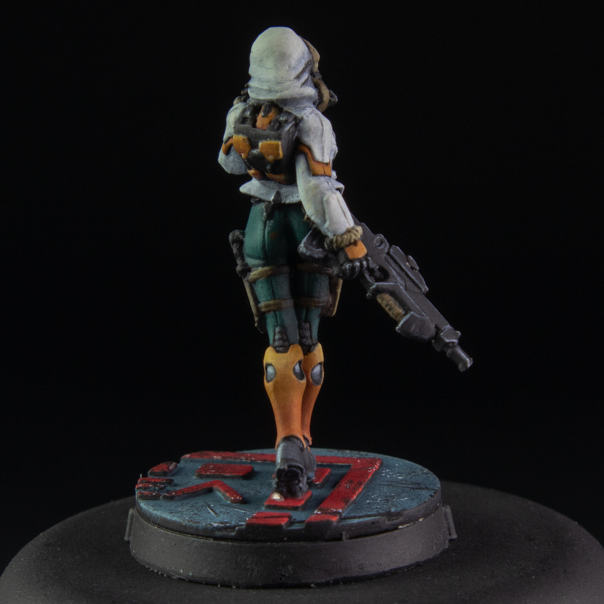 I loved the Team Sirius model though I didn’t like the rock so that had to go. Placed her on a Defiance base (to match the rest I have) on a cargo container and she looks like she is looking round a corner (while her bot does the fighting).