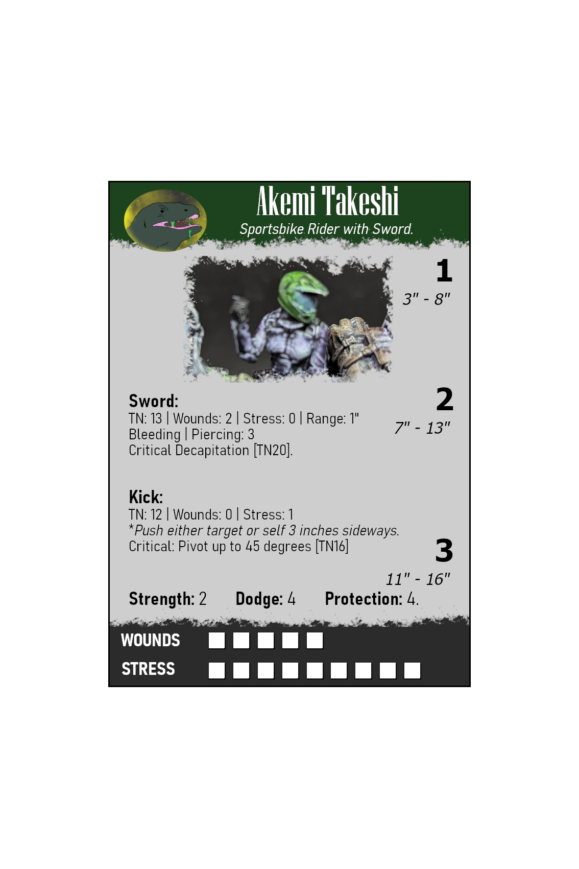As you will see my font choices have moved to something far more generic looking on the cards, this has happened for 2 reasons, 1 dull and another annoying. I did however change the name to a more interesting choice, this isnt final more a point of concept, does the card work and look like its right with the different fonts I think it could IF the design is right. The other major change to Komodo some may have missed if they no longer have access to any fire arms, this is a deliberate choice to help differentiate them from the other factions and one for balancing as well.
