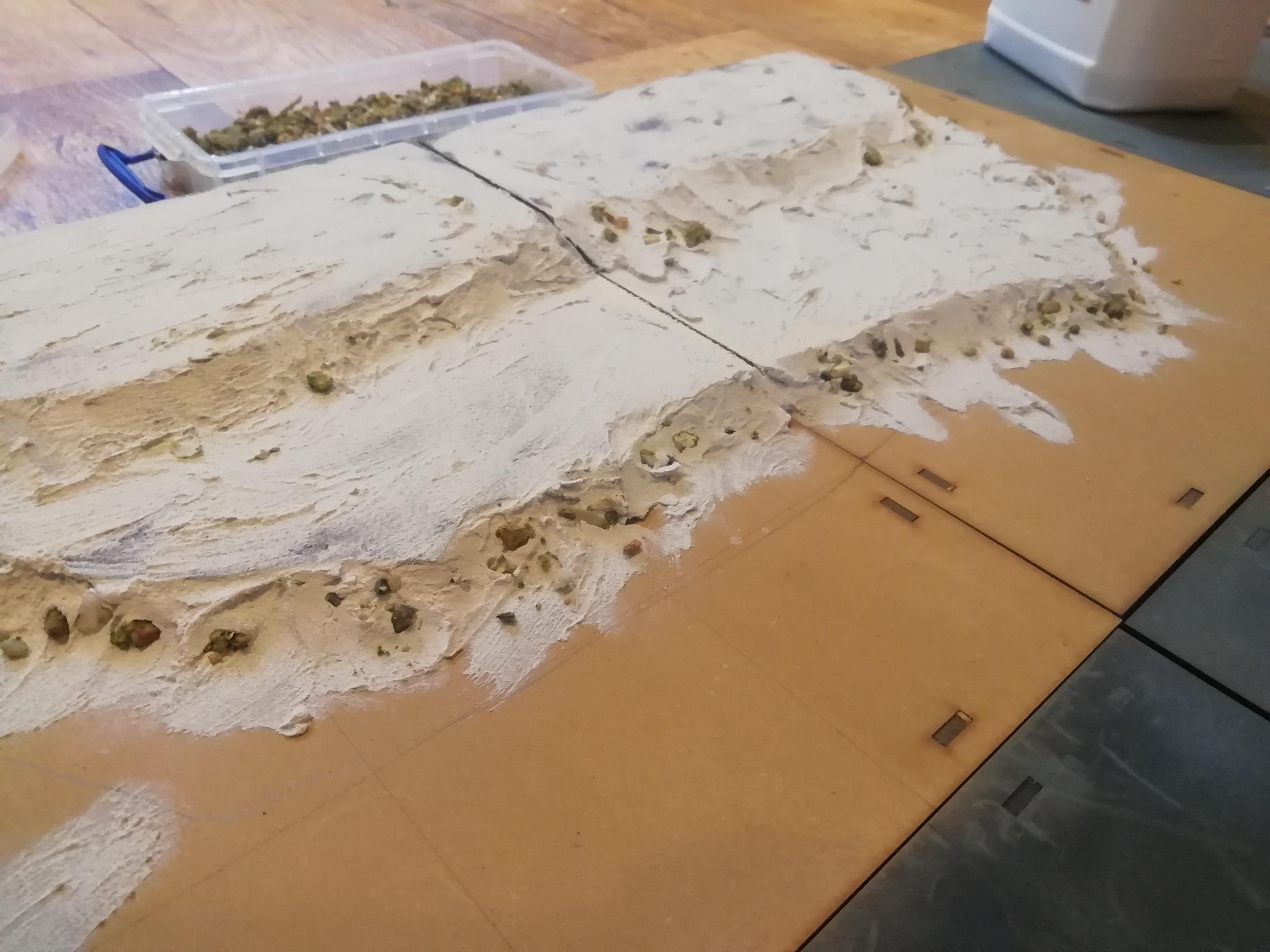 I realised what I needed was a large hill for my red coats to march up with a redoubt at the summit. I also needed the edge of Charlestown on one side of the board. I had a green mat but no hills big enough so I wondered how best to tackle it. I already had some hills I’d made out of foam that double as islands for other games. I laid them out and cut up some new sections to fit what I already had.