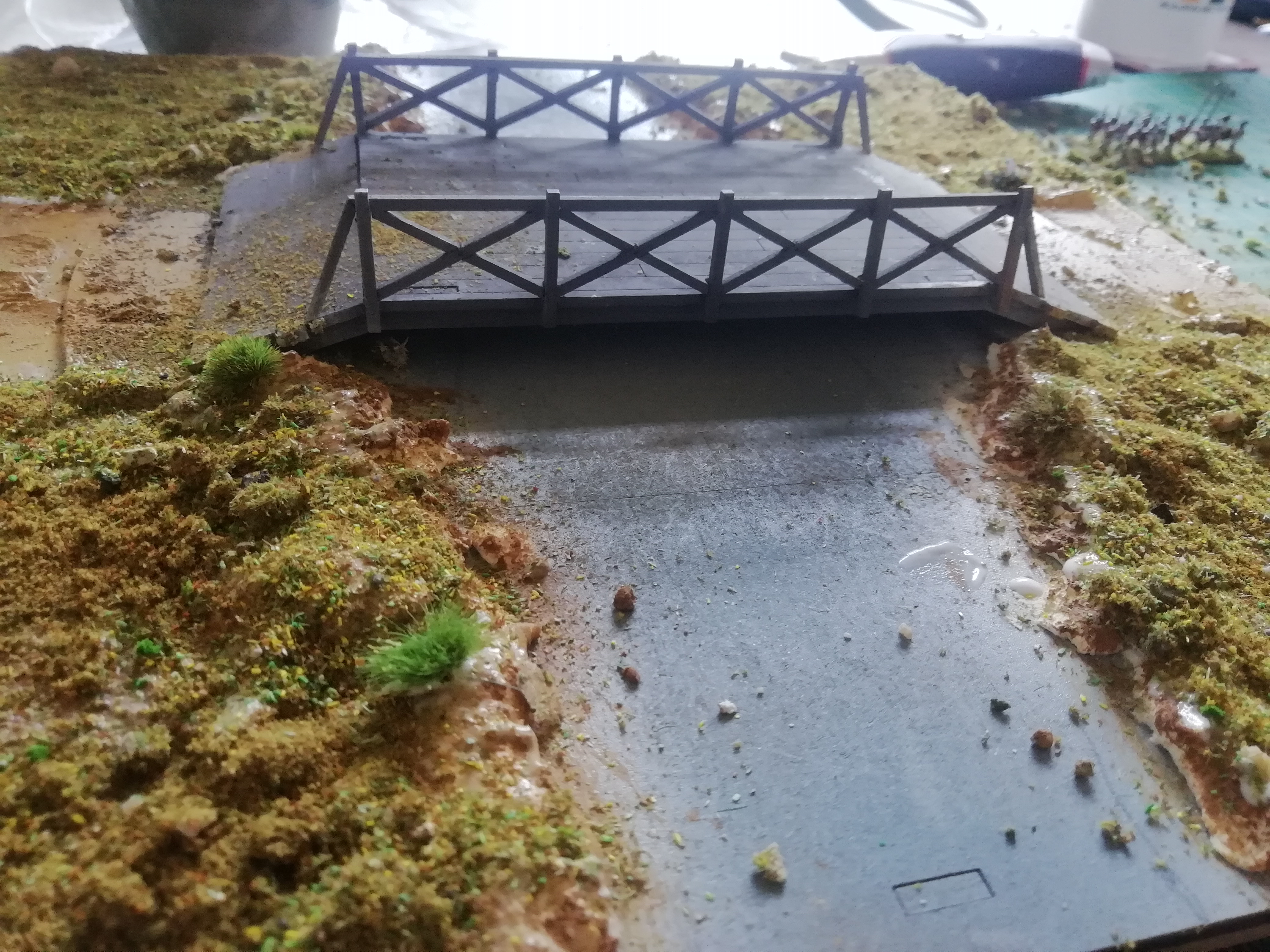 I picked up a couple of plastic buildings from rendera which come with a lot of fences which seem common on American battlefields. I find them a bit flimsy on the table so I decided to mount them with a few flowers and a couple of grave stones. The church can come off the board and be replaced with the cabin. Maybe they buried their relatives in the back garden. I hope to get a few more buildings so I can do the edge of a settlement.