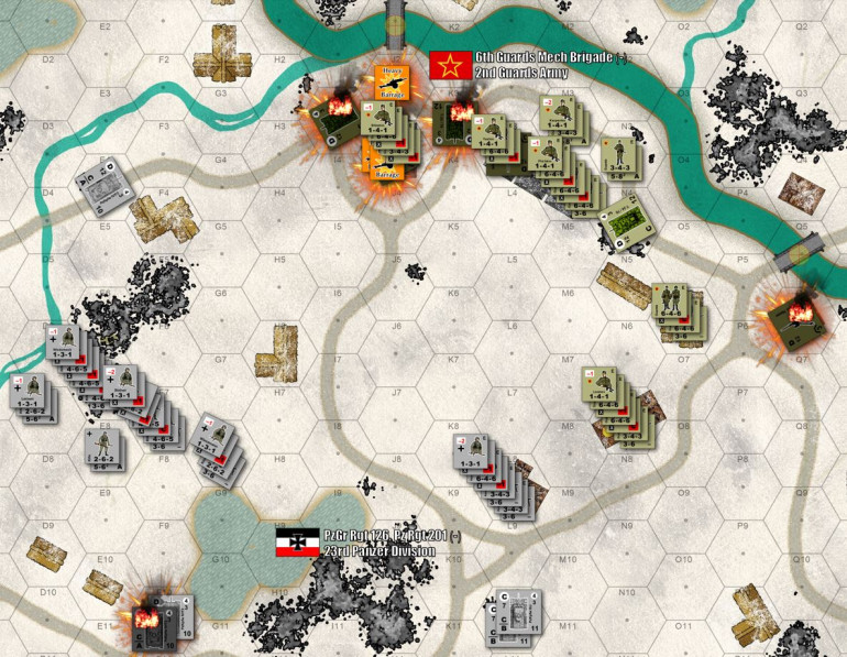 One of the playtesting games ends in a draw. A handful of German infantry (mostly leftover mortar crews) and the last PzKpfw-IIIJ hold the two bridges. The Soviets gather everything they have left and launch two assaults on the last turn of the game. The German mortar crews ... against all odds, hold out at one of the bridges. The tank does not. Each side thus holds one of the two objective bridges, indicating a draw.