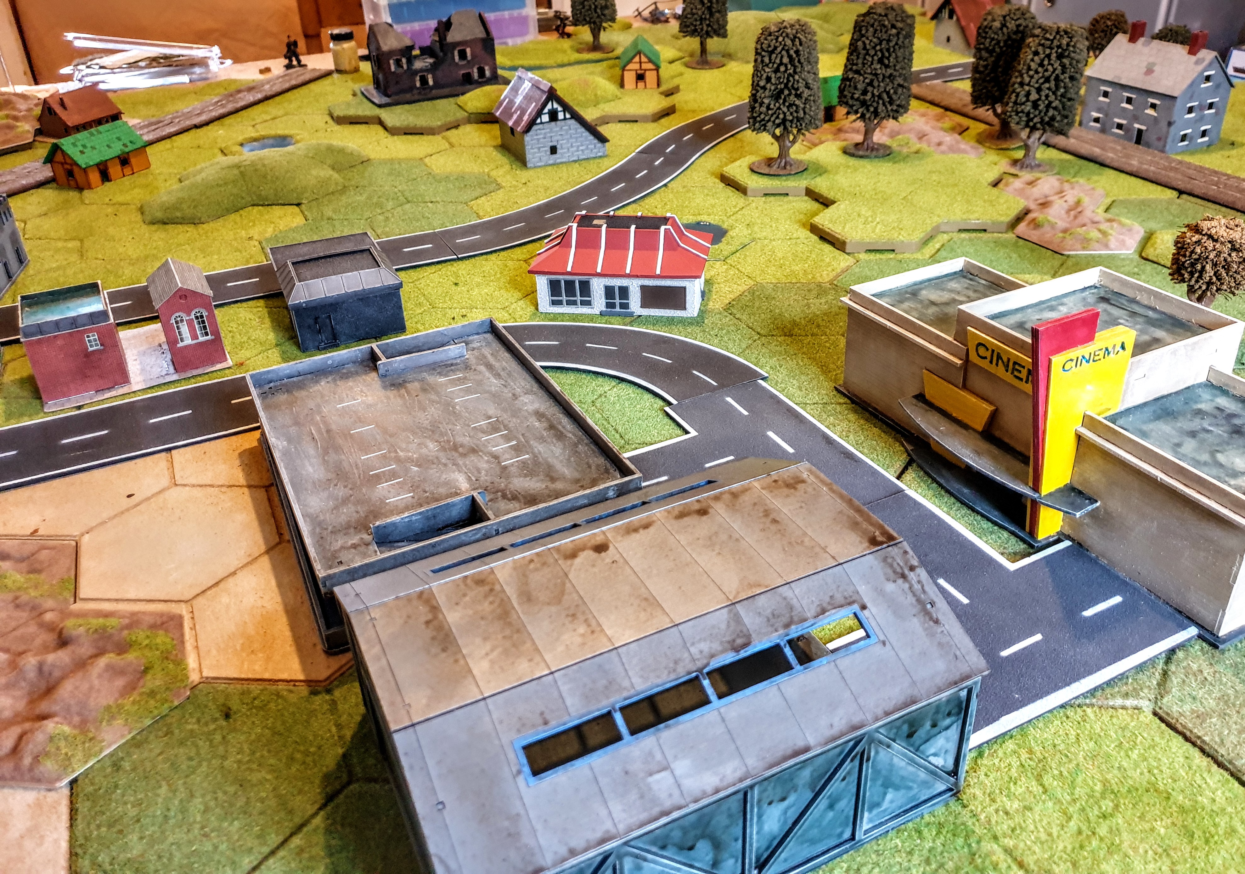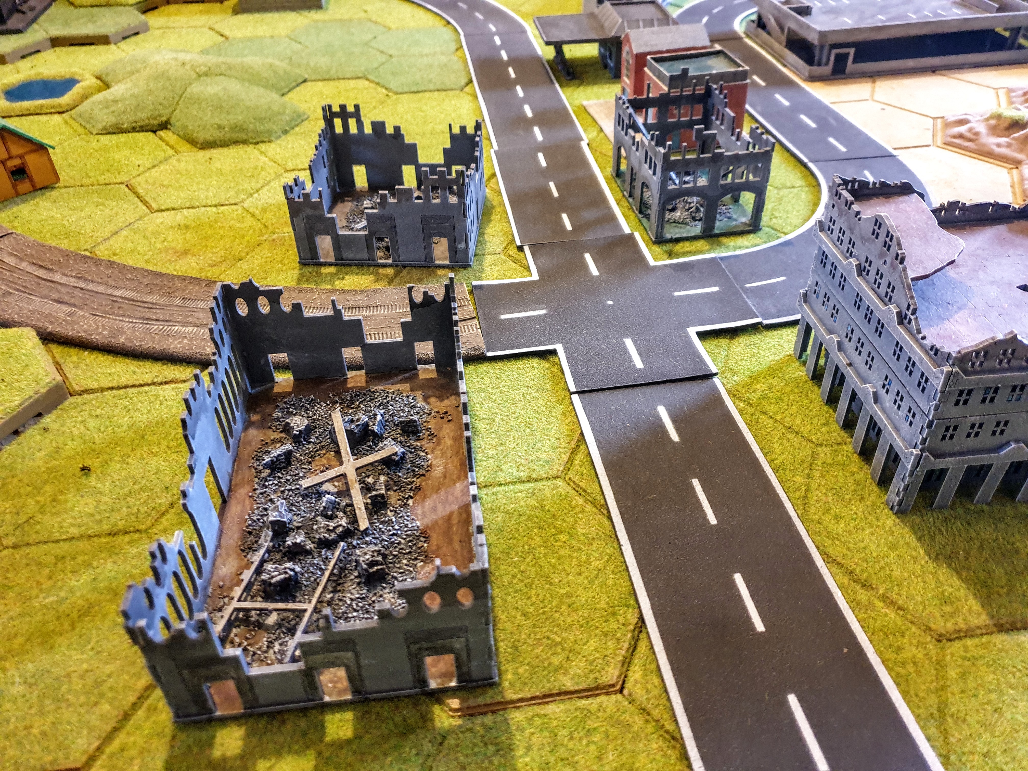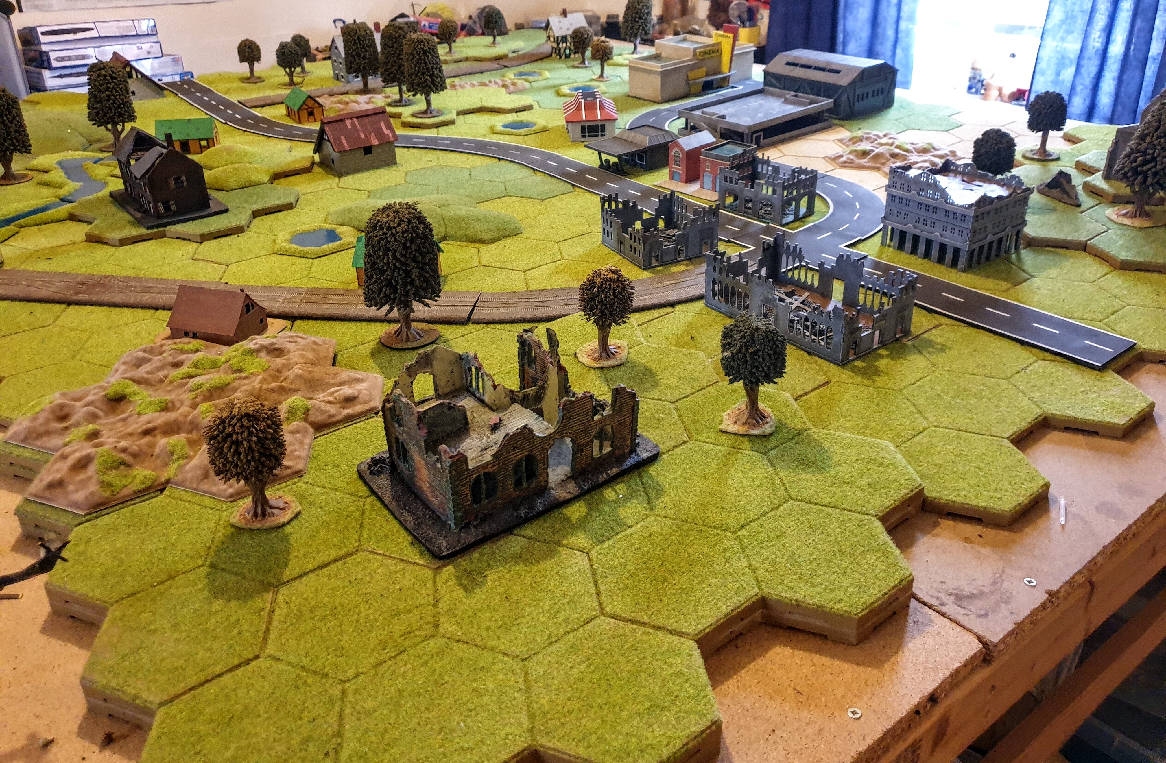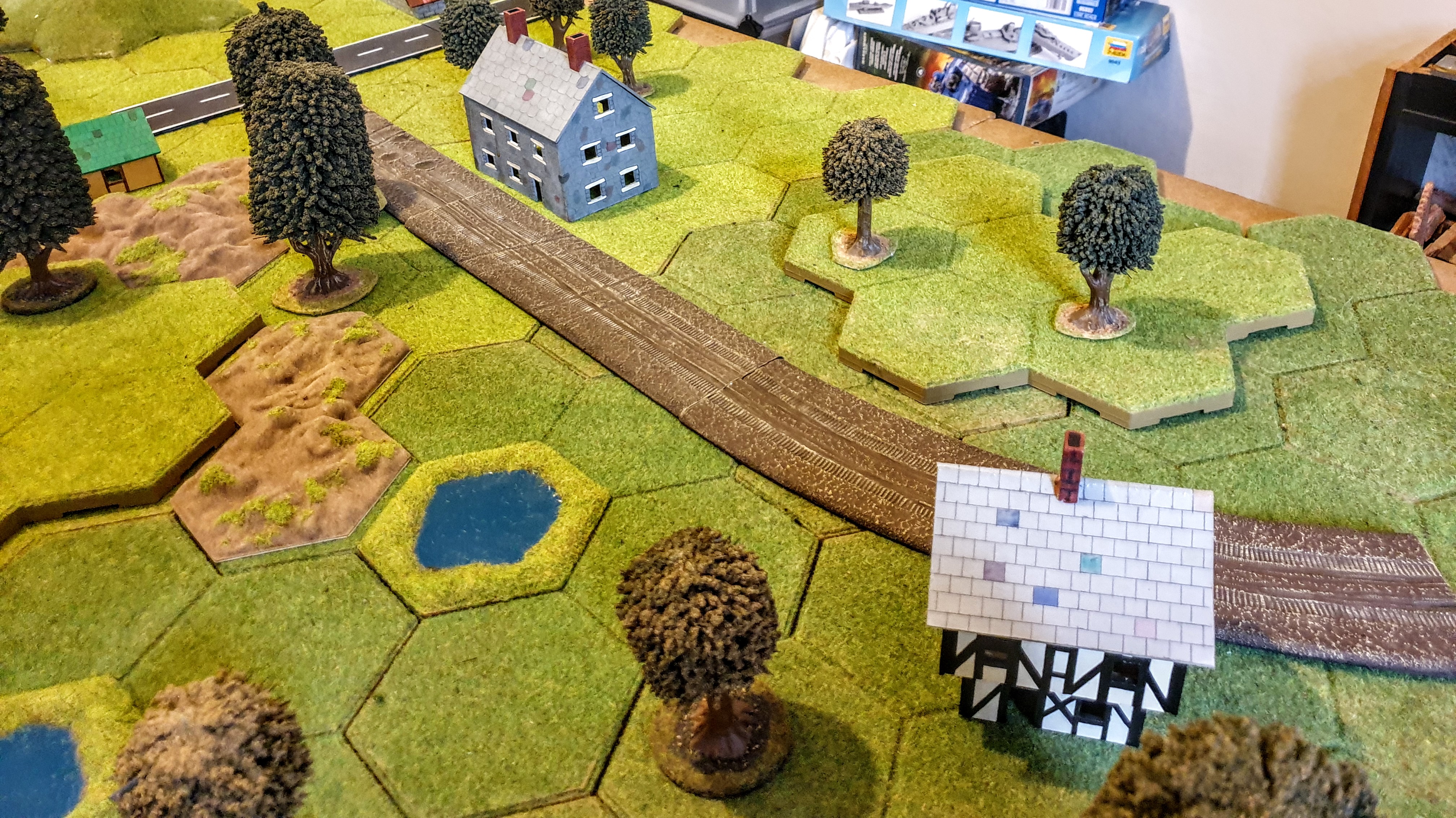 Side Road behind cover of woods and buildings but with line of sight to provide covering fire at range for central force.