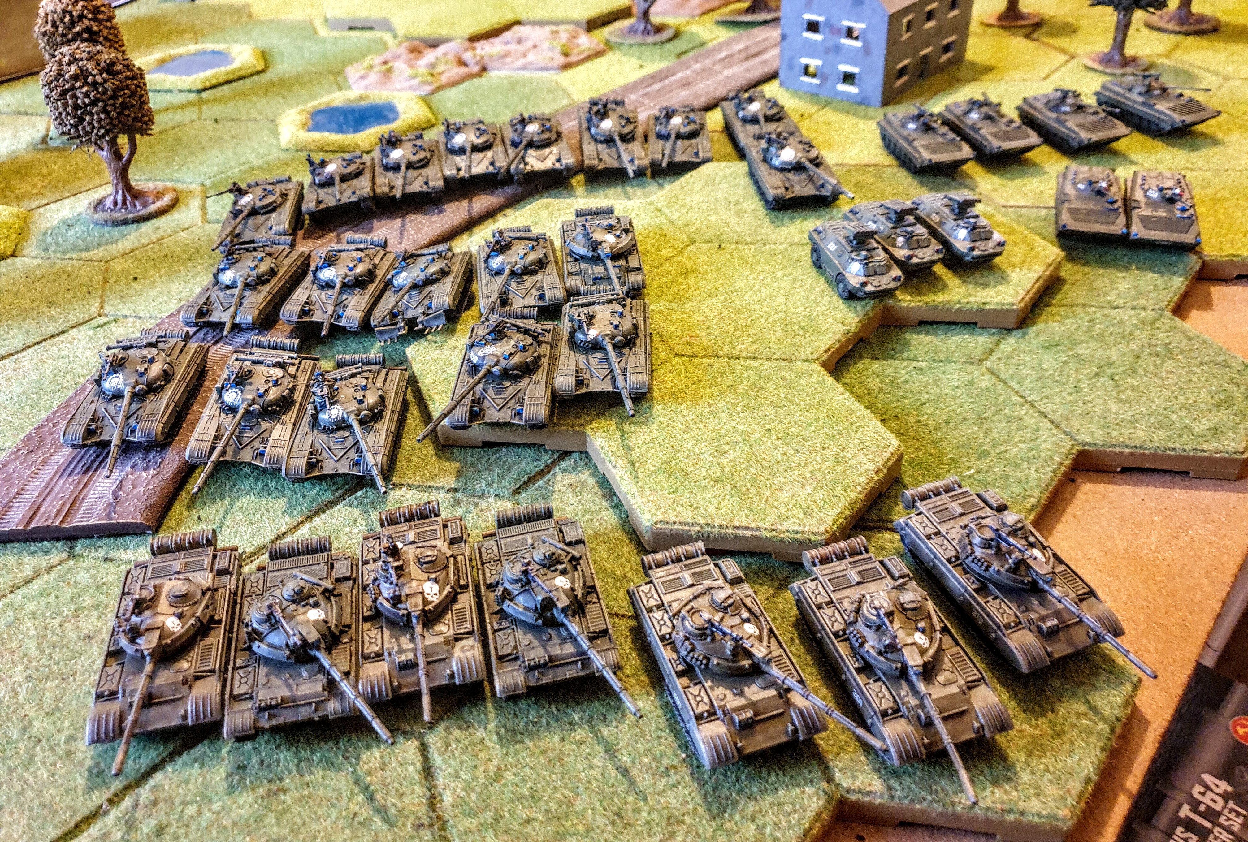 That was the last bit of shooting for the move. Col Keithsoloplos realising his cunning plan to use his weight of numbers to out shoot the Mercians ,was out the window, decided to charge on down the road hoping the T64’s will keep the M1A1HC’S busy enough for him to get into flanking positions once his left flank has dealt with the Mercian support units These units as was their commander were moving to block.