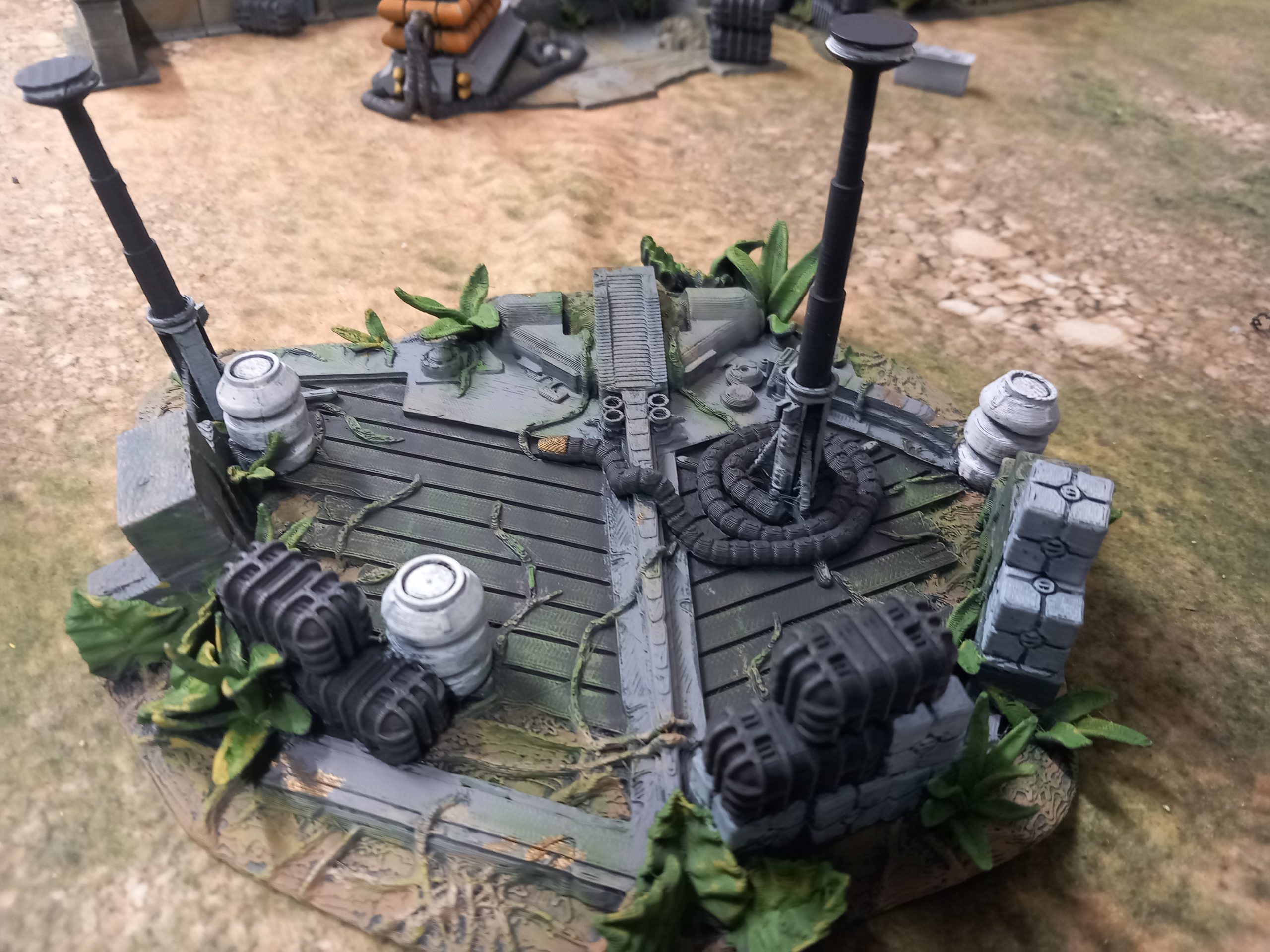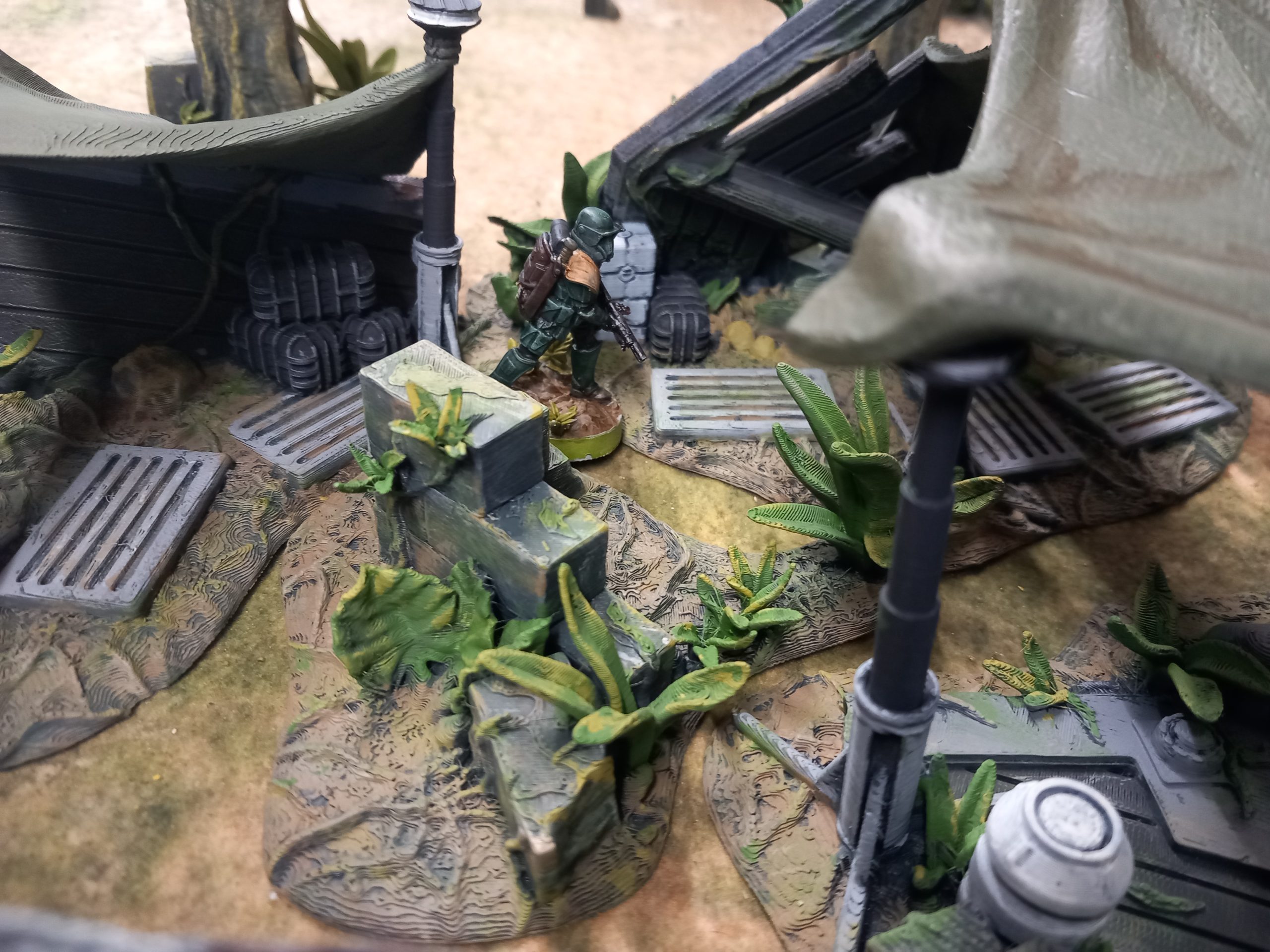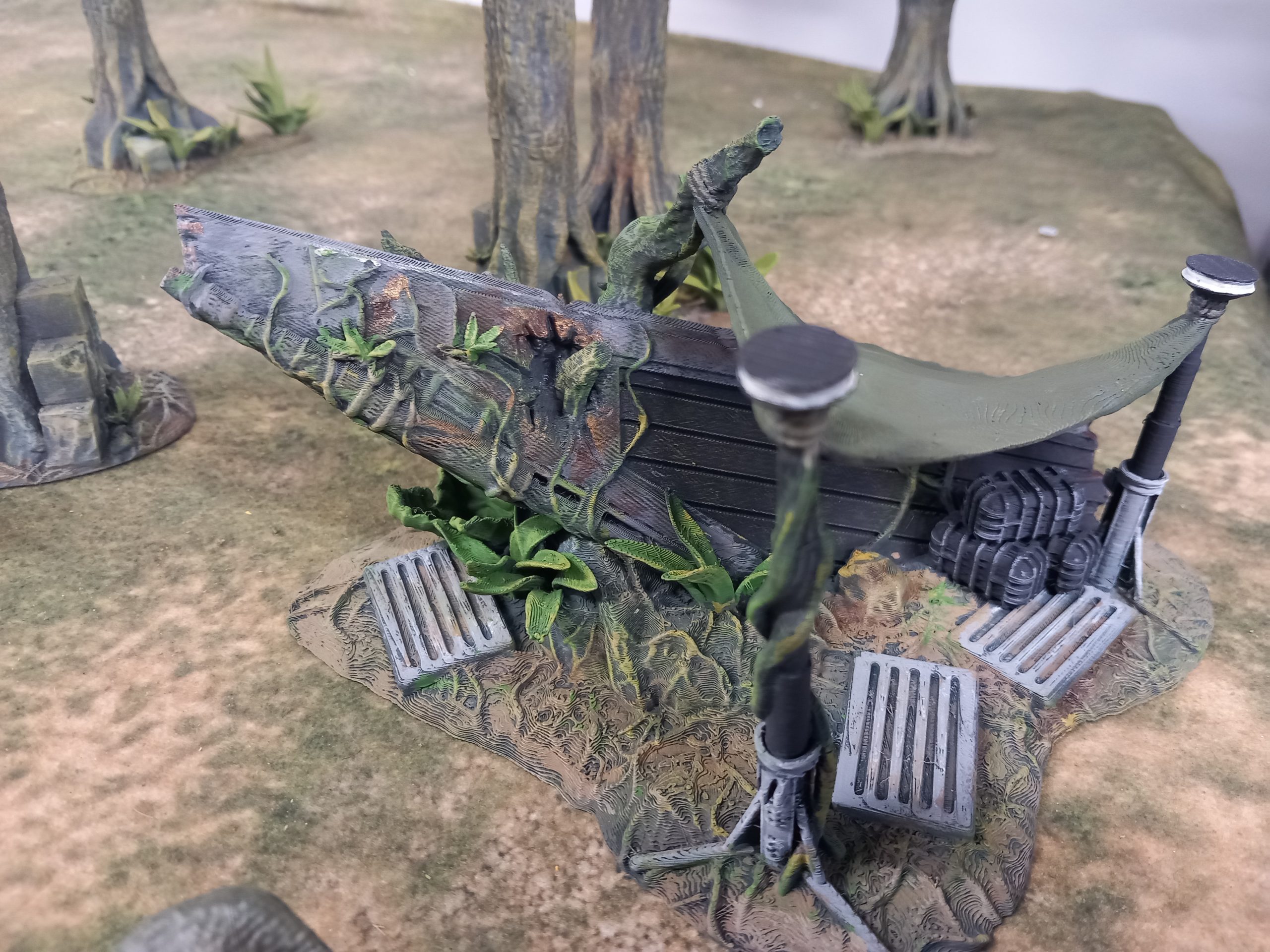 My jungle trees from David Sheff models are printed in clip together pieces so you can make them as tall or as short as you like with different branches or stumps. My taller trees are 16 inches high which makes them the tallest trees own. Bit of a task to paint each leaf. I could print out more to make a dense table but they might be hard to play aroundMaking it square