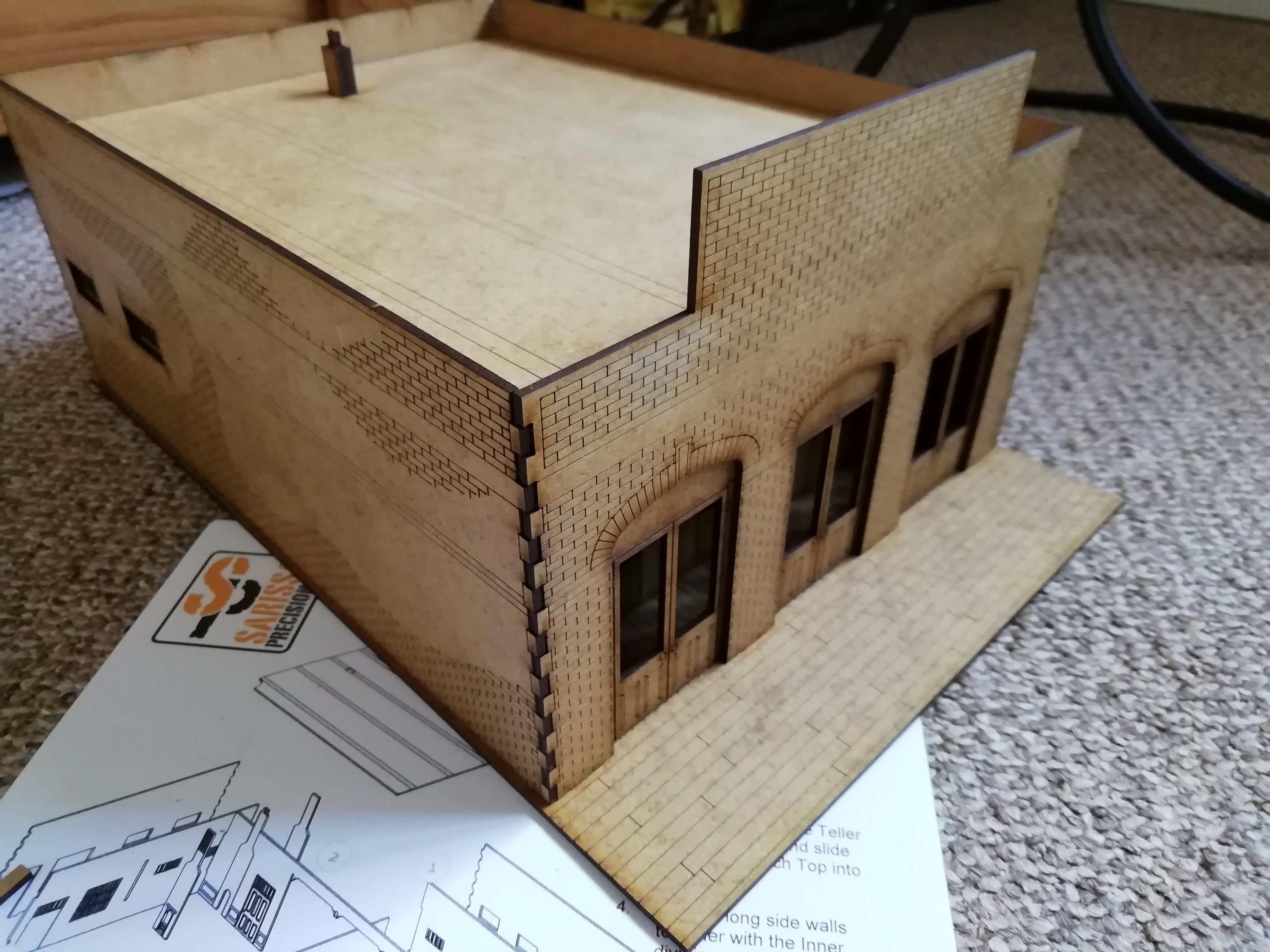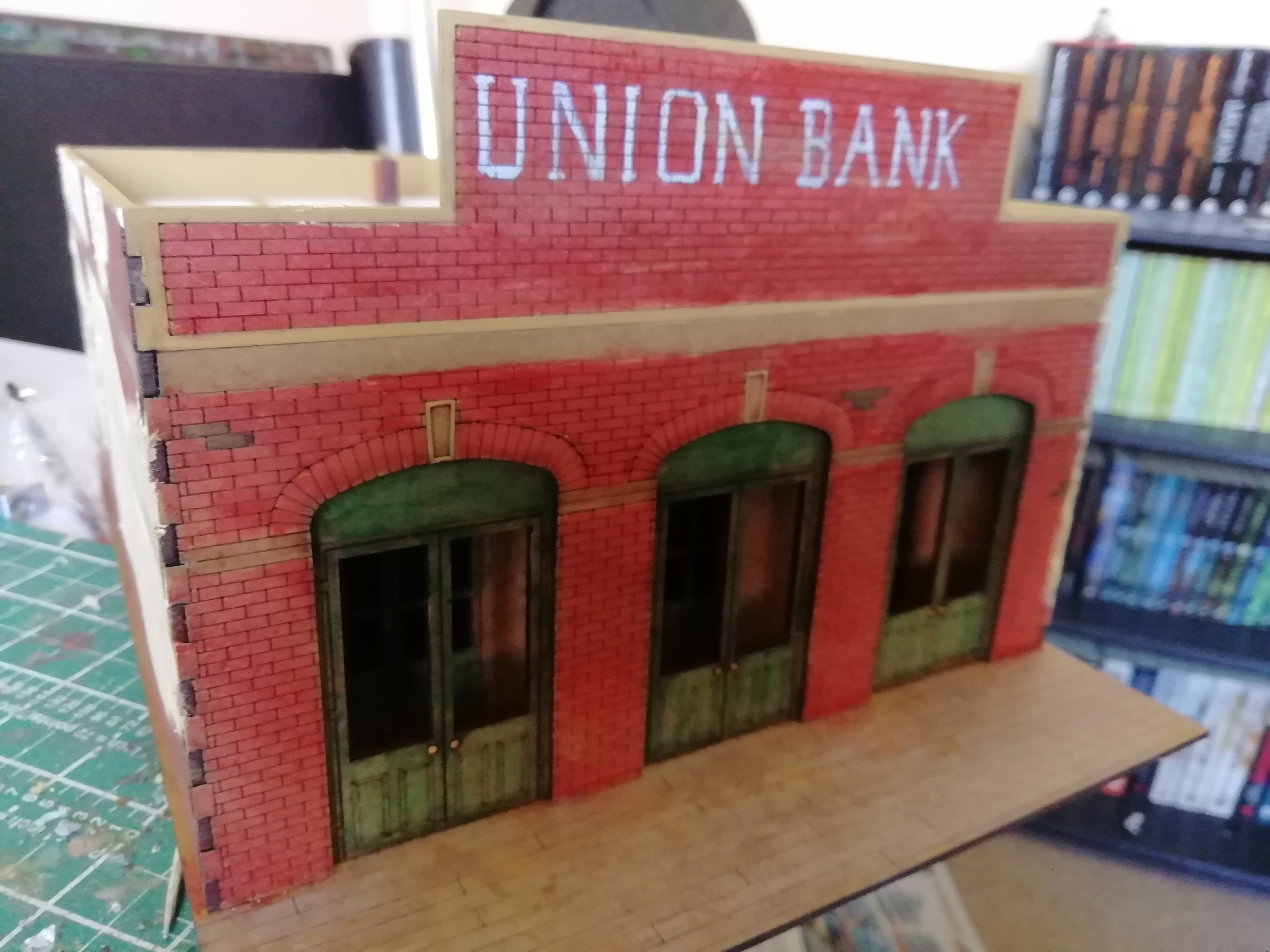 To break up the sharp laser cut lines I drew over some of the lines of planking. I used a dark crayon with a light grey just above to create a wooden effect. After doing all the walls I thought I might go back to my other buildings because I like the result.