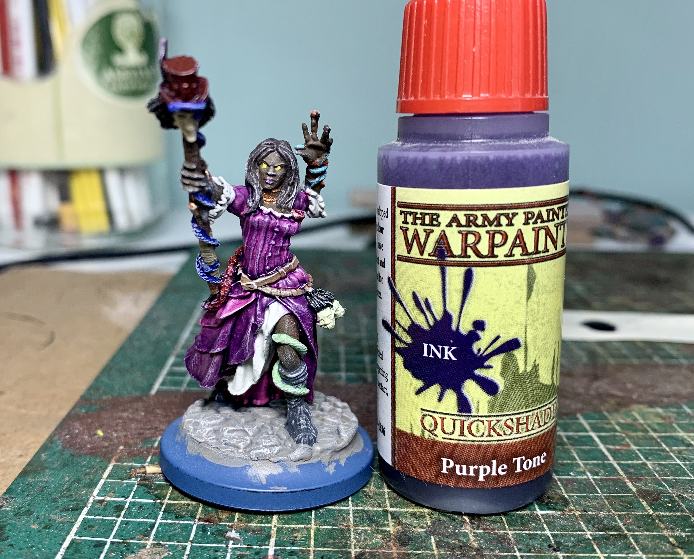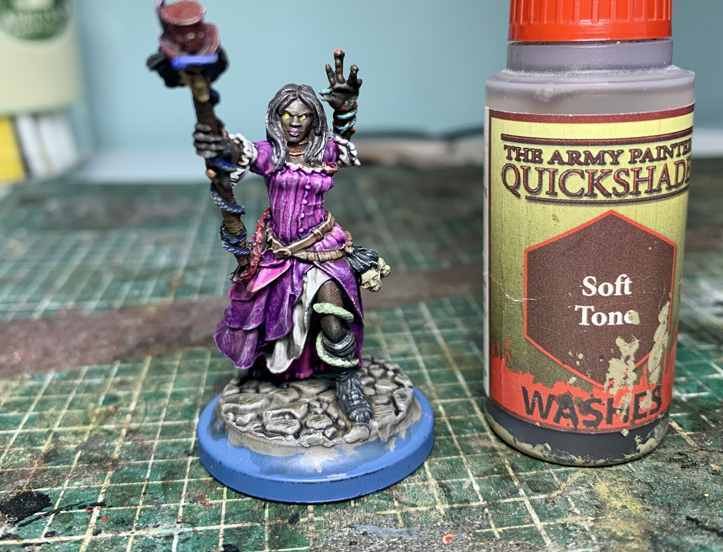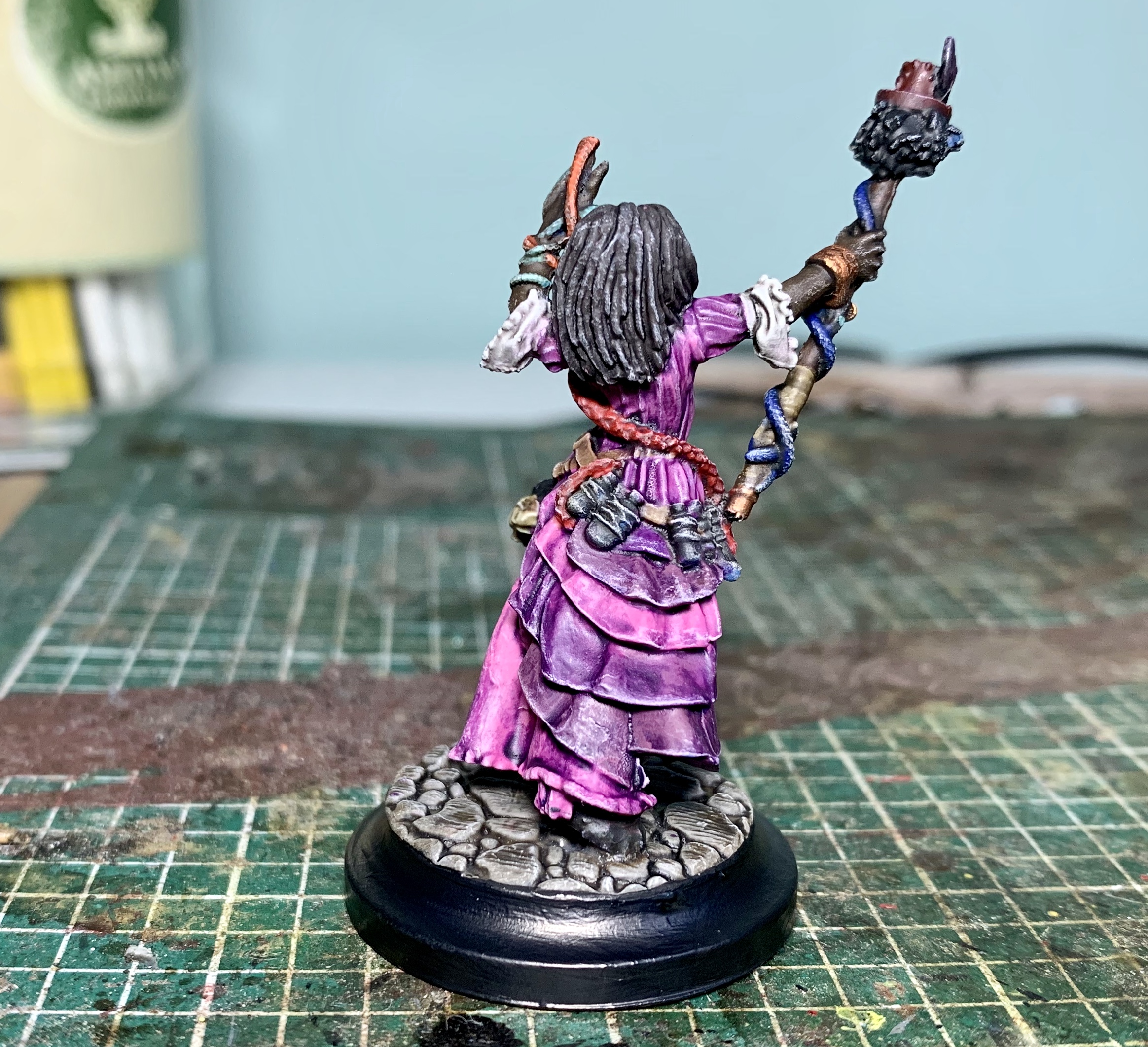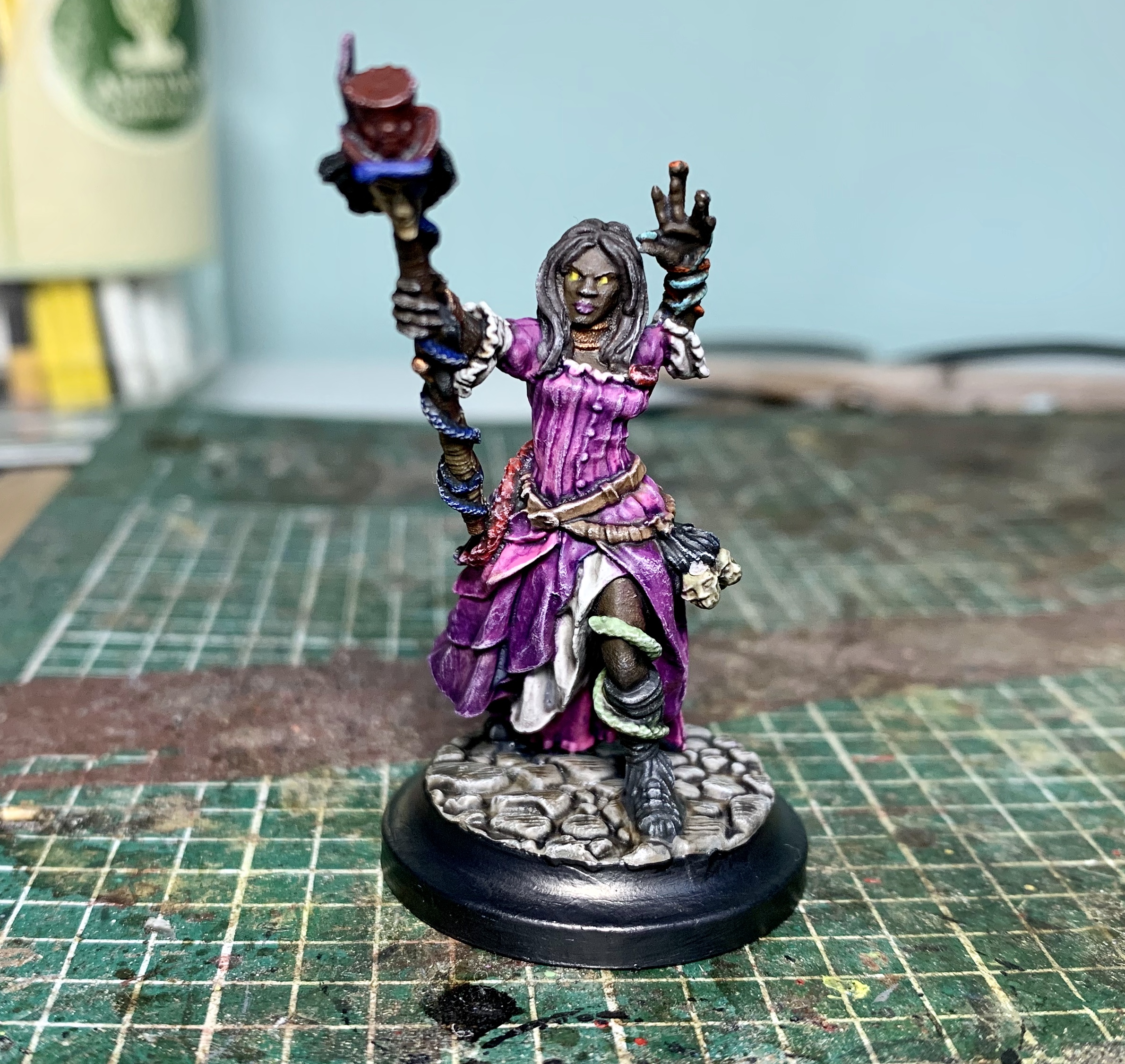 Hot on the heels of Cleo, its the lithe witch with the crazy staff, Zora. FYI the skin colour is Vallejo Chocolate brownI forgot to take a picture of the brain matter beige drybrush step but there was one! Then it’s washed. 50/50 dark tone and medium on everything bar The purple and then purple tone on the purple and then a soft tone on everything bar the Warlock purple