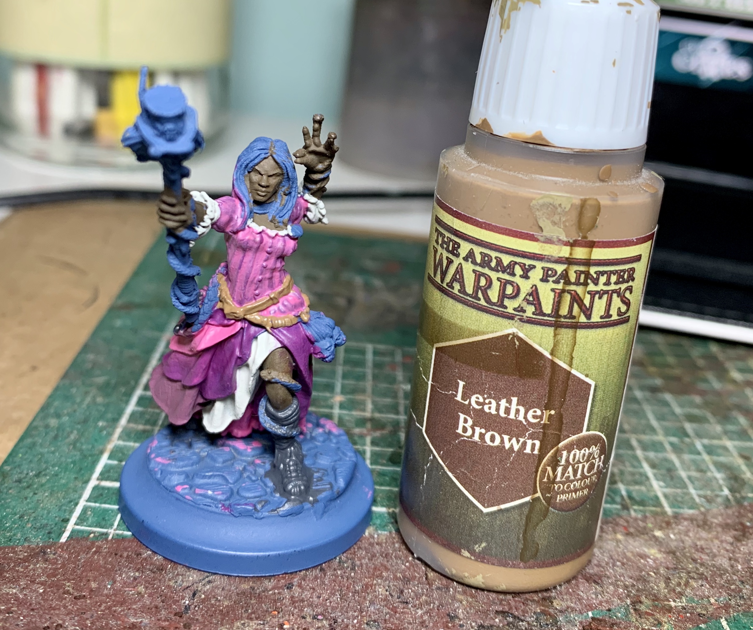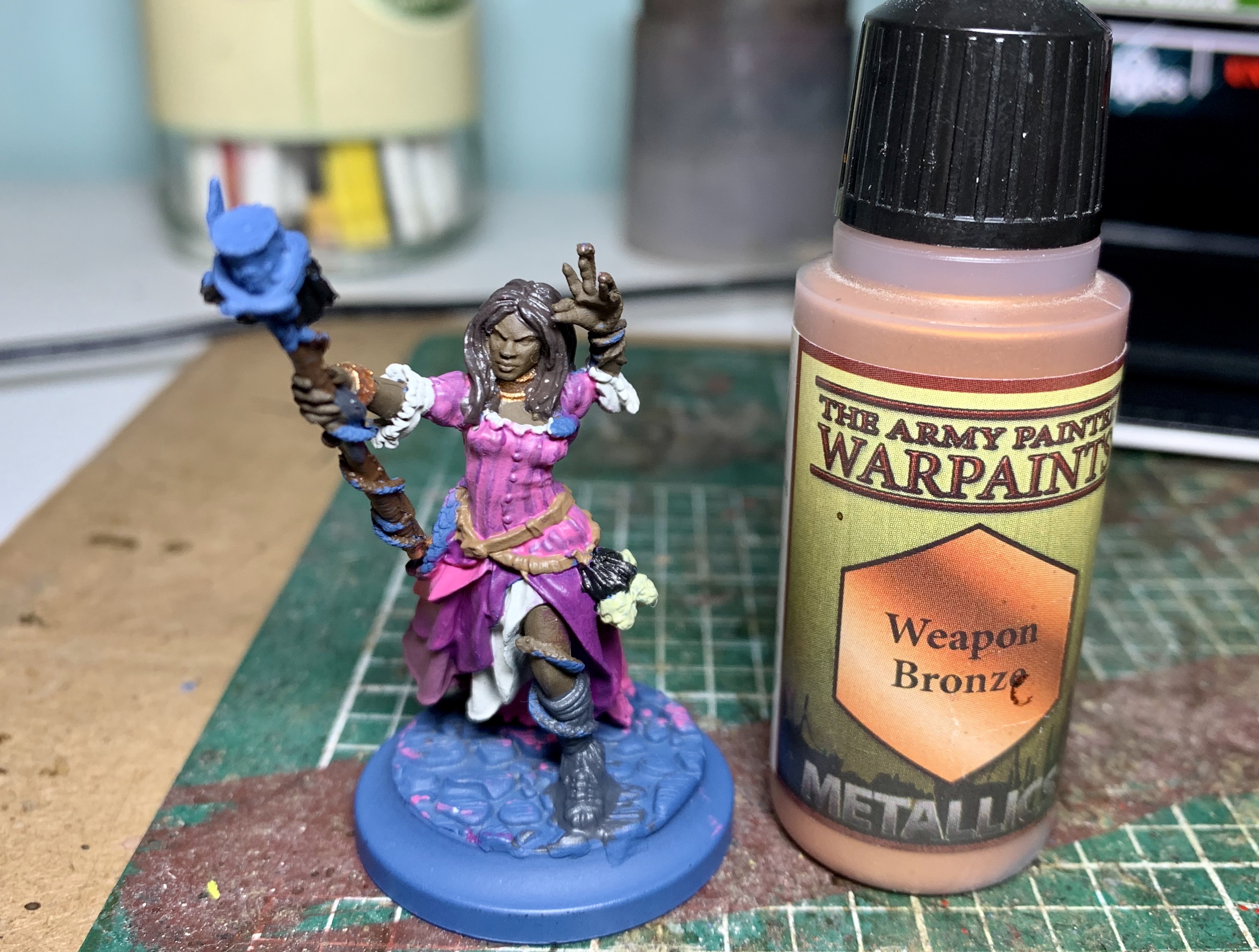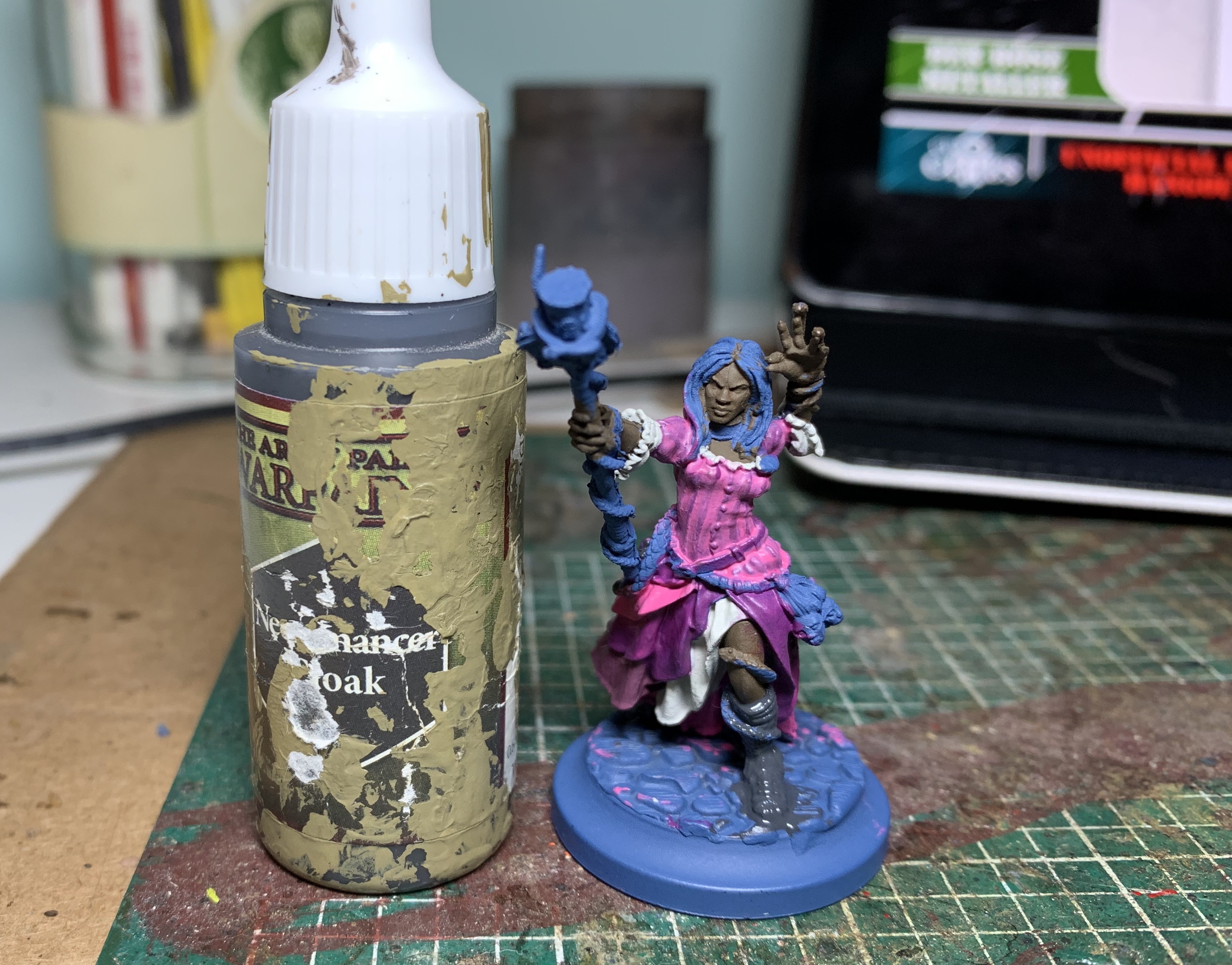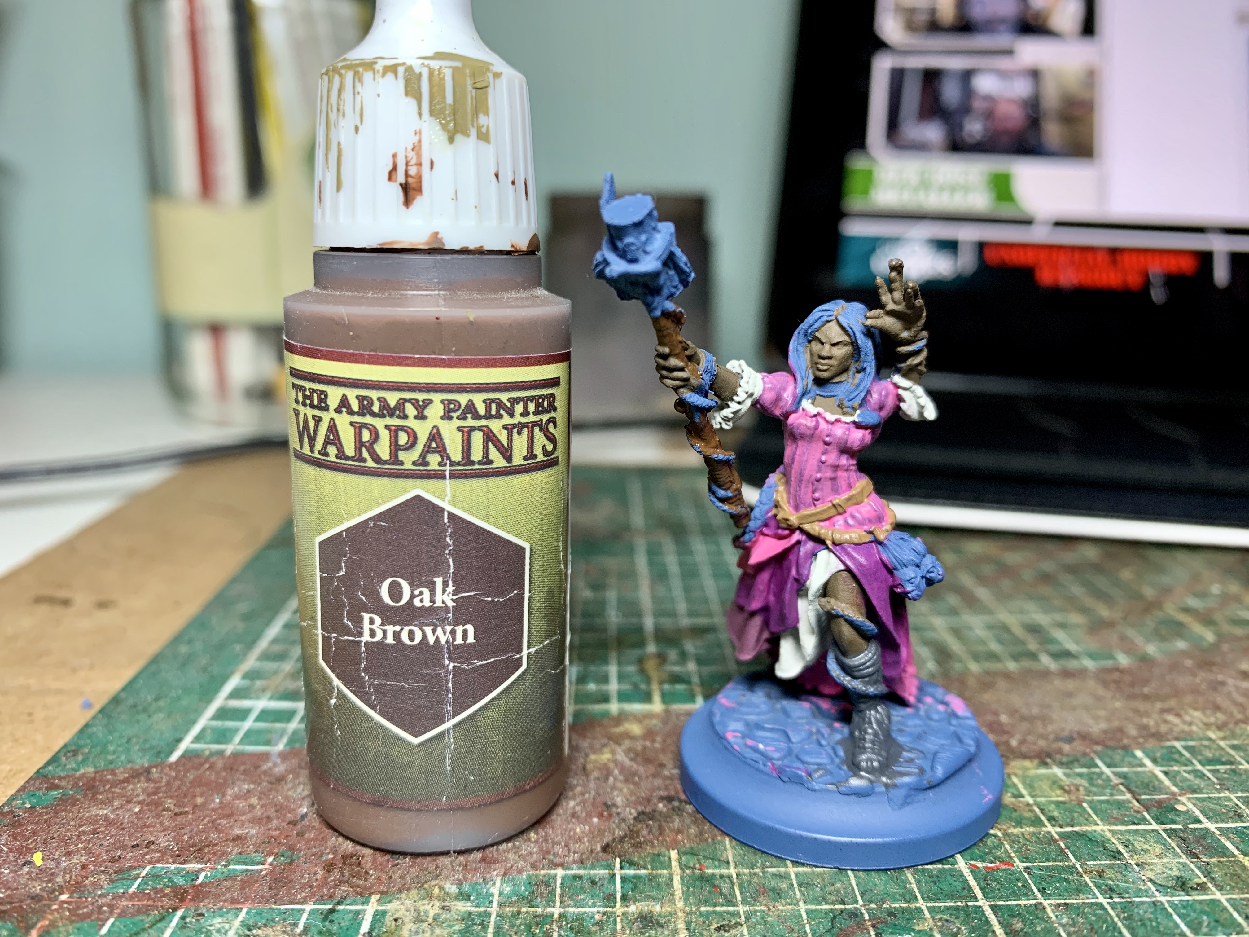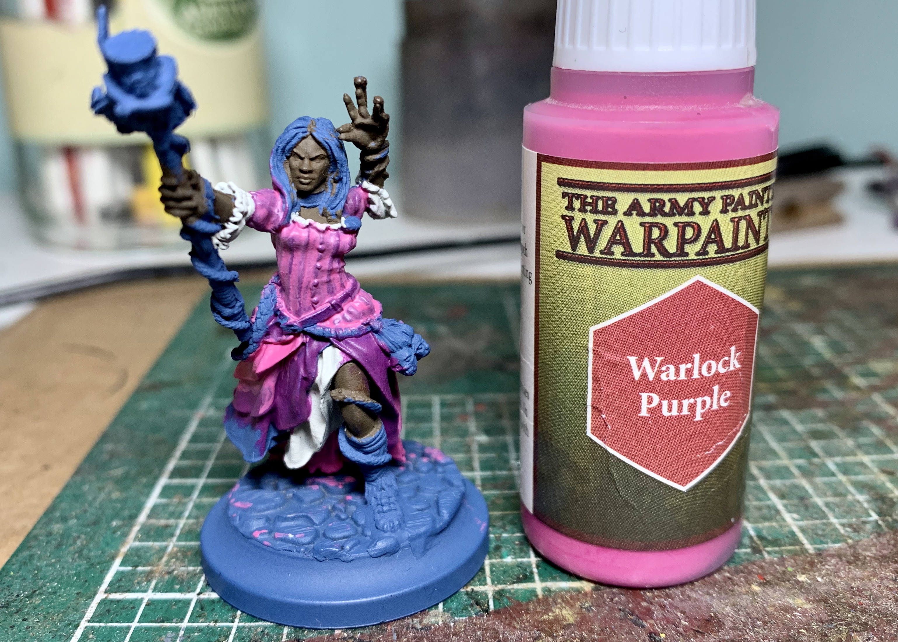 Hot on the heels of Cleo, its the lithe witch with the crazy staff, Zora. FYI the skin colour is Vallejo Chocolate brownI forgot to take a picture of the brain matter beige drybrush step but there was one! Then it’s washed. 50/50 dark tone and medium on everything bar The purple and then purple tone on the purple and then a soft tone on everything bar the Warlock purple