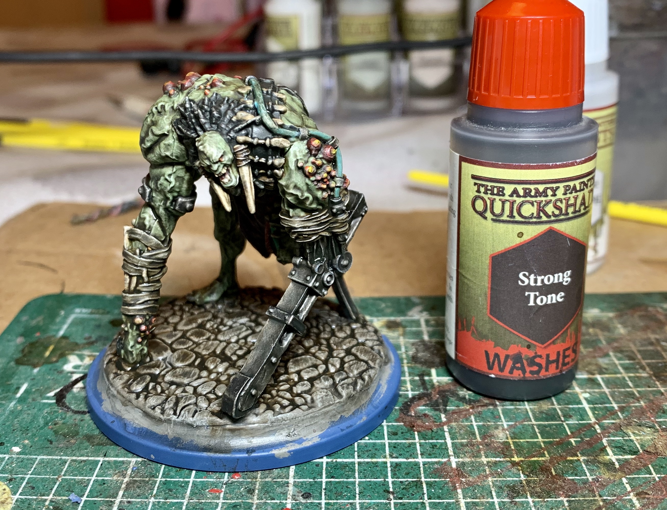 Next up I’ll be using army painter tones and washes to calm the drybrush down. Red on the coat and hat, dark tone on the skin and trousers then a 50/50 medium and dark tone mix followed by an undiluted soft tone on the bone areas