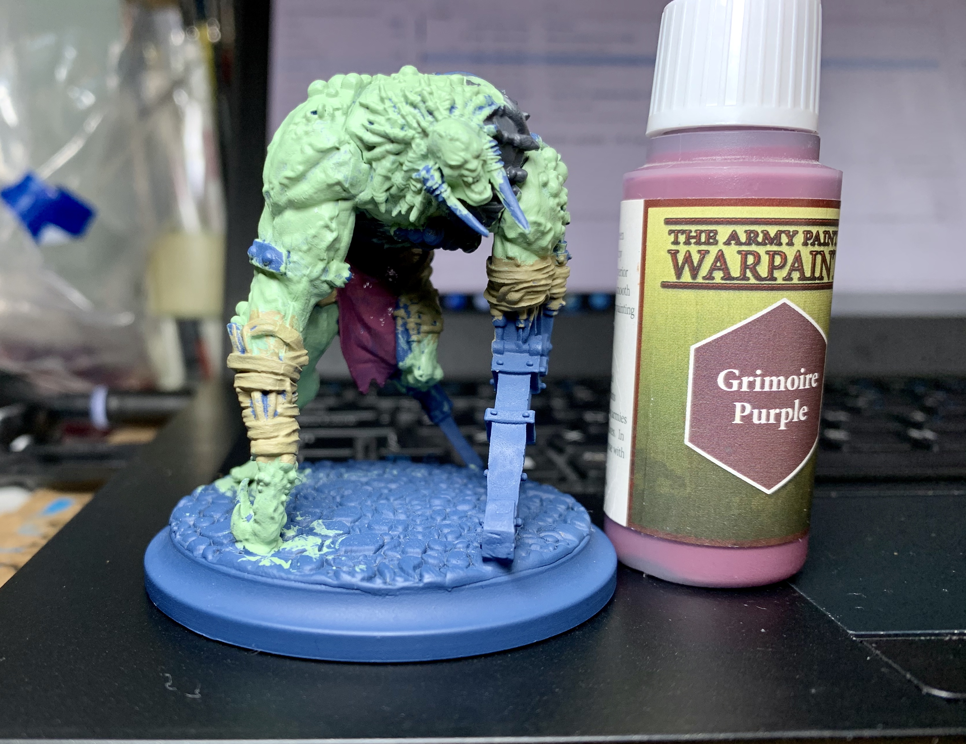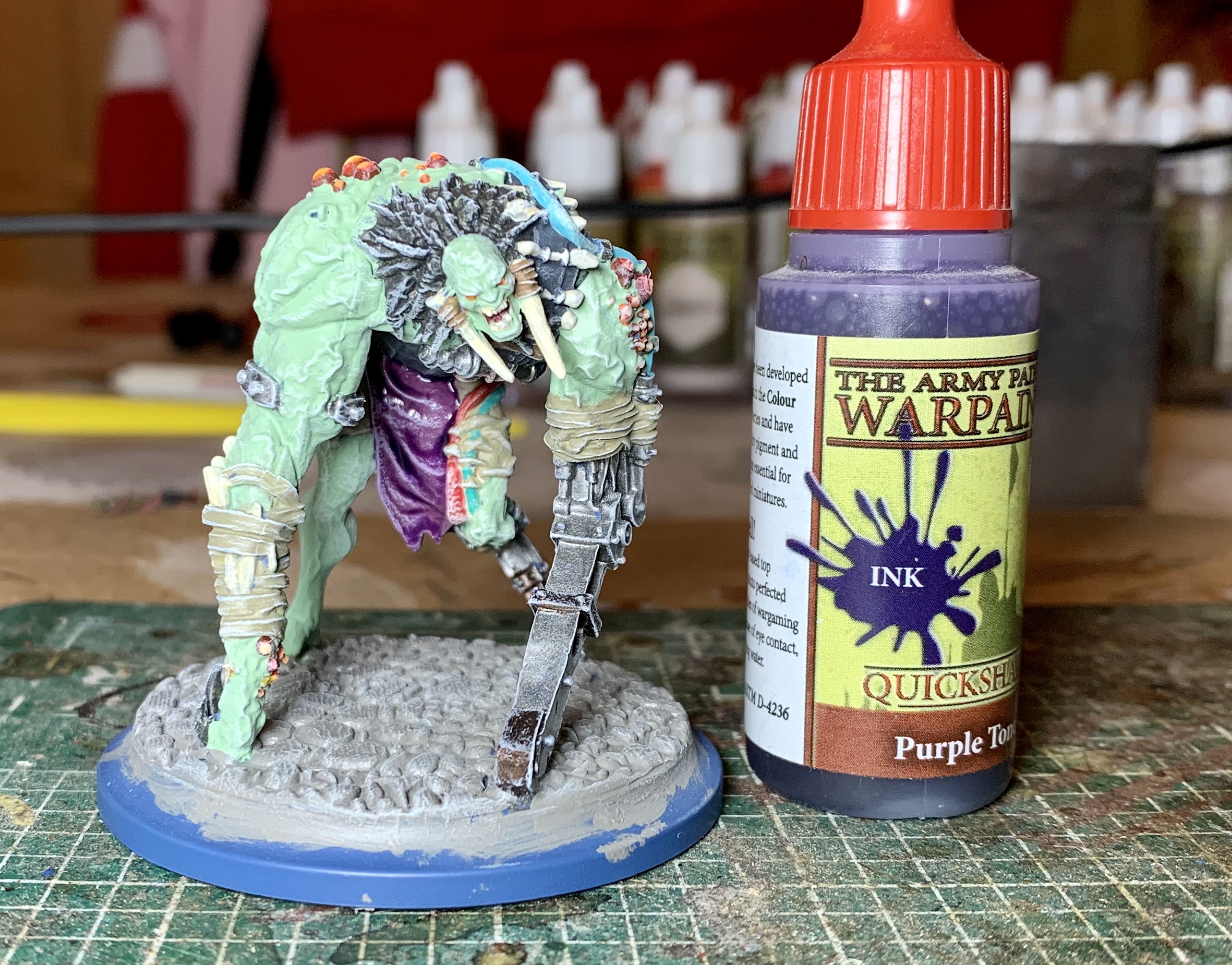 Now it’s time to tone the drybrush down with some washes, purple on the purples, 50/50 dark tone and wash medium on the rest. Then in with a soft tone on the ropes and bones etc. Avoid the bright purple as it’s makes it look dirty.