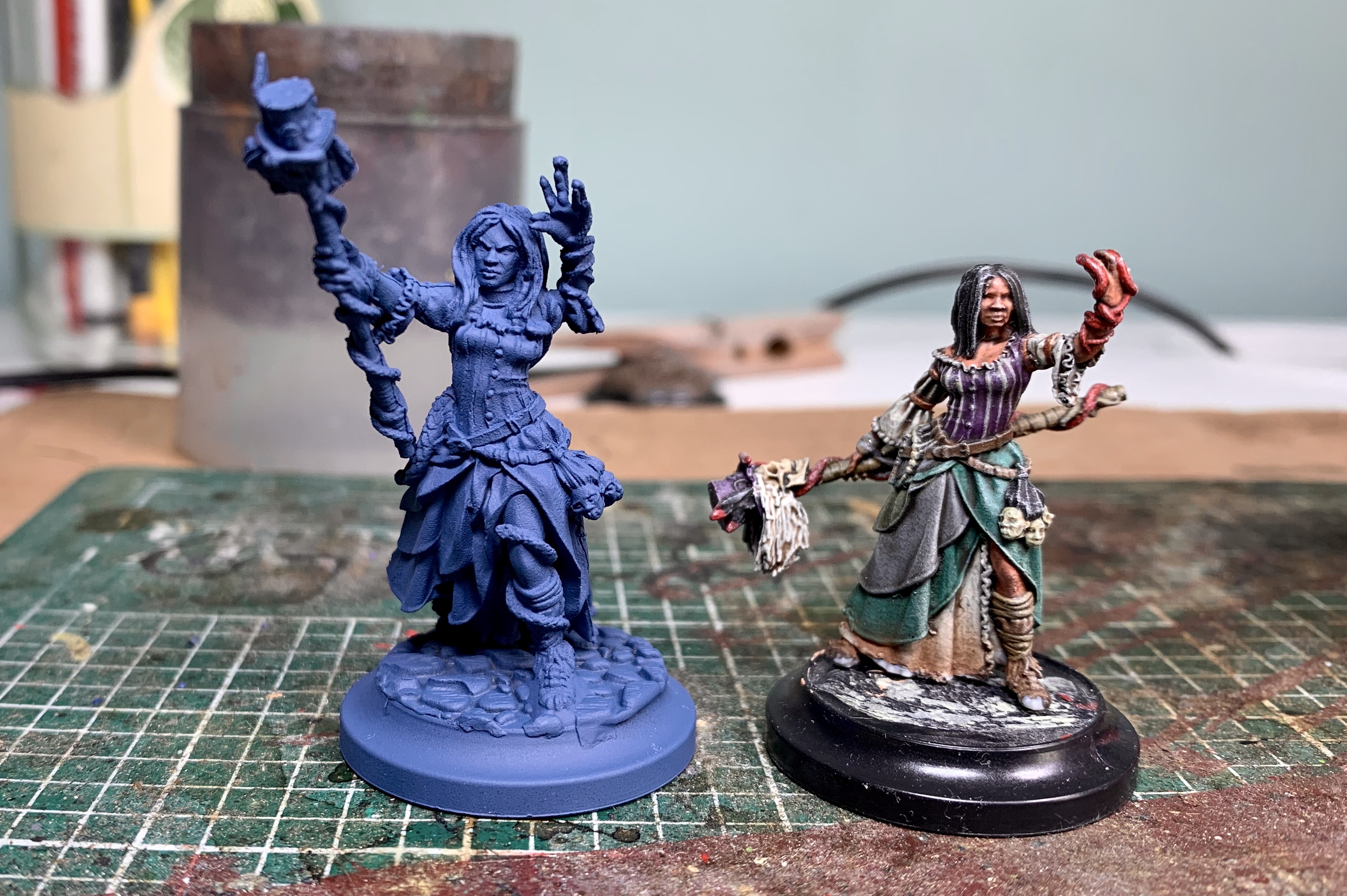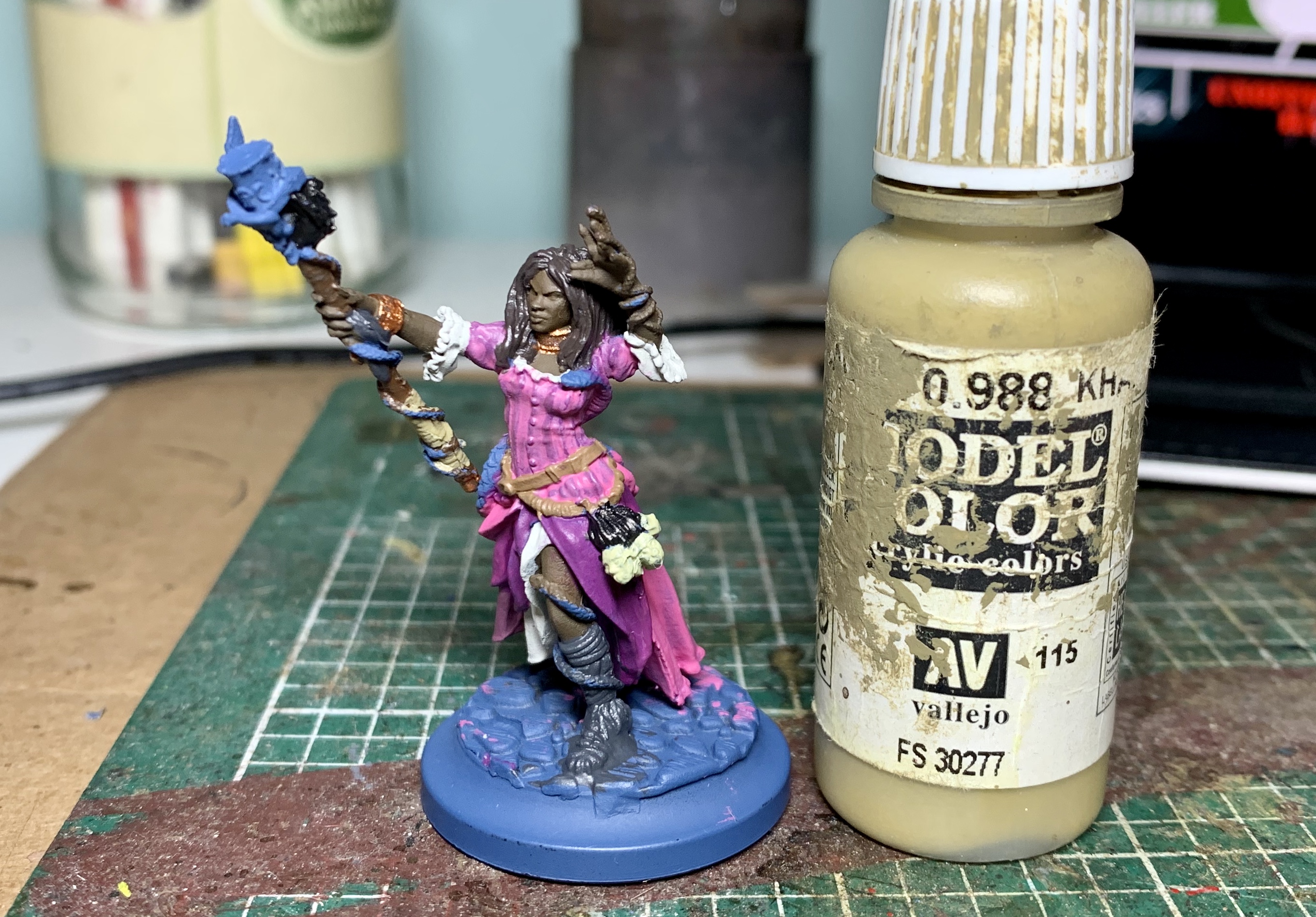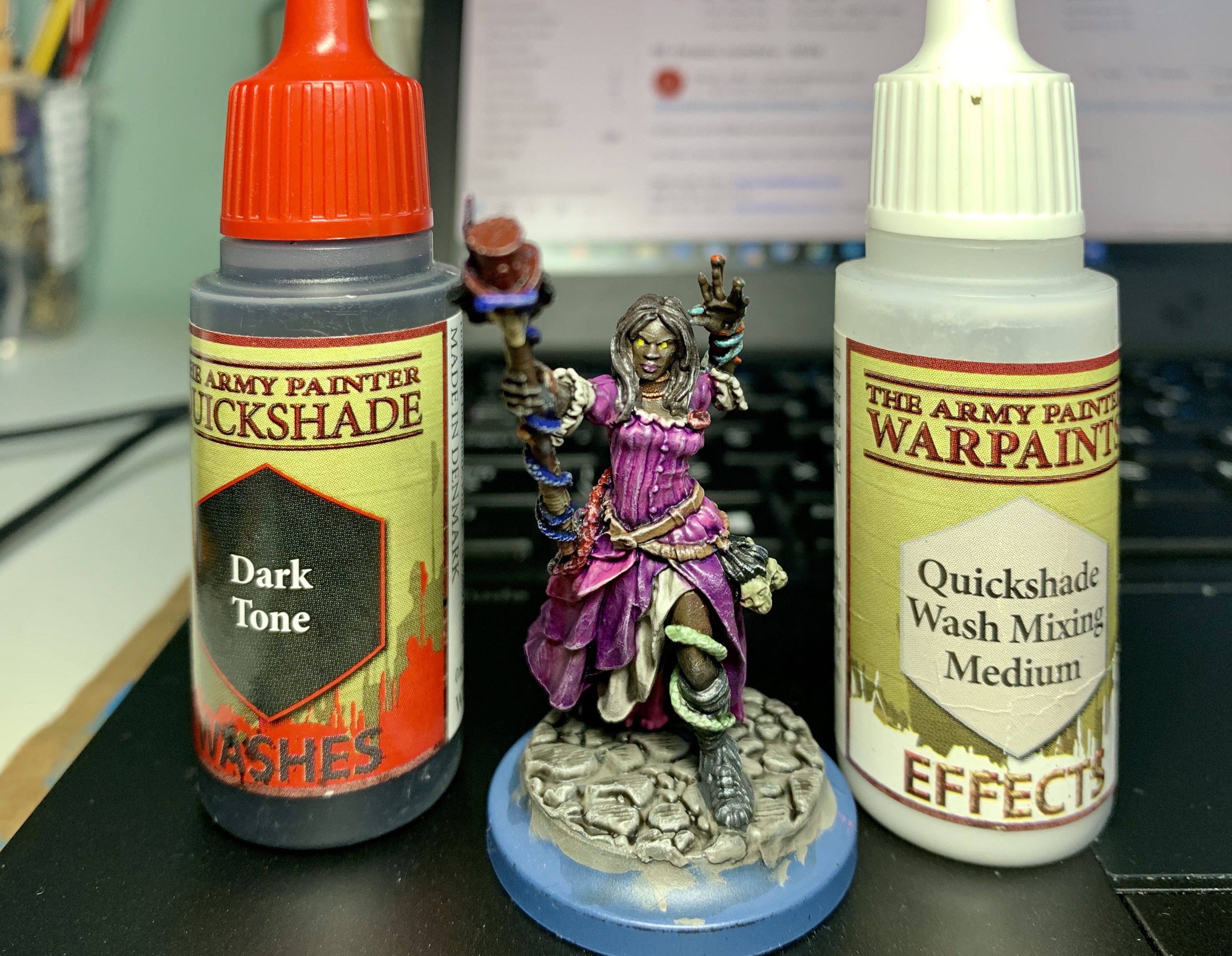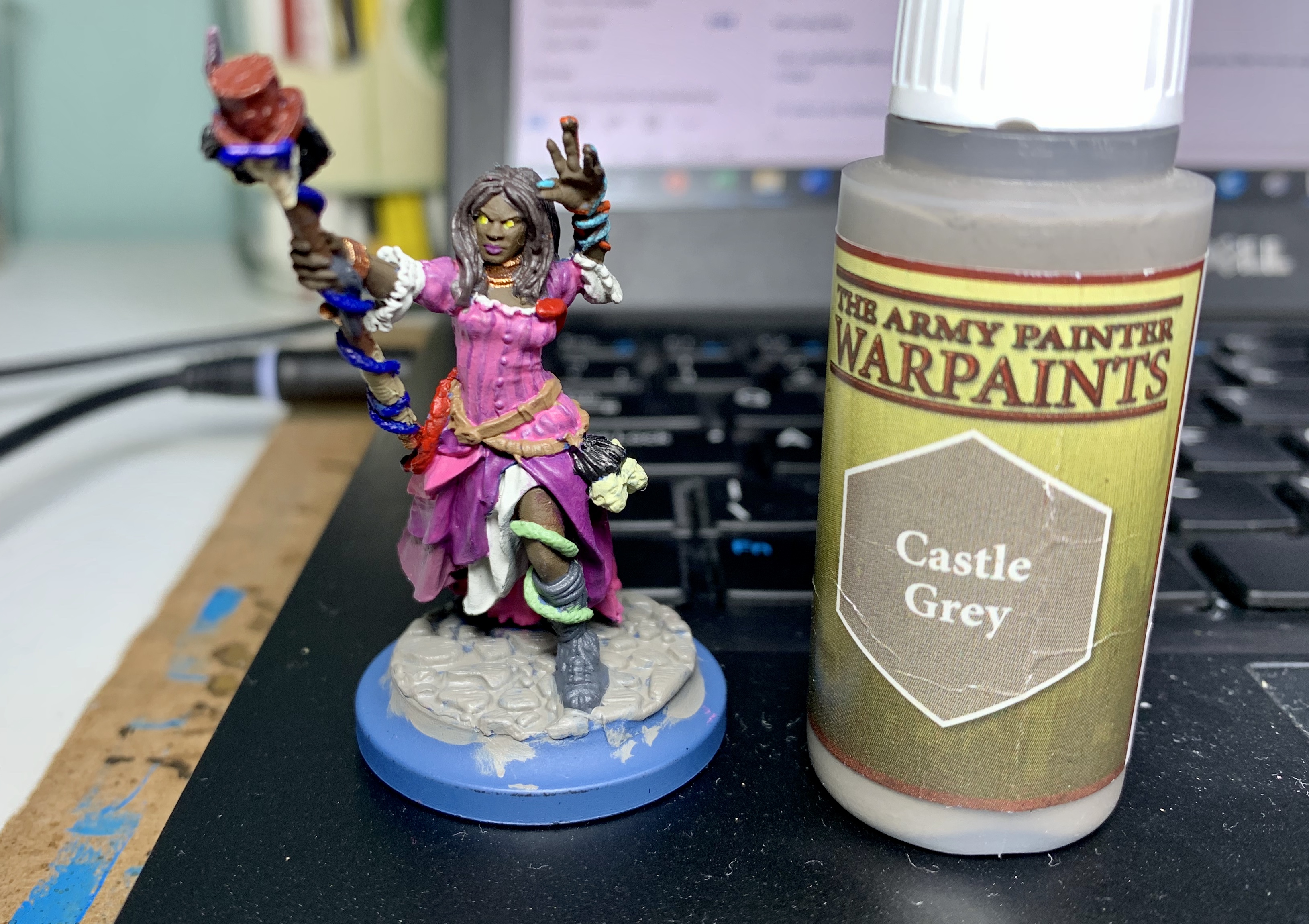 Just as I thought I was finished I remembered I’d left the crow off of the end of her staff! With such a slender connection I knew the drybrush step would snap it so I’ll paint separately and attach. Just a black paint, drybrush and dark tone should suffice!