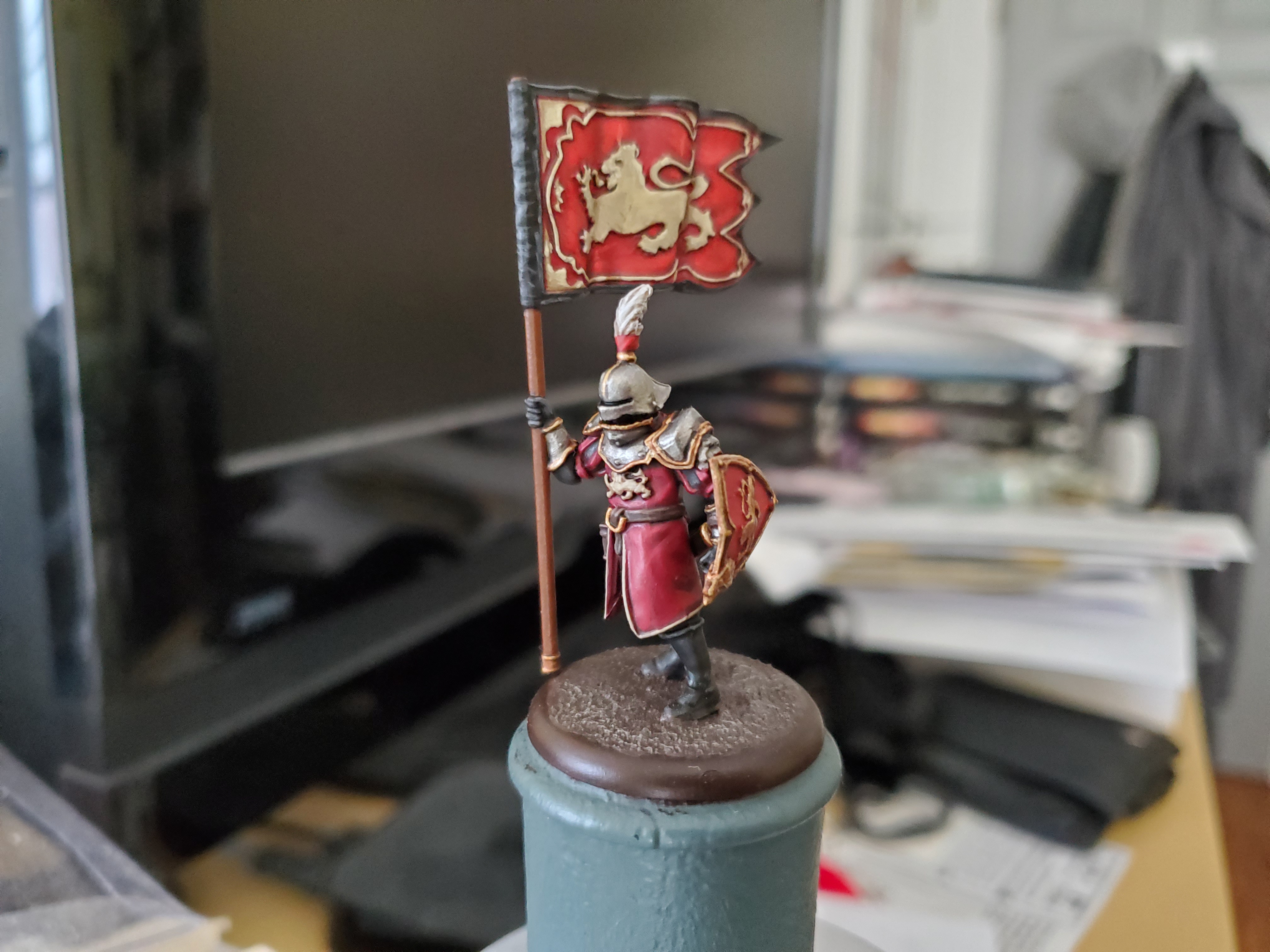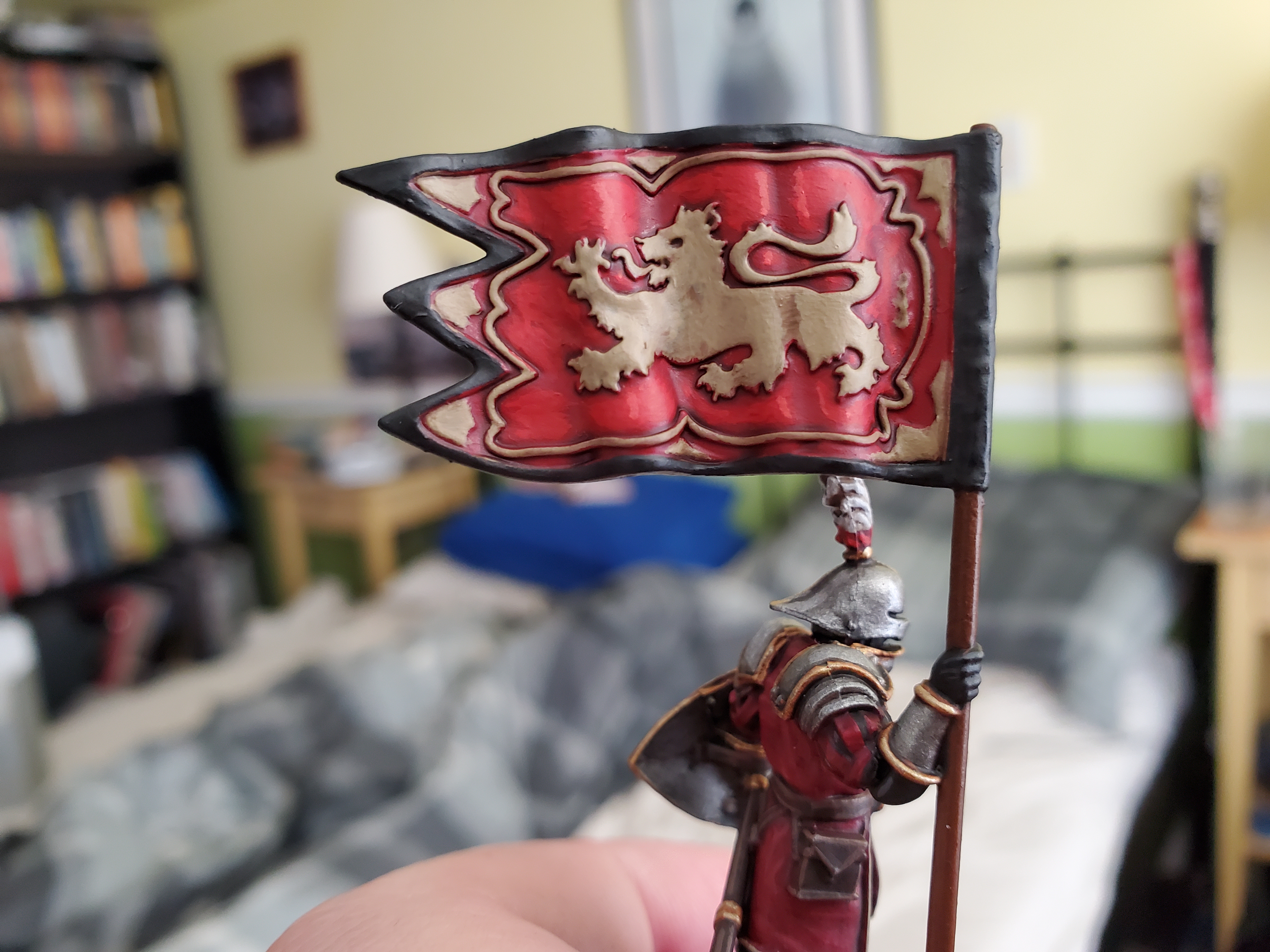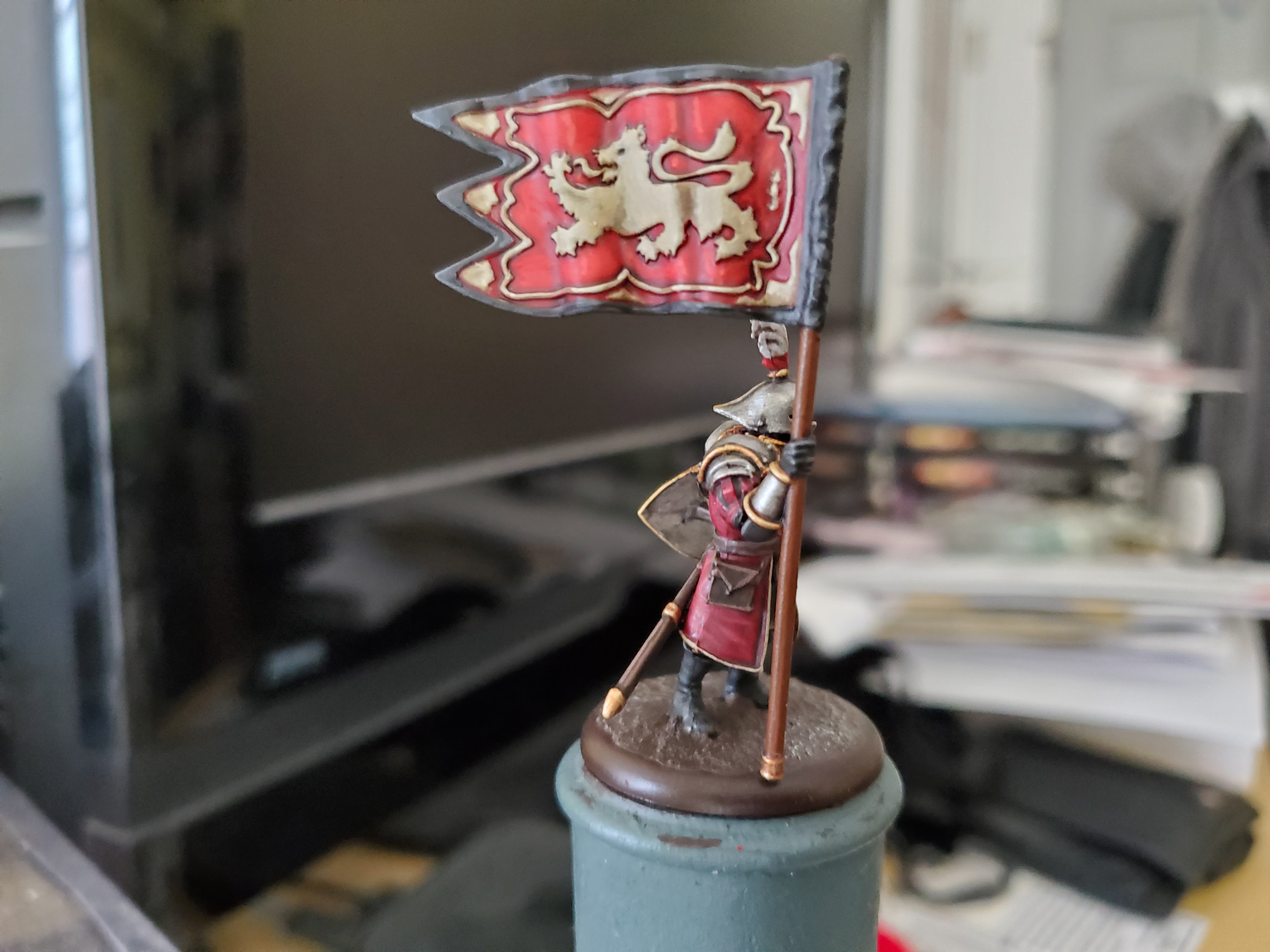 Having issues posting groups of images...so this will have to do for now. Much the same process on the lion and trim of the banner. For brightness I layered up with Ushabti Bone......In arduis fidelis