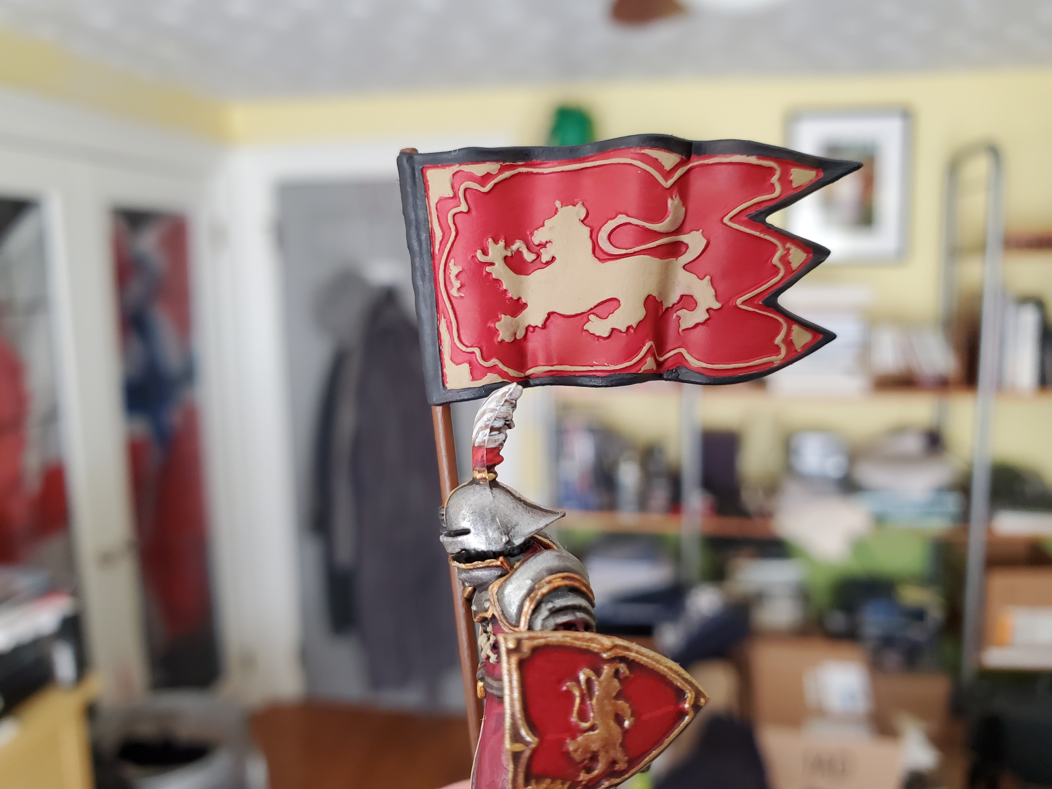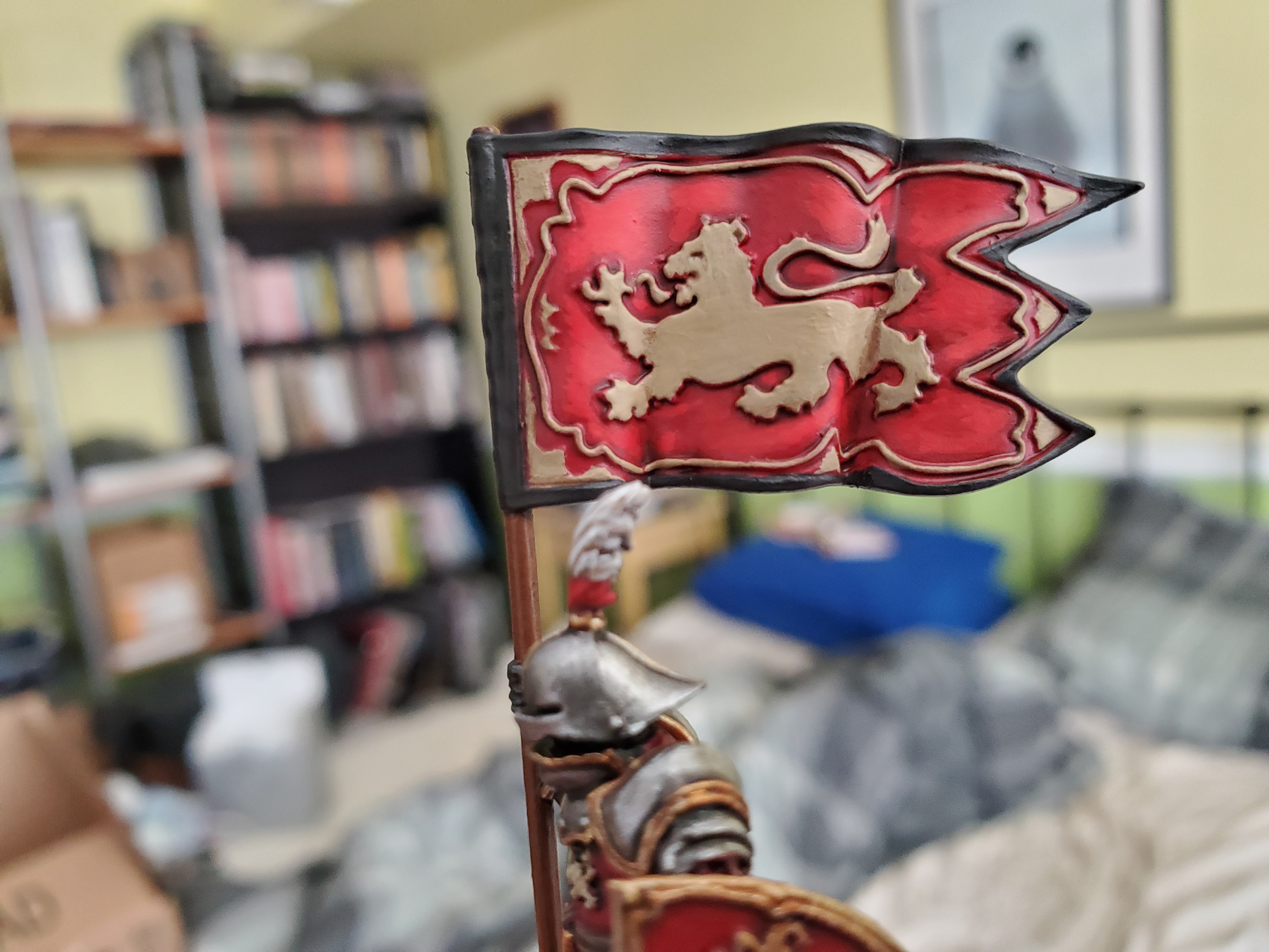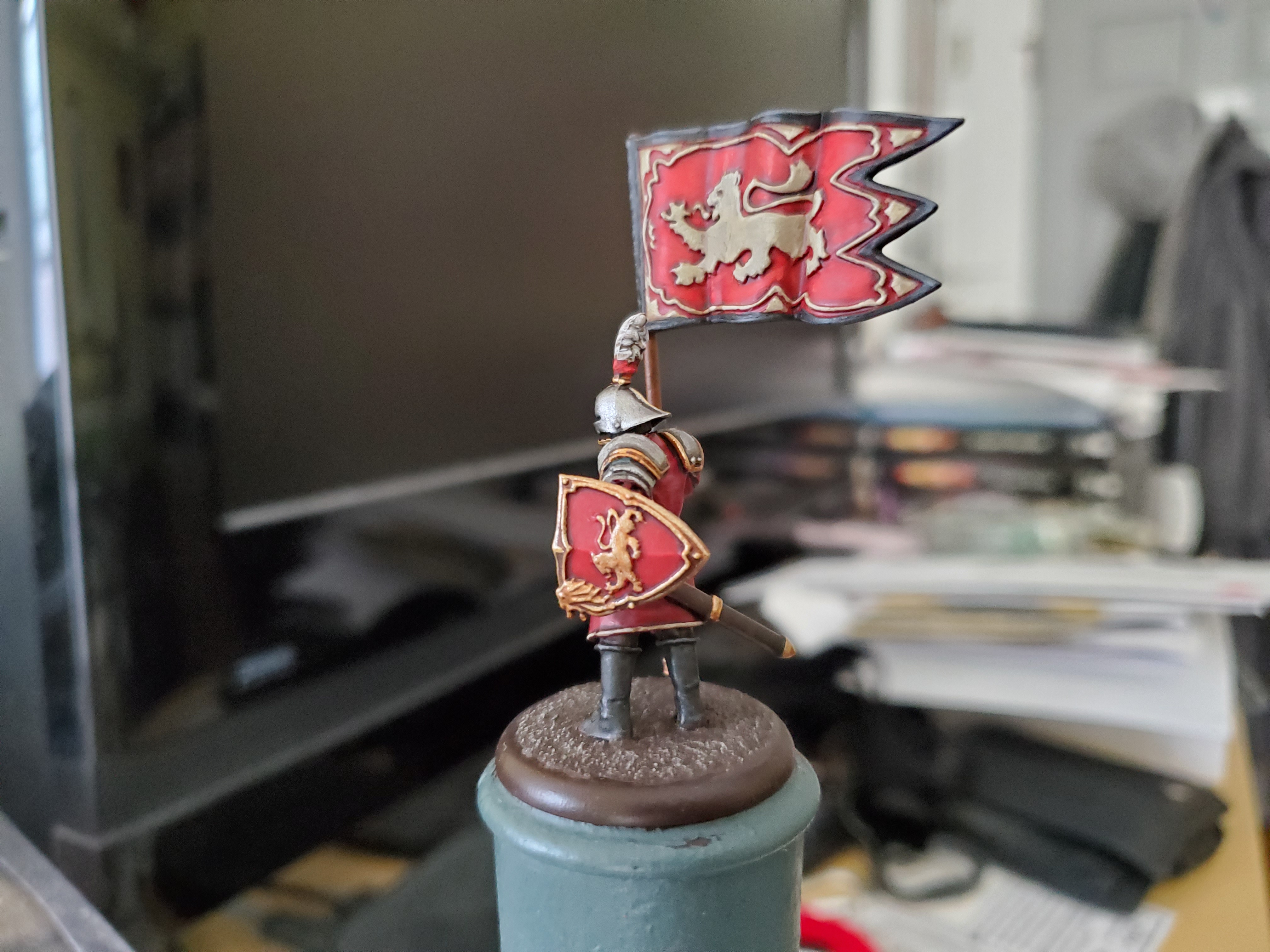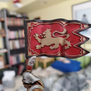Having issues posting groups of images...so this will have to do for now. Much the same process on the lion and trim of the banner. For brightness I layered up with Ushabti Bone......In arduis fidelis