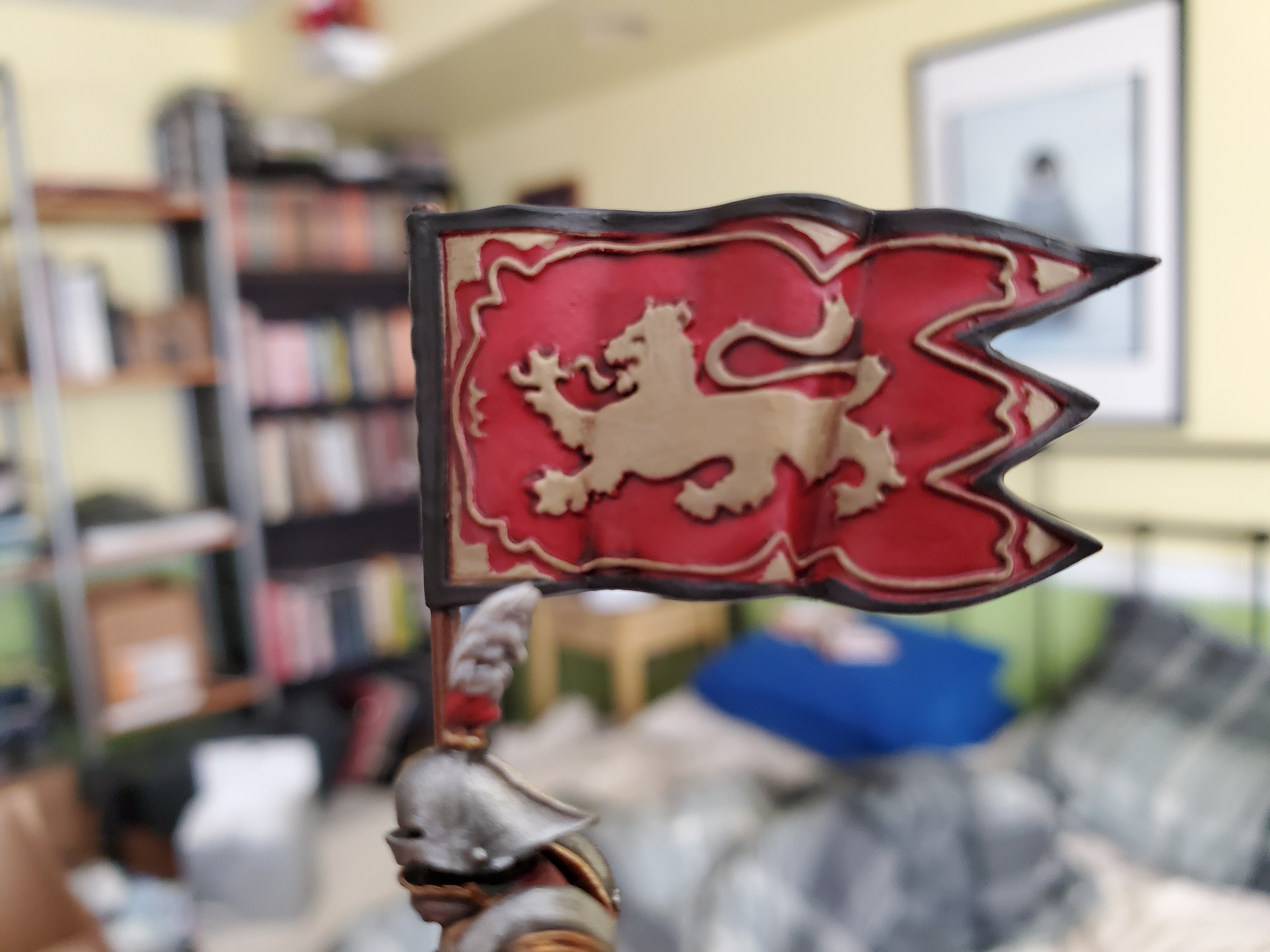 And lo, the banner was done! Sculpted banners are great for making it clear where the shadows should be, but smooth folds in the cloth can be a pain to highlight. Anyway, I have plenty of step-by-steps this time though the method I used did follow a similar pattern to Duncan’s guide and could easily be simply added to the various stages. All of the colours I used were used across the rest of the Guardsman so no extra fancy colours to worry about! Let’s get on with it, shall we?