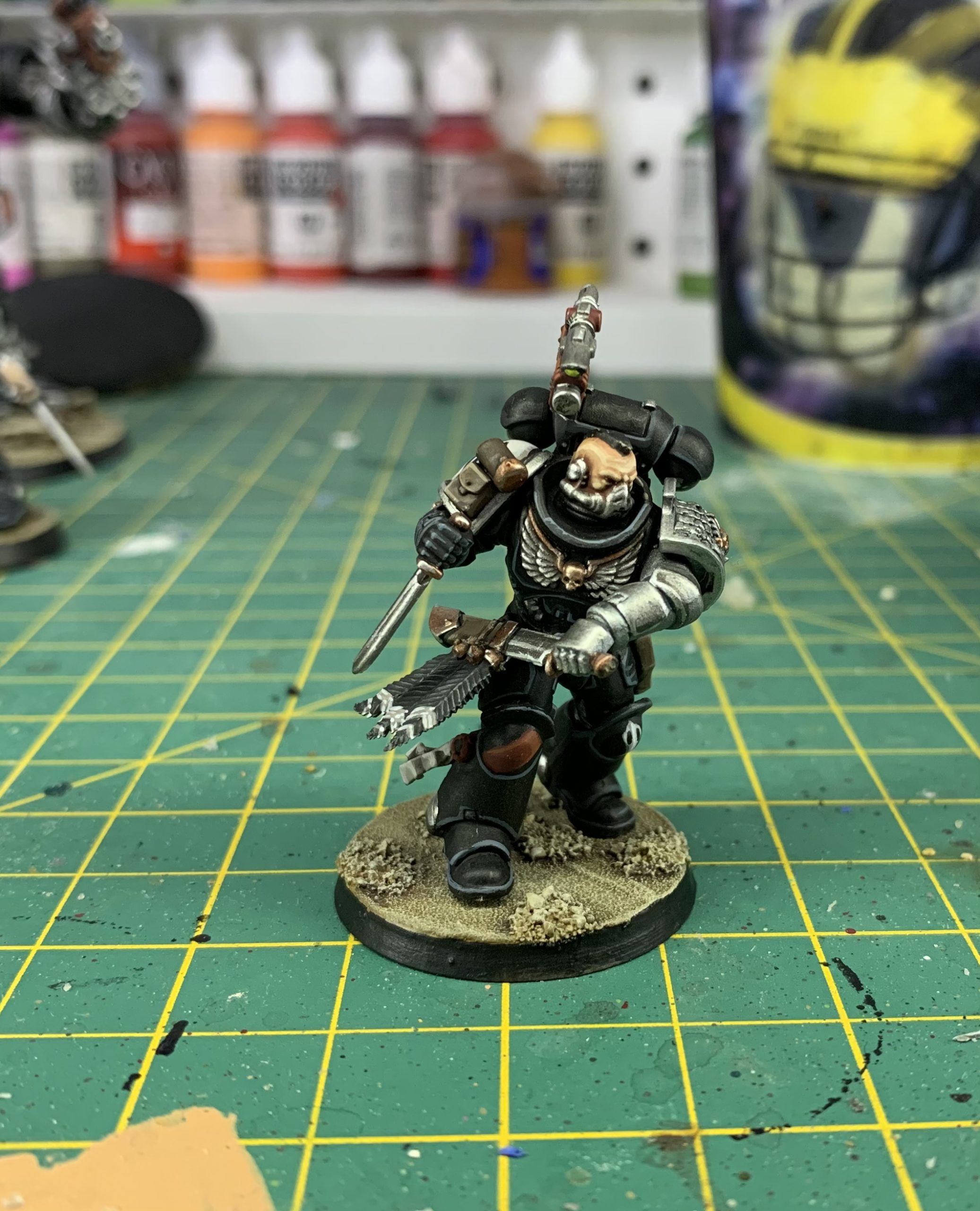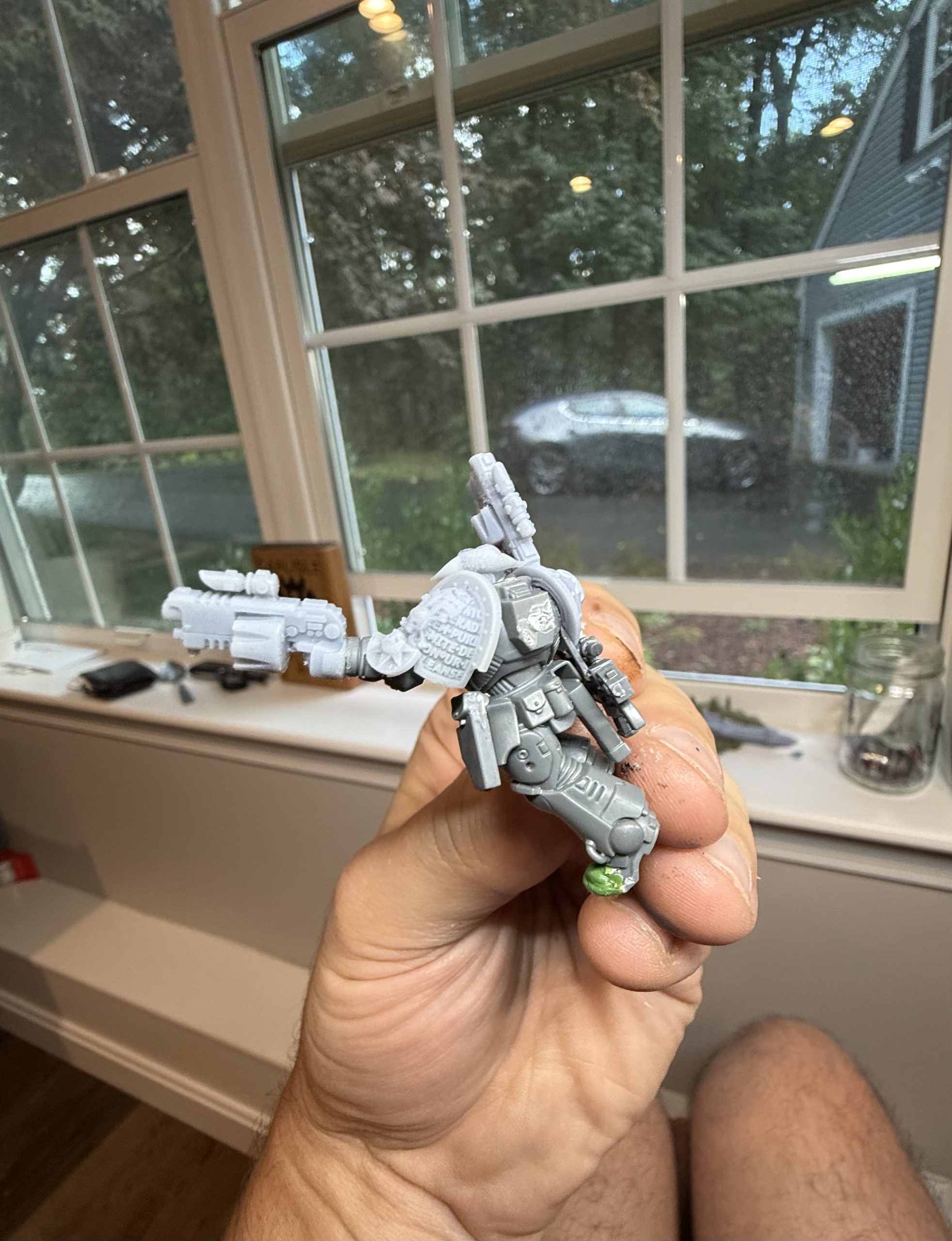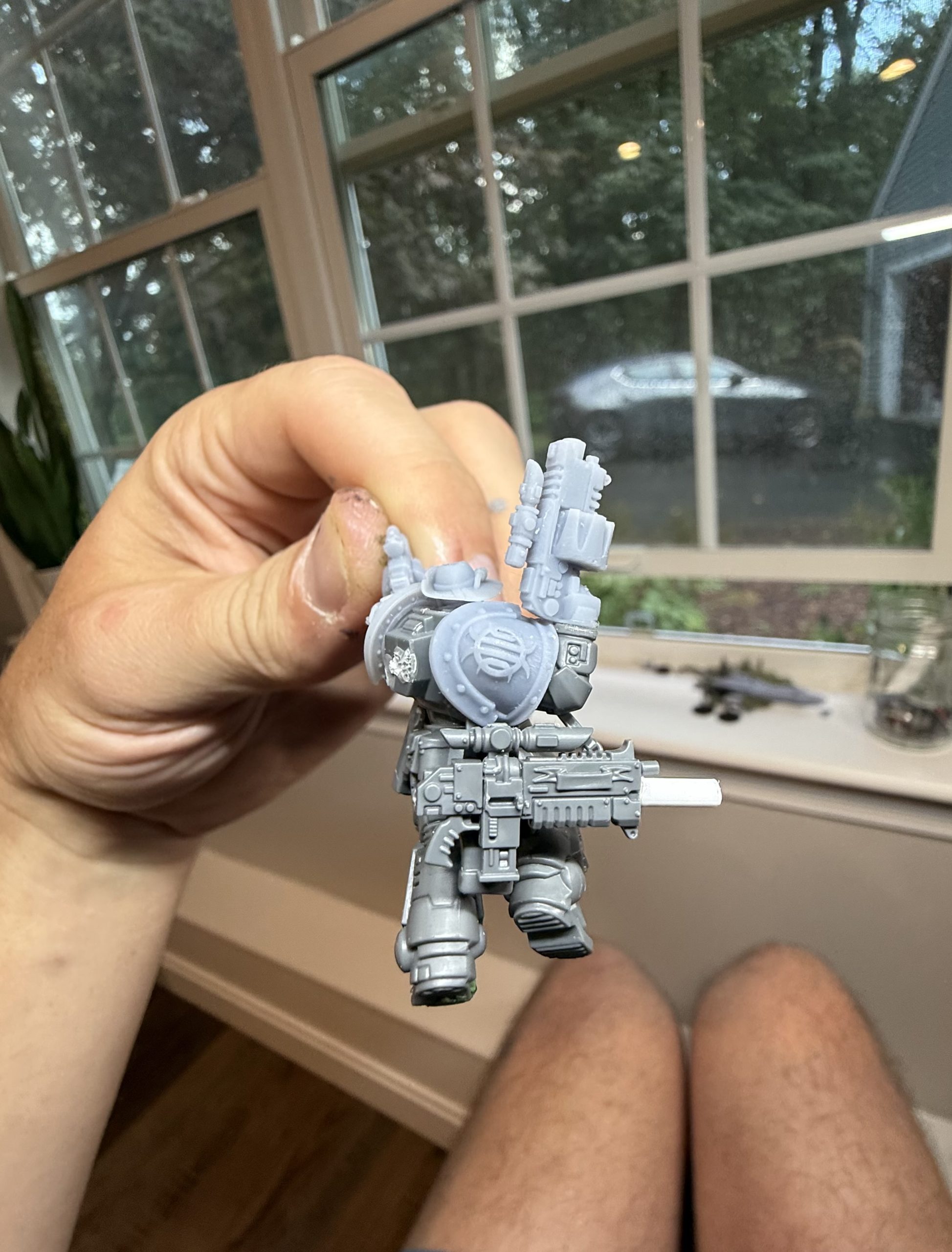This WIP mini is from an earlier generation WH40K starter box, where Primaris Marines were fighting Necrons. The downside of this being a push-fit starter box model is conversions are a bear, because it doesn’t come in the usual assembly pieces. Shaving off molded shoulder pads to attach a DW should pad is… an experience.