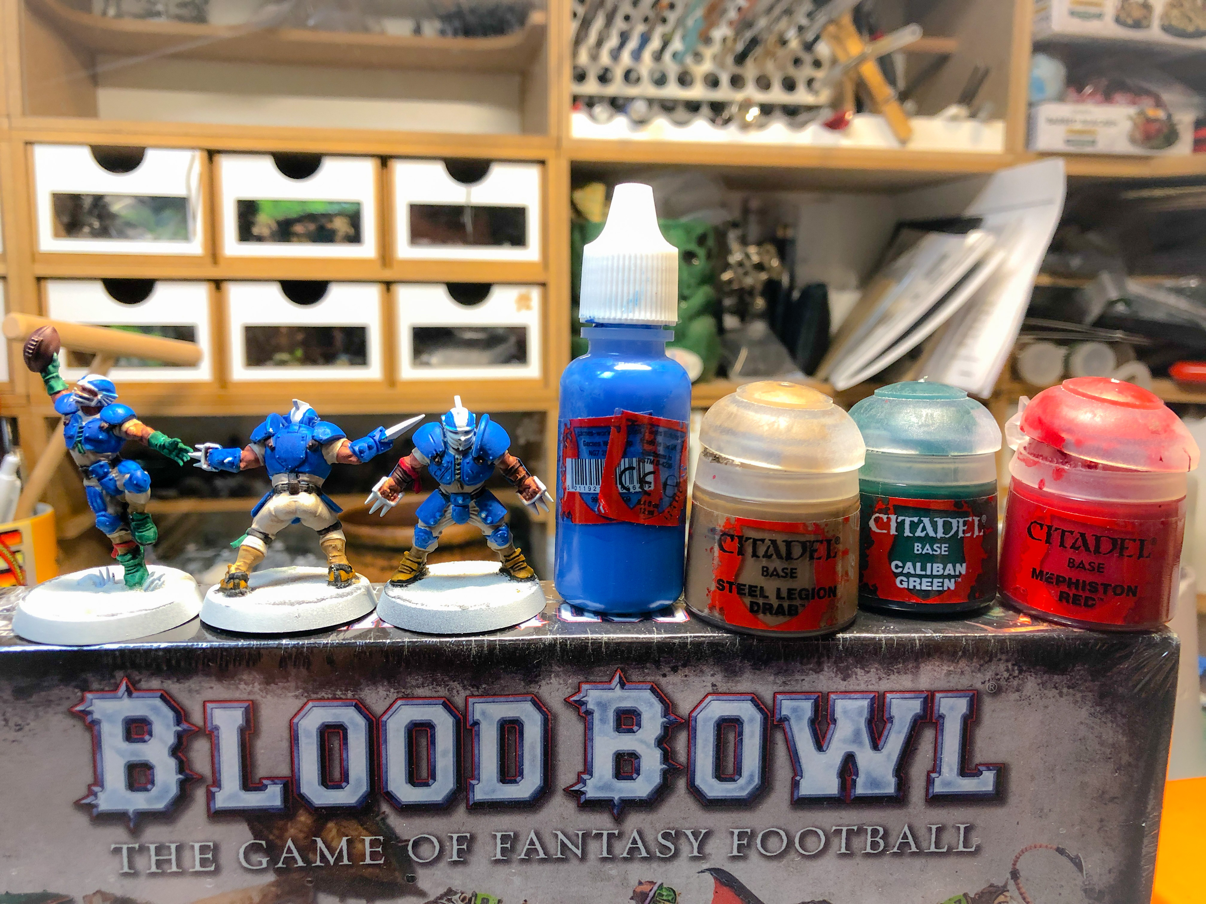 This is my first attempt at painting a Blood Bowl team, motivated by my gaming group starting a remote play league (via video). I had primed the 2016 core box Reikland Reavers so they are my first targeted team. I will post a step-by-step process so as anyone who like the look of theses guys can follow along.
