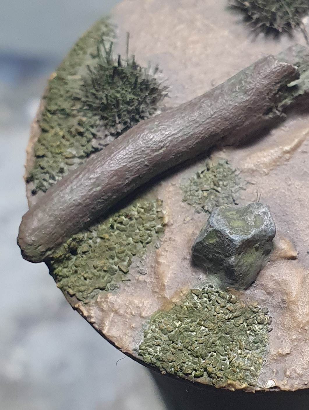 Once that is all set I will put a coat of AK Interactive Moss Deposits (AK676) on the rocks, logs, tufts and flock during the highlighting & detailing stage. I will let that dry to the touch and rub the majority off with cotton buds again.