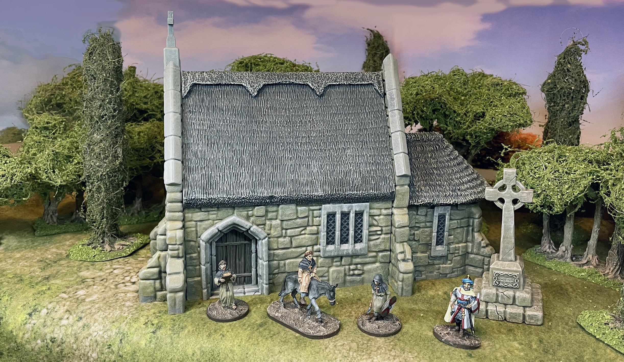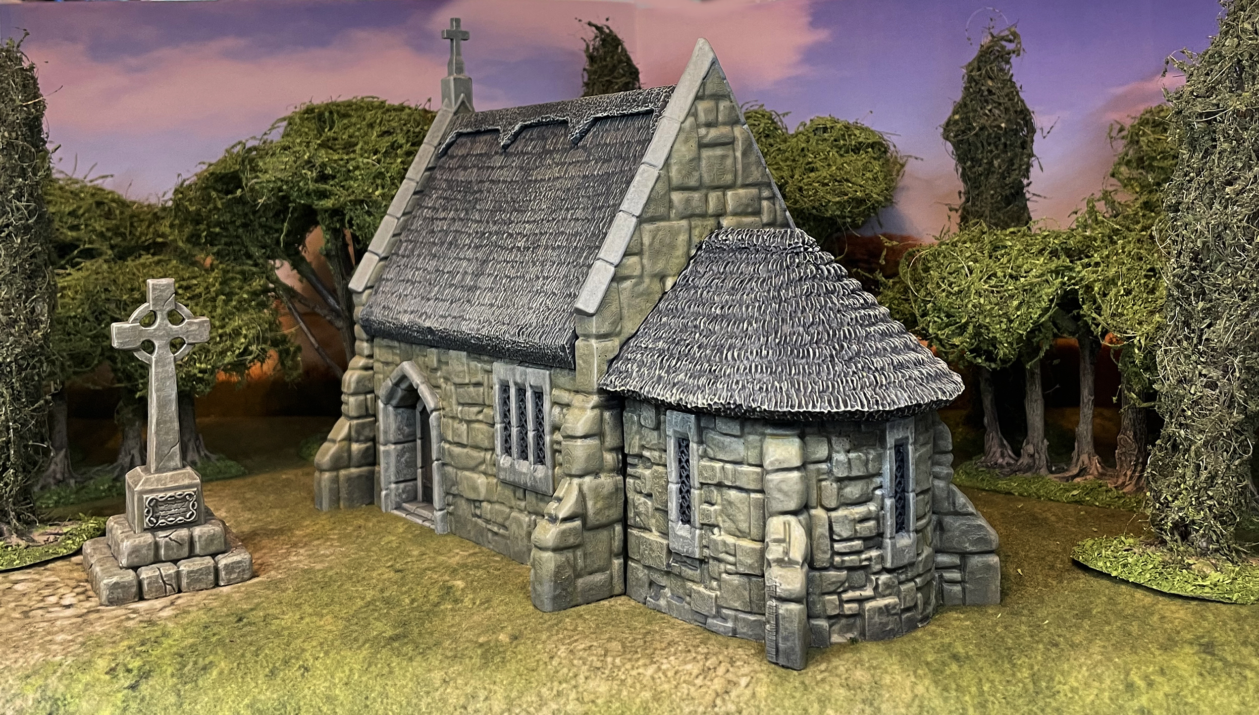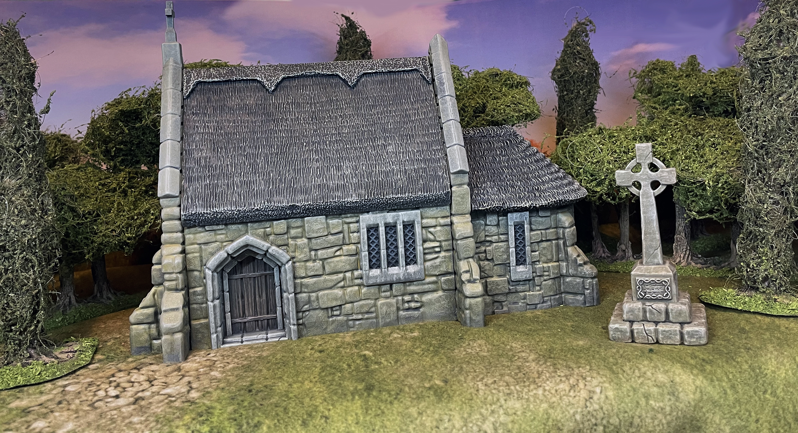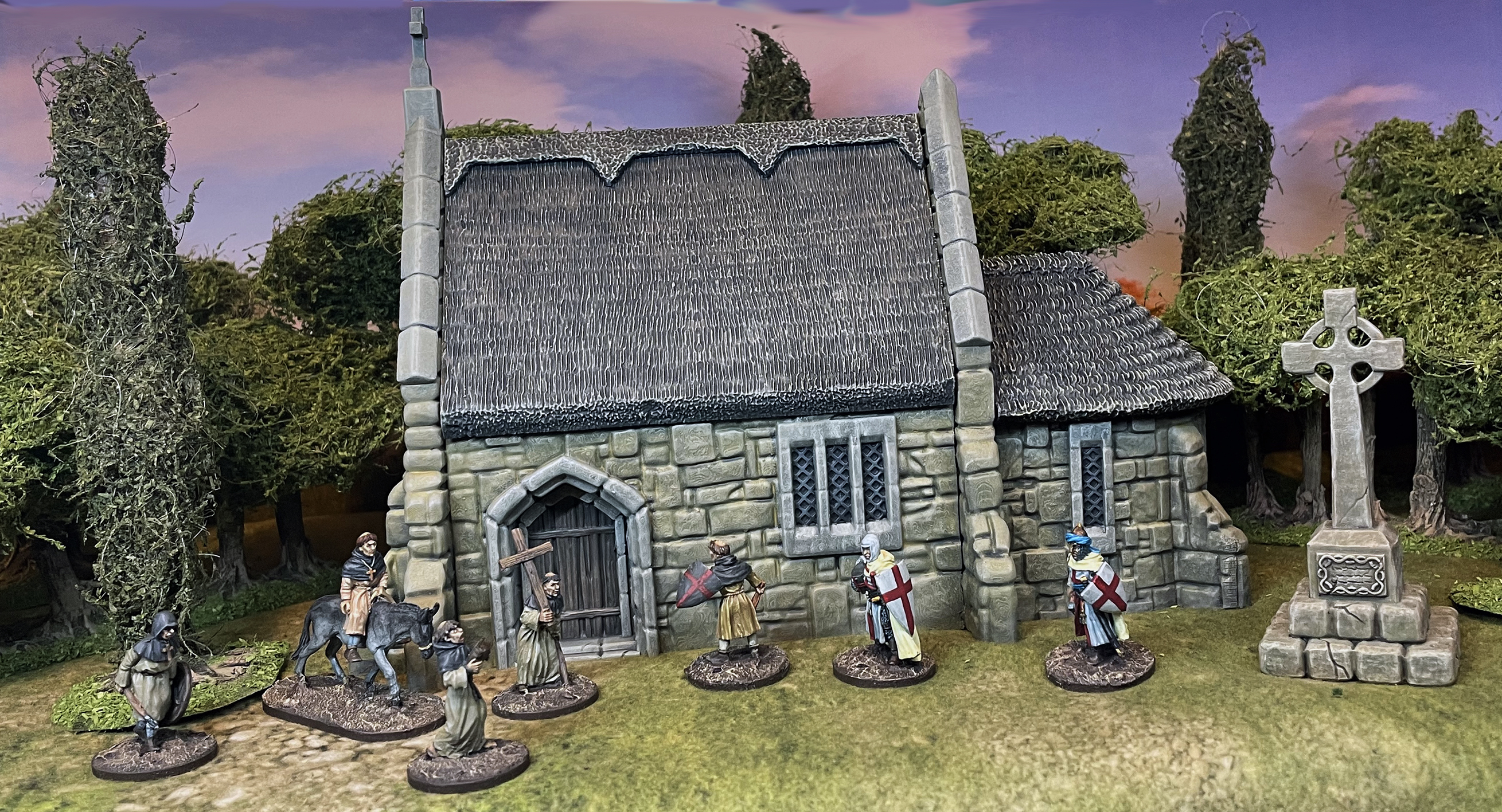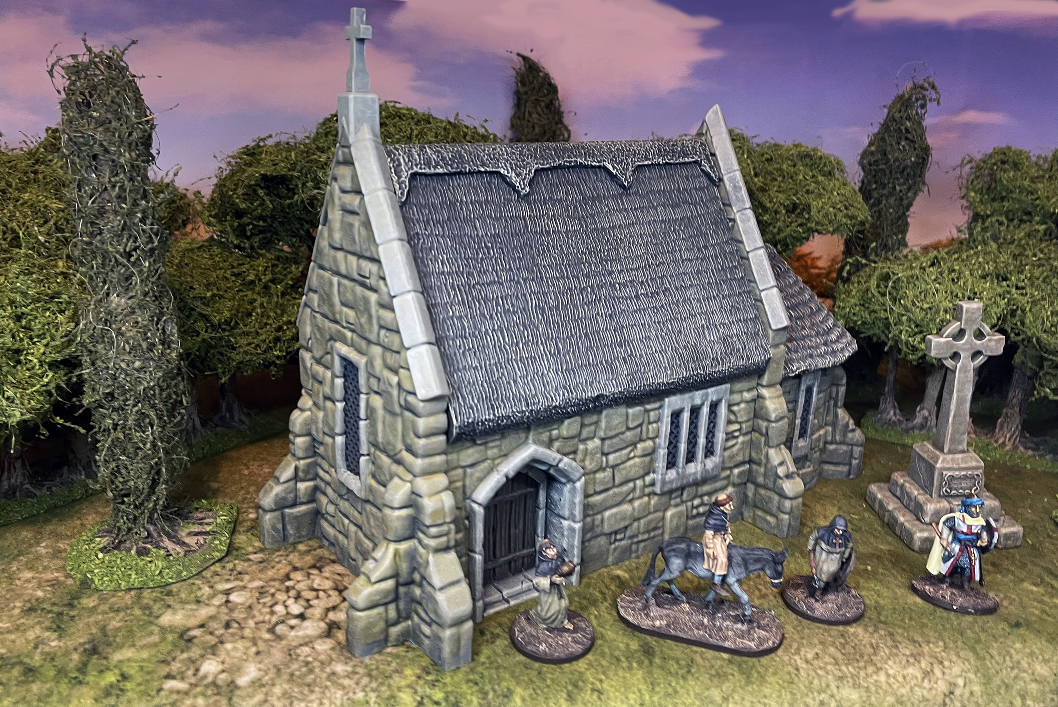 The Church is St Oswald’s in the game which is a lovely digitally sculpted early medieval church, which can be used for other periods and games, I think real up to the mid 18th century, Jacobites anyone. It is a dream to build and paint, simple to build, no issues and very intuitive. Painting wise it takes washed and drybrushes very well. Its nicely details and it is quite large compared to other buildings as it is closer to true 28mm scale as are all the buildings in the set but that’s no problem as buildings do come in different sizes.