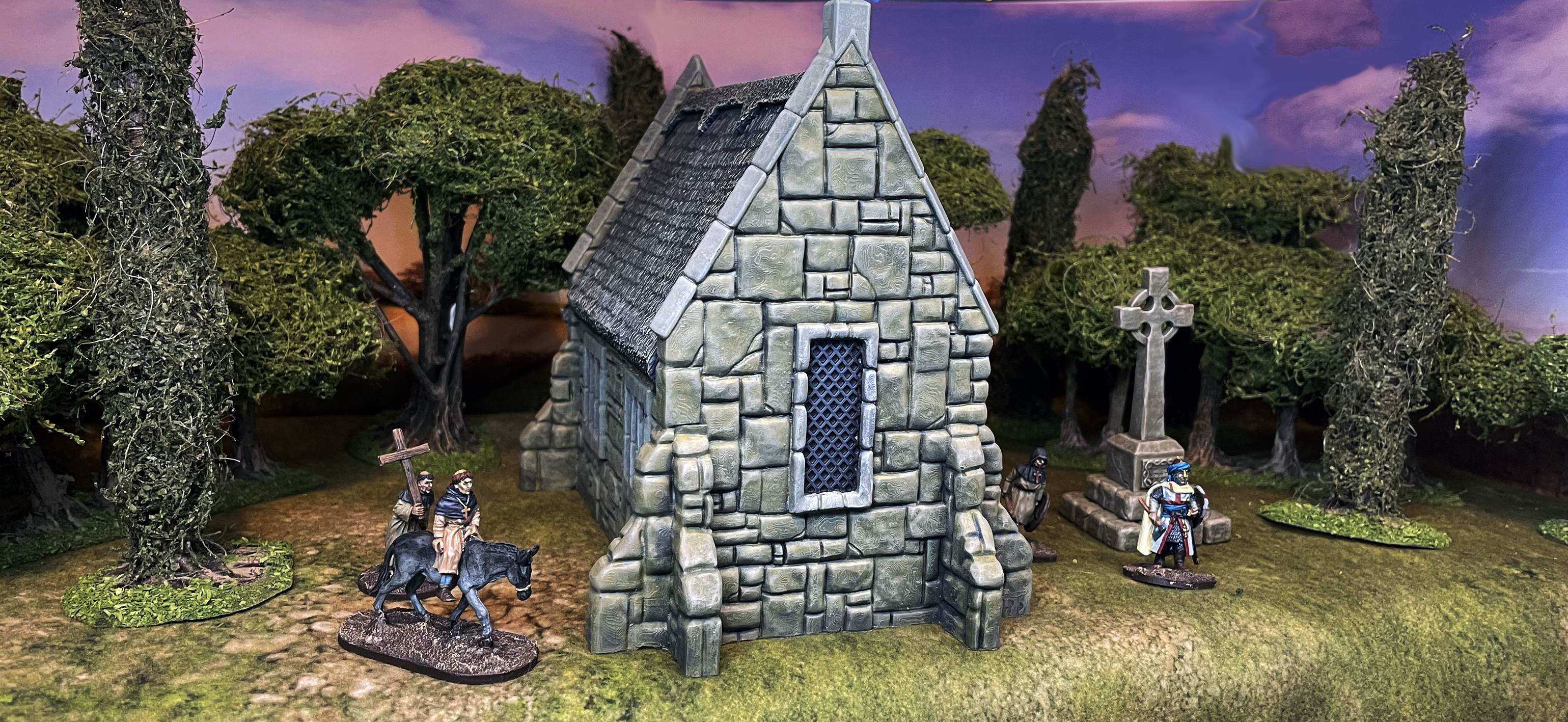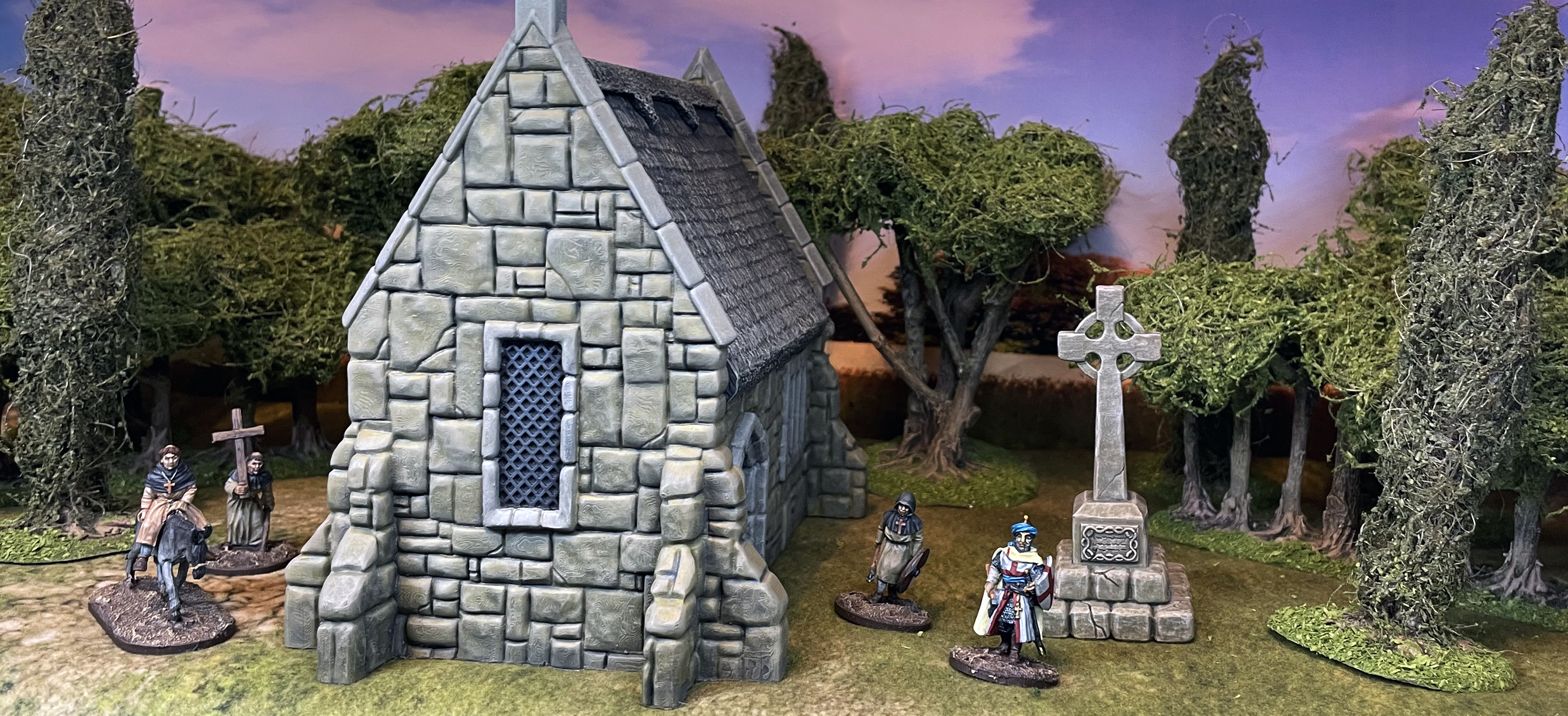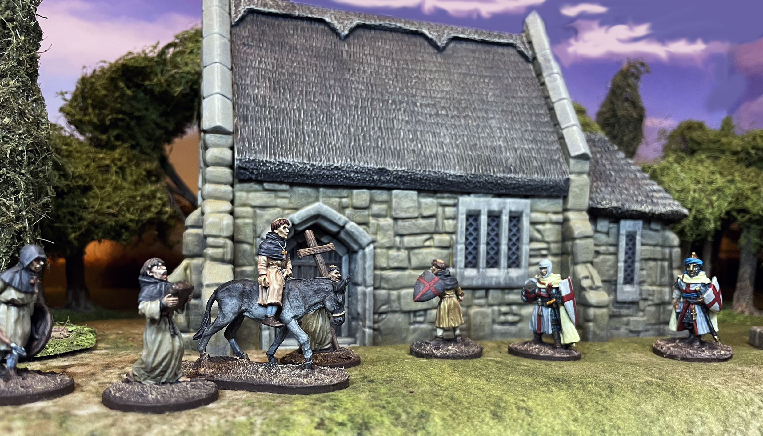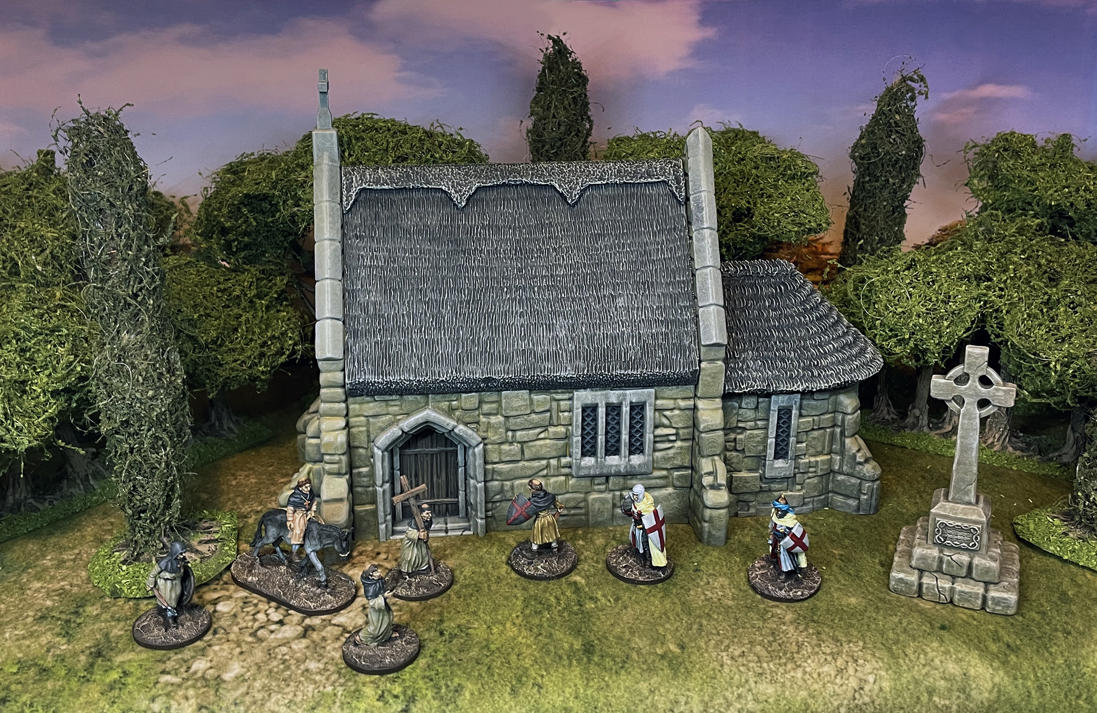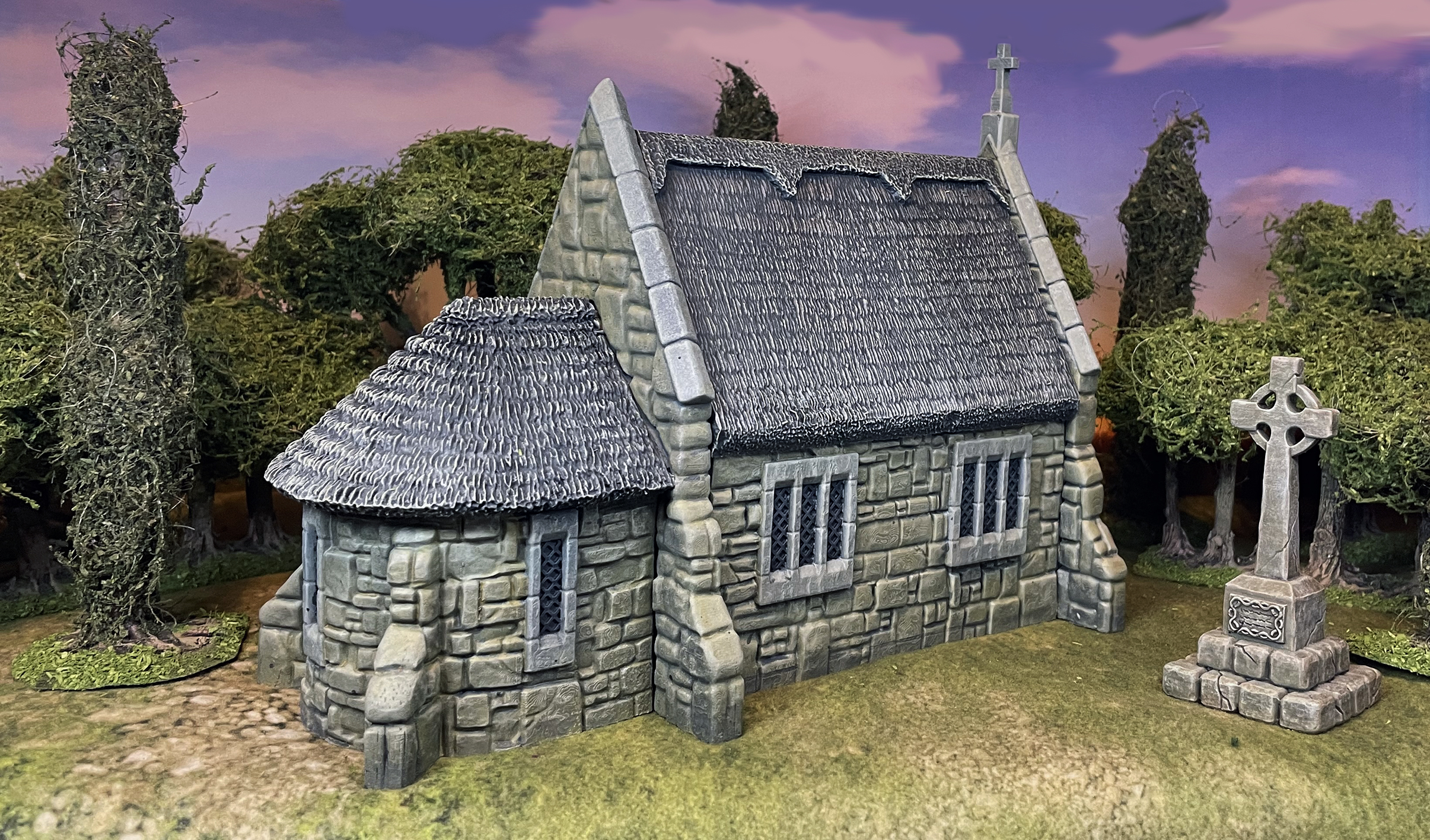 The Church is St Oswald’s in the game which is a lovely digitally sculpted early medieval church, which can be used for other periods and games, I think real up to the mid 18th century, Jacobites anyone. It is a dream to build and paint, simple to build, no issues and very intuitive. Painting wise it takes washed and drybrushes very well. Its nicely details and it is quite large compared to other buildings as it is closer to true 28mm scale as are all the buildings in the set but that’s no problem as buildings do come in different sizes.