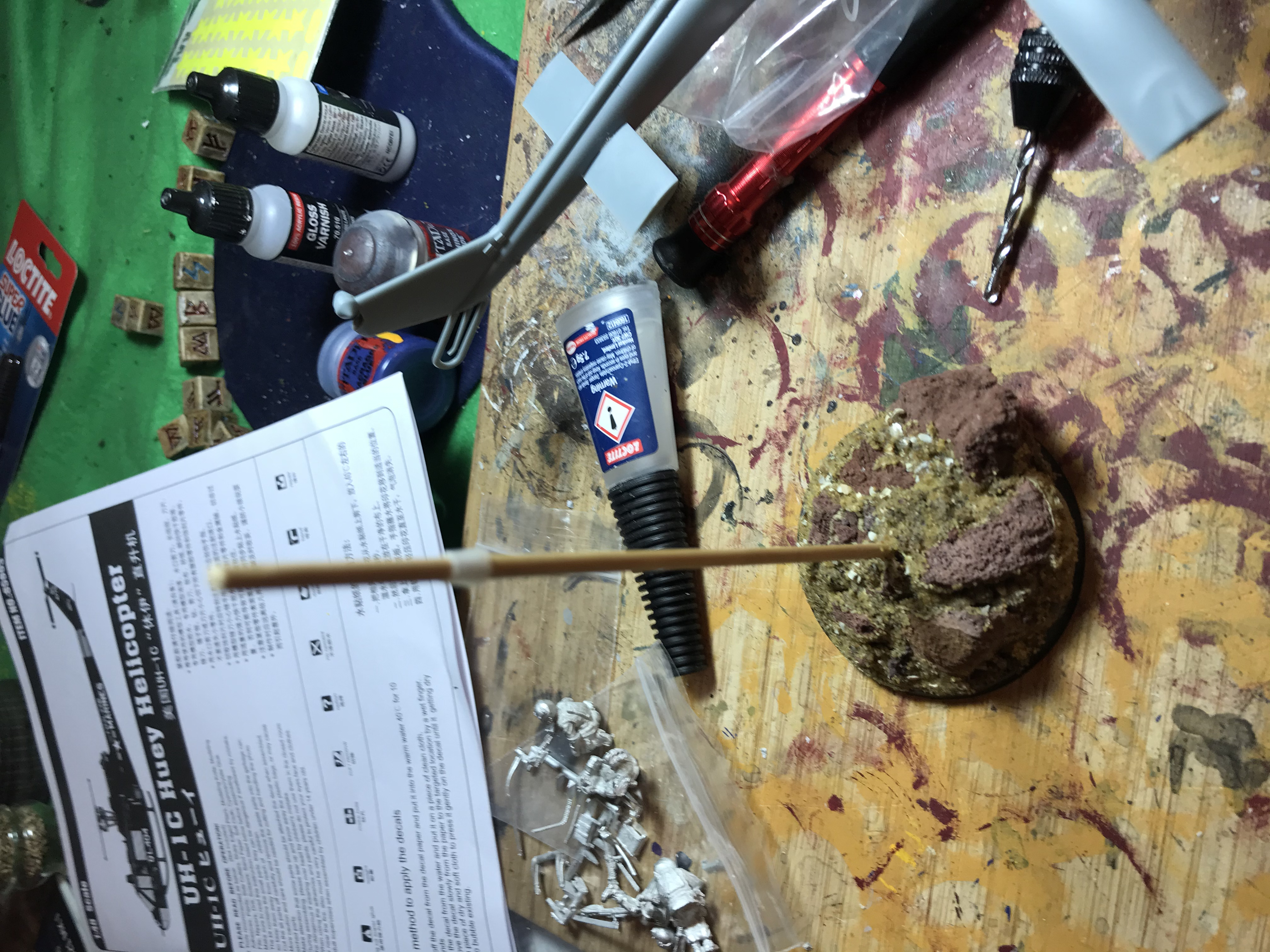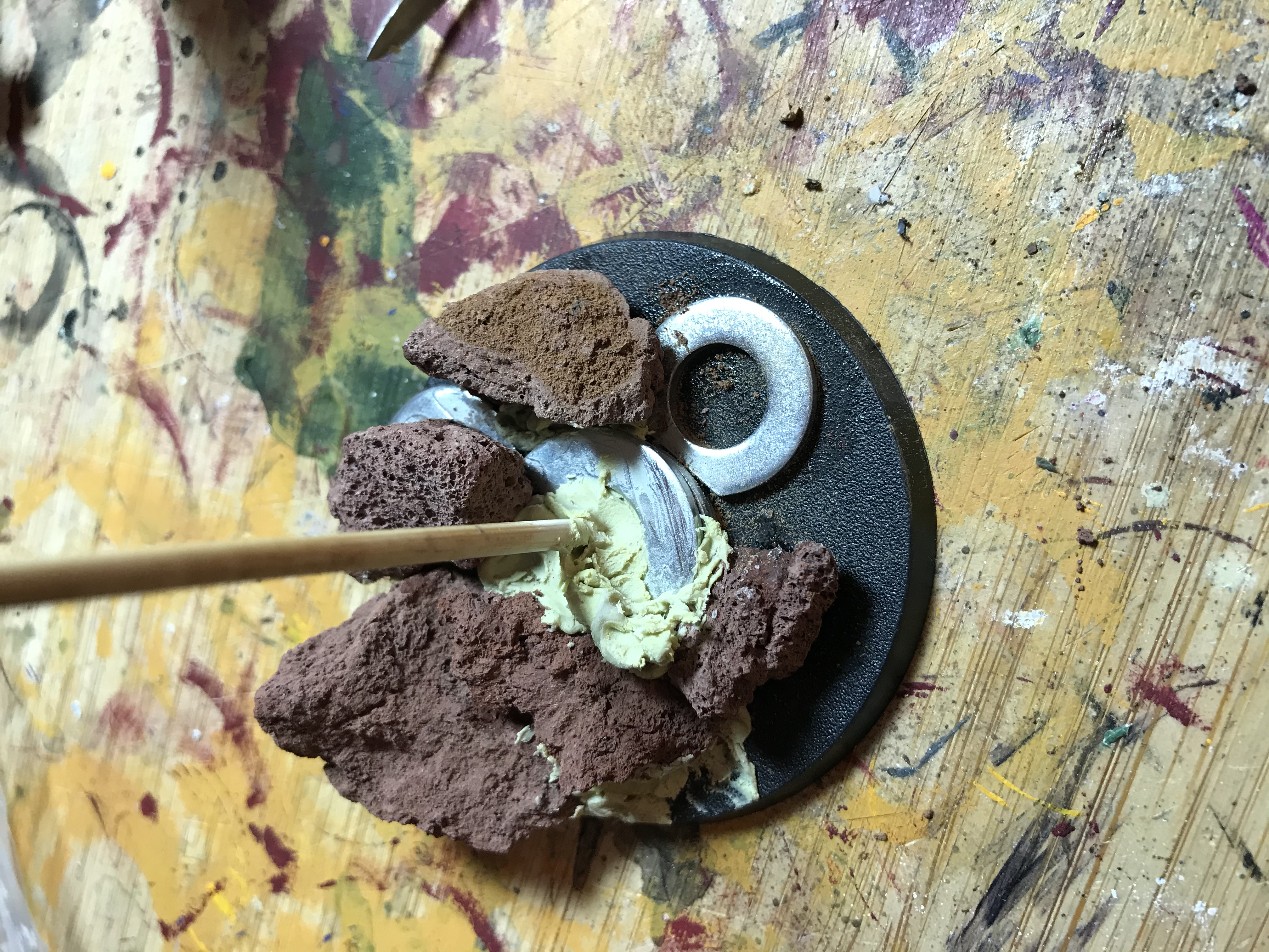 because the weight of the model unbalanced the stand i glued a load of washers to it then covered them up with rocks and milliput before gluing on sand to cover up the putty and washers.