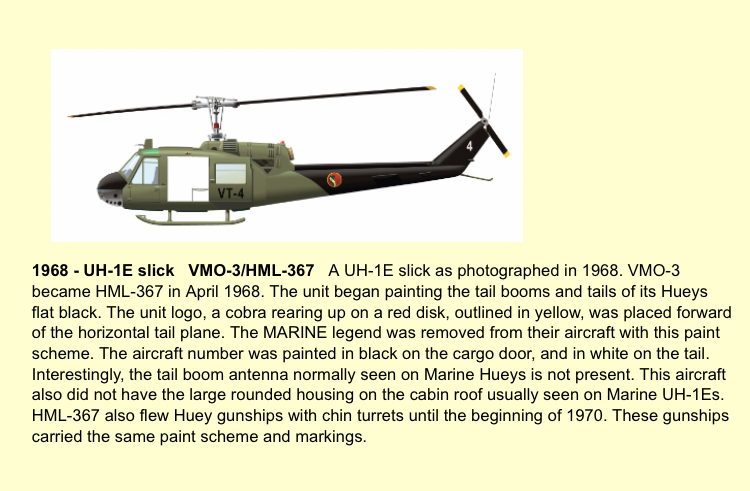 The Marines used the UH1-B/C model during the Vietnam War and named it the UH1-E it was pretty much the same as the Army models apart from the use of Aluminium for the body of the helicopter instead of Magnesium which would corrode during transport and whilst operating from ships.
