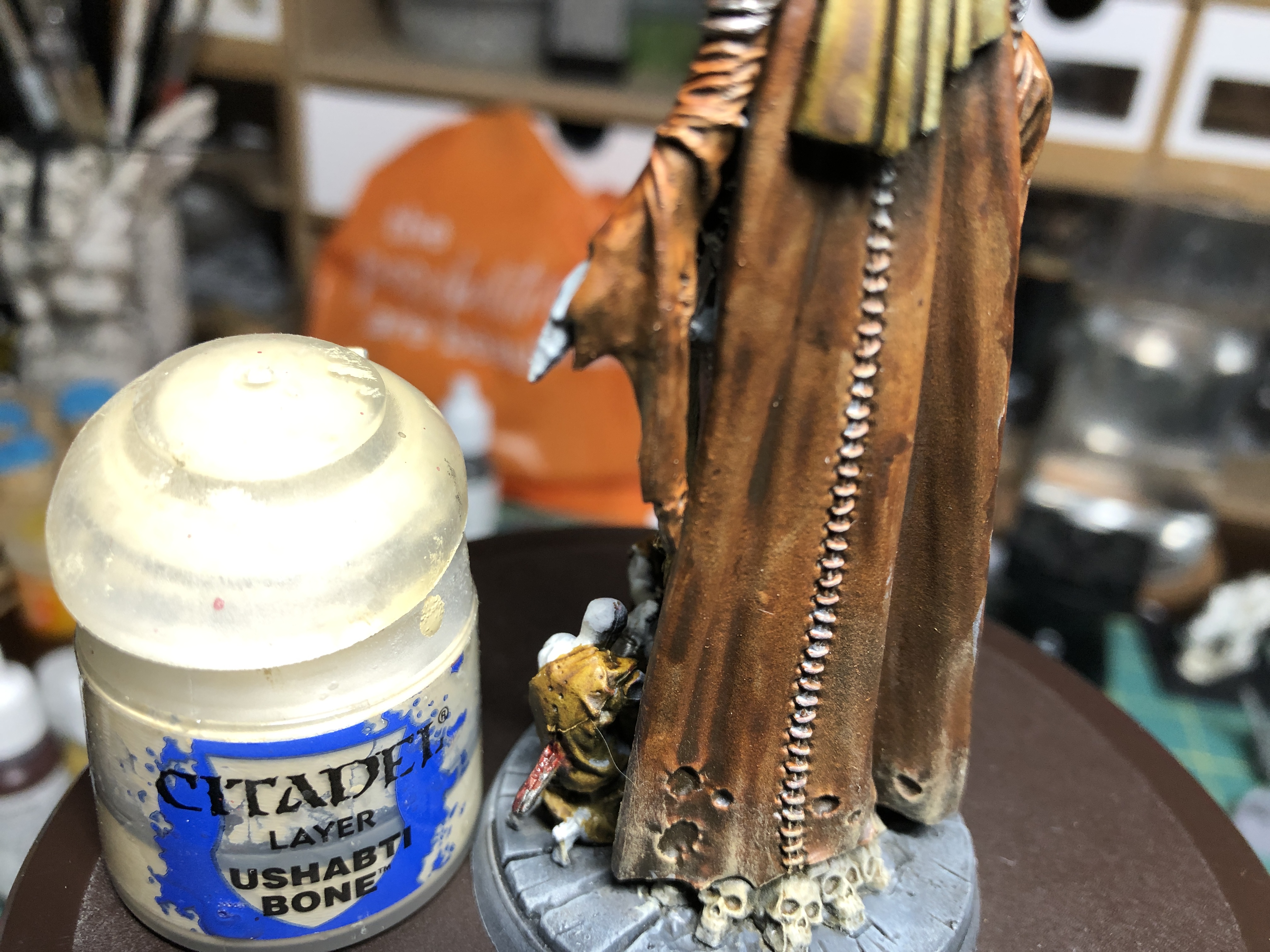 Base skulls were given a layer of GW Contrast Skeleton Horde and the minion robes and mask were painted GW Contrast Snakebite Leather.