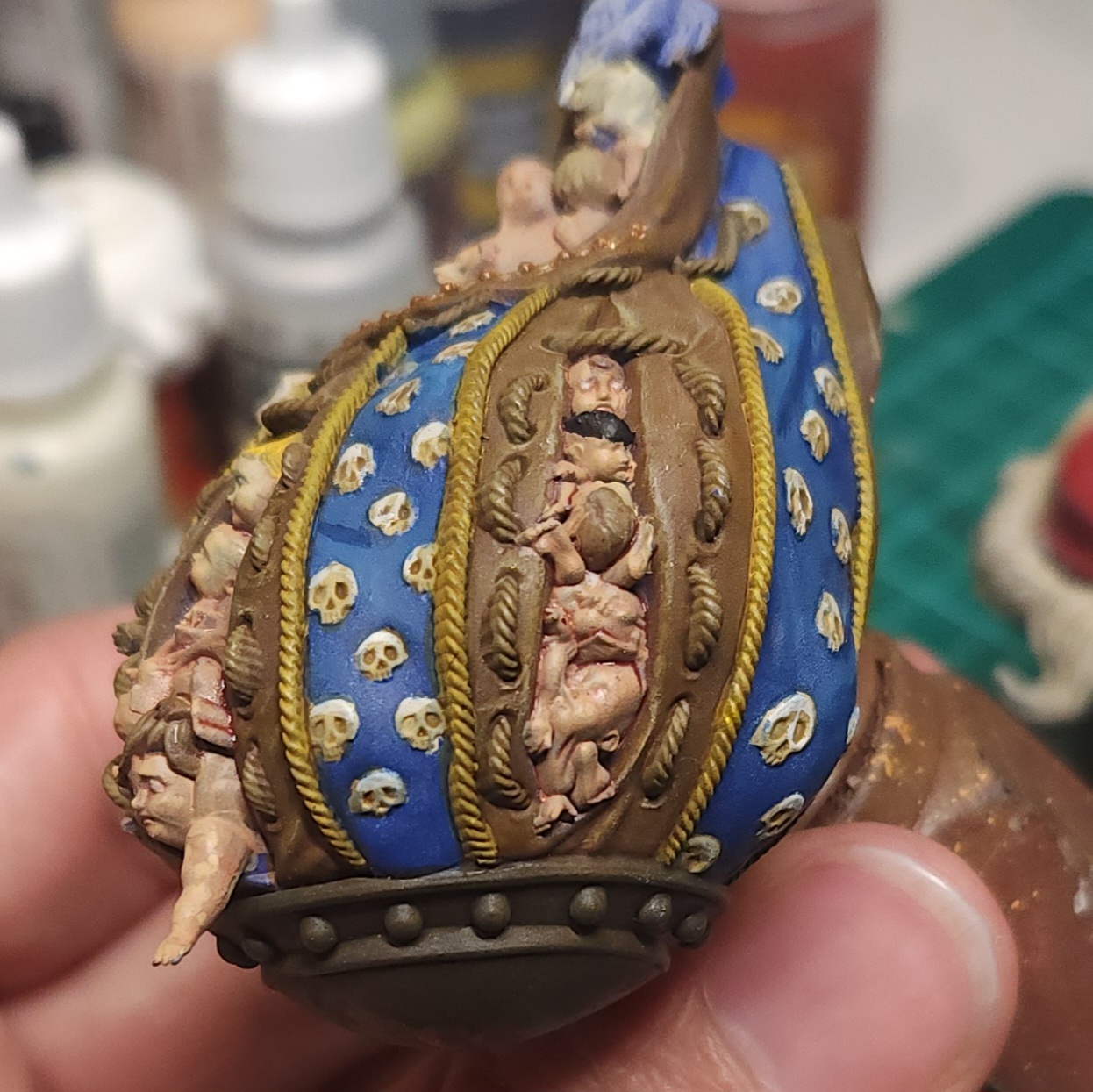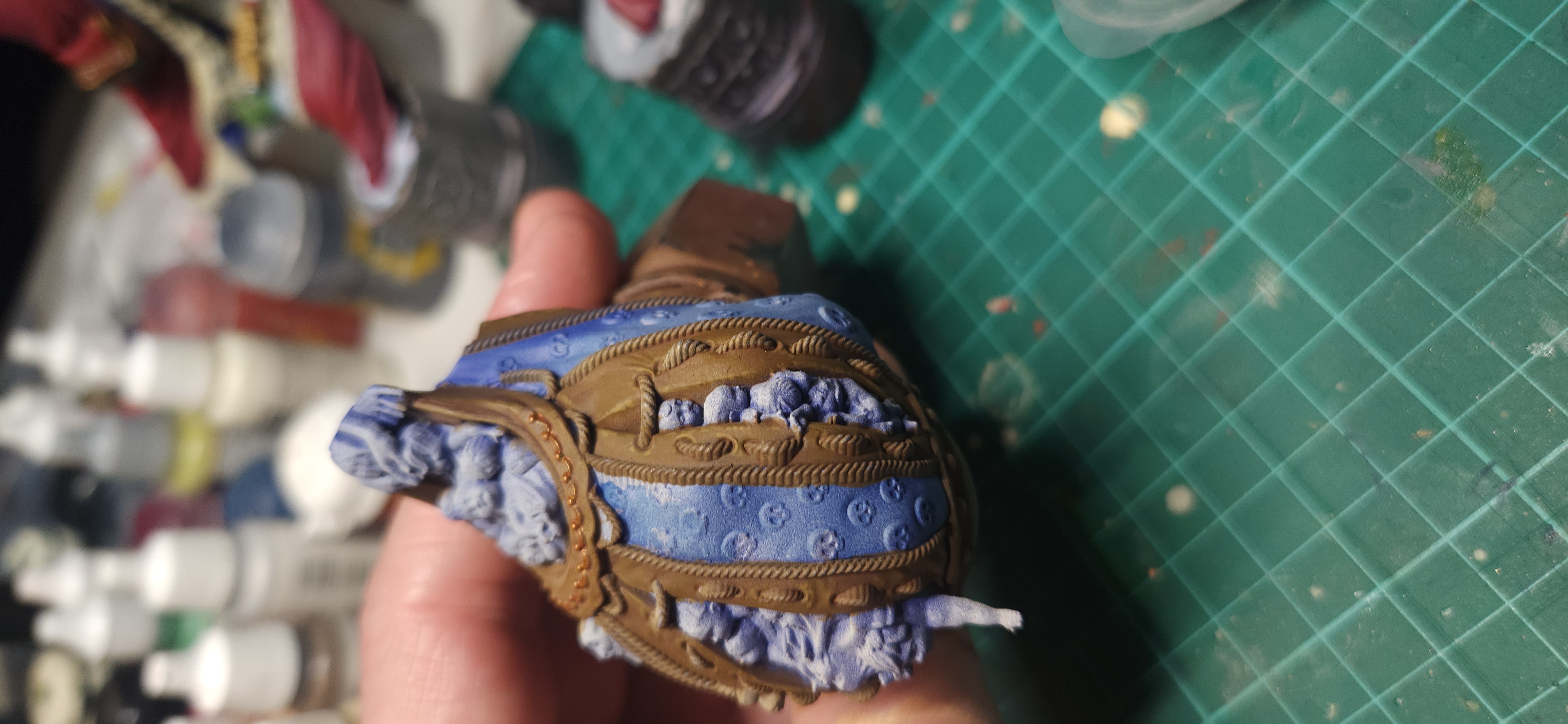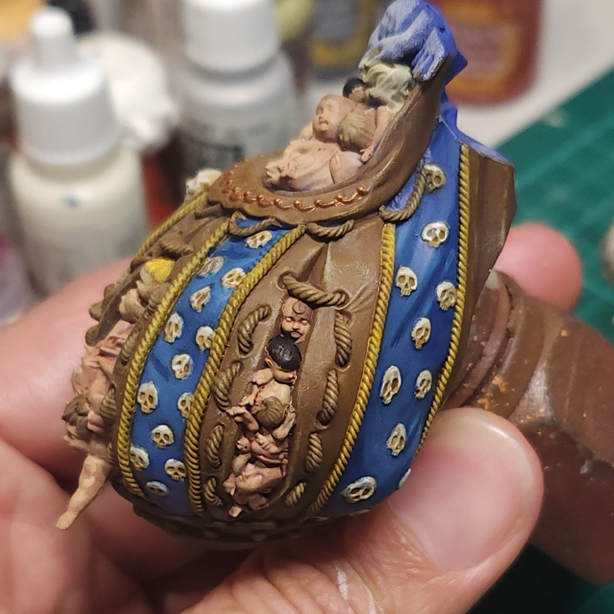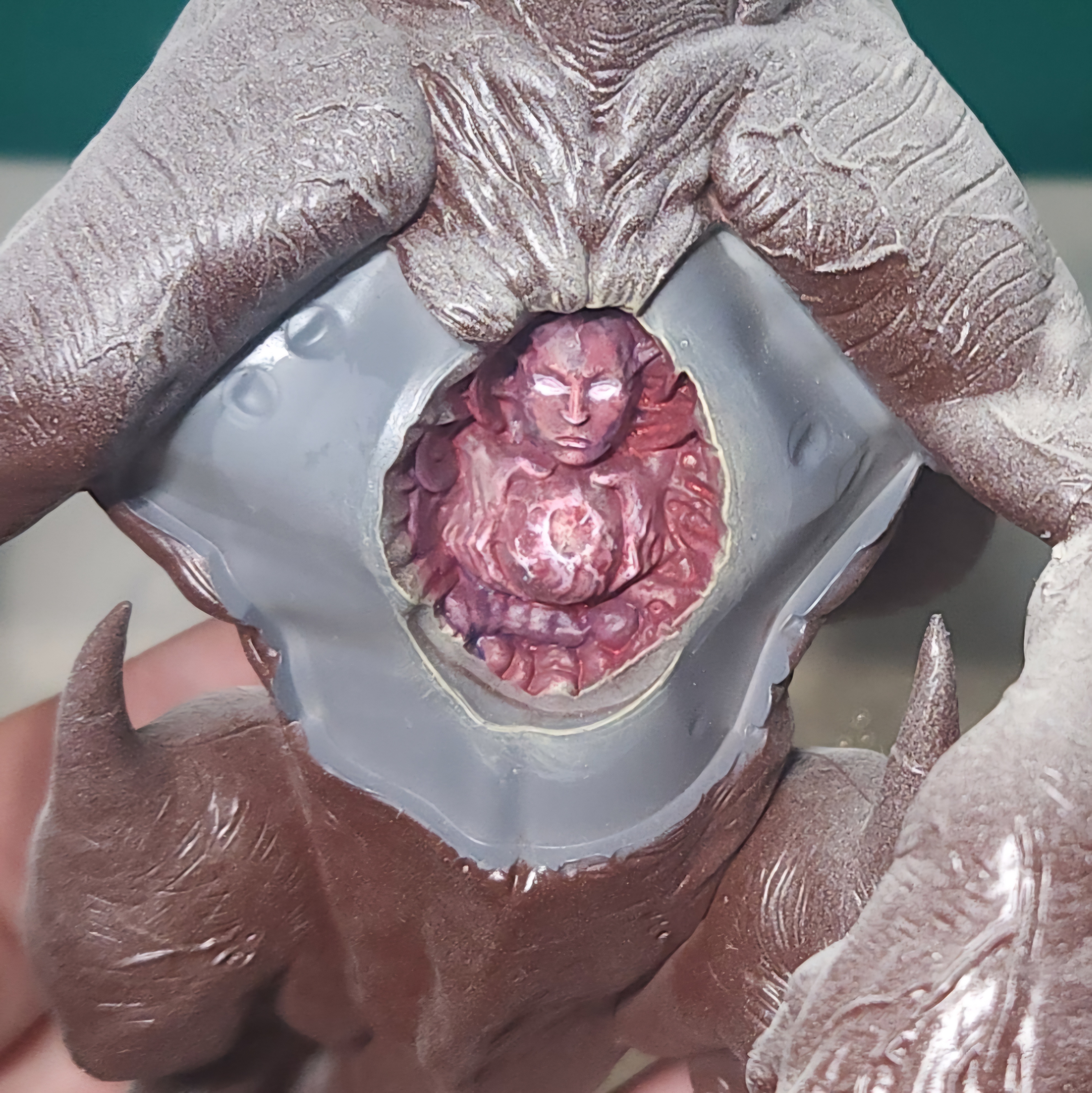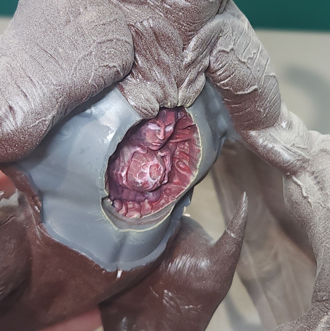 I made a glaze of Citadel Kantor Blue and applied it to some of the intestine-looking detail and around the edges of the face