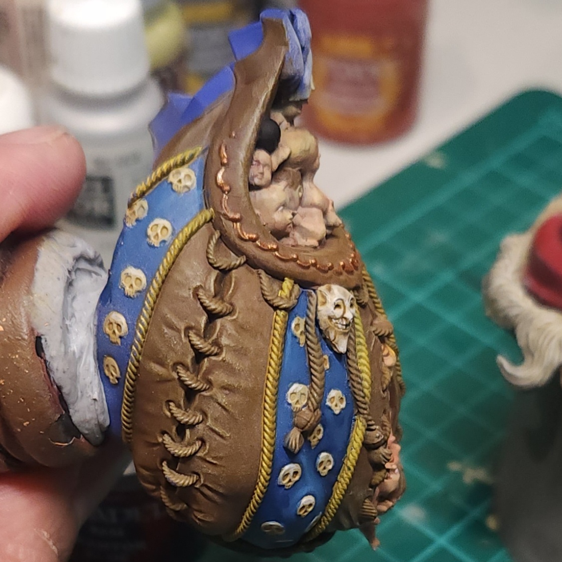 Around the mouth of the sack is a trimming that I decided to paint with Citadel Retributor Armour over the brown base coat.
