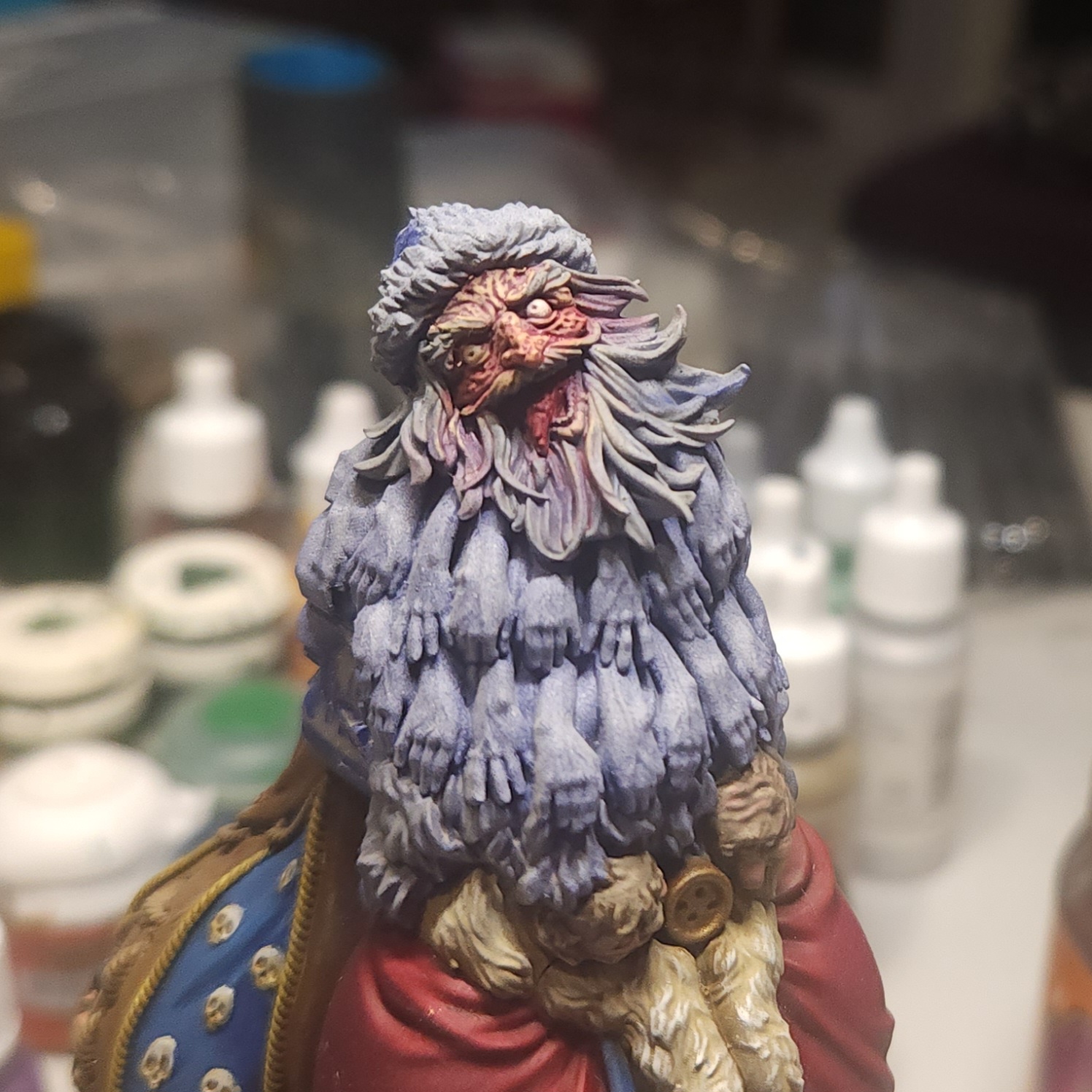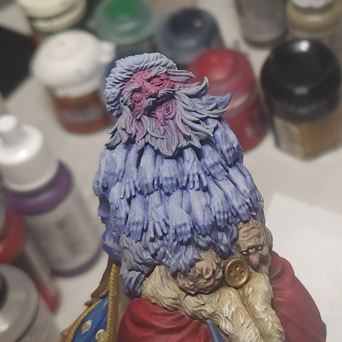 The rosy cheeks, lips and nose are a touch of Vallejo Gory Red mixed in to the Buff and glazed onto the particular features.