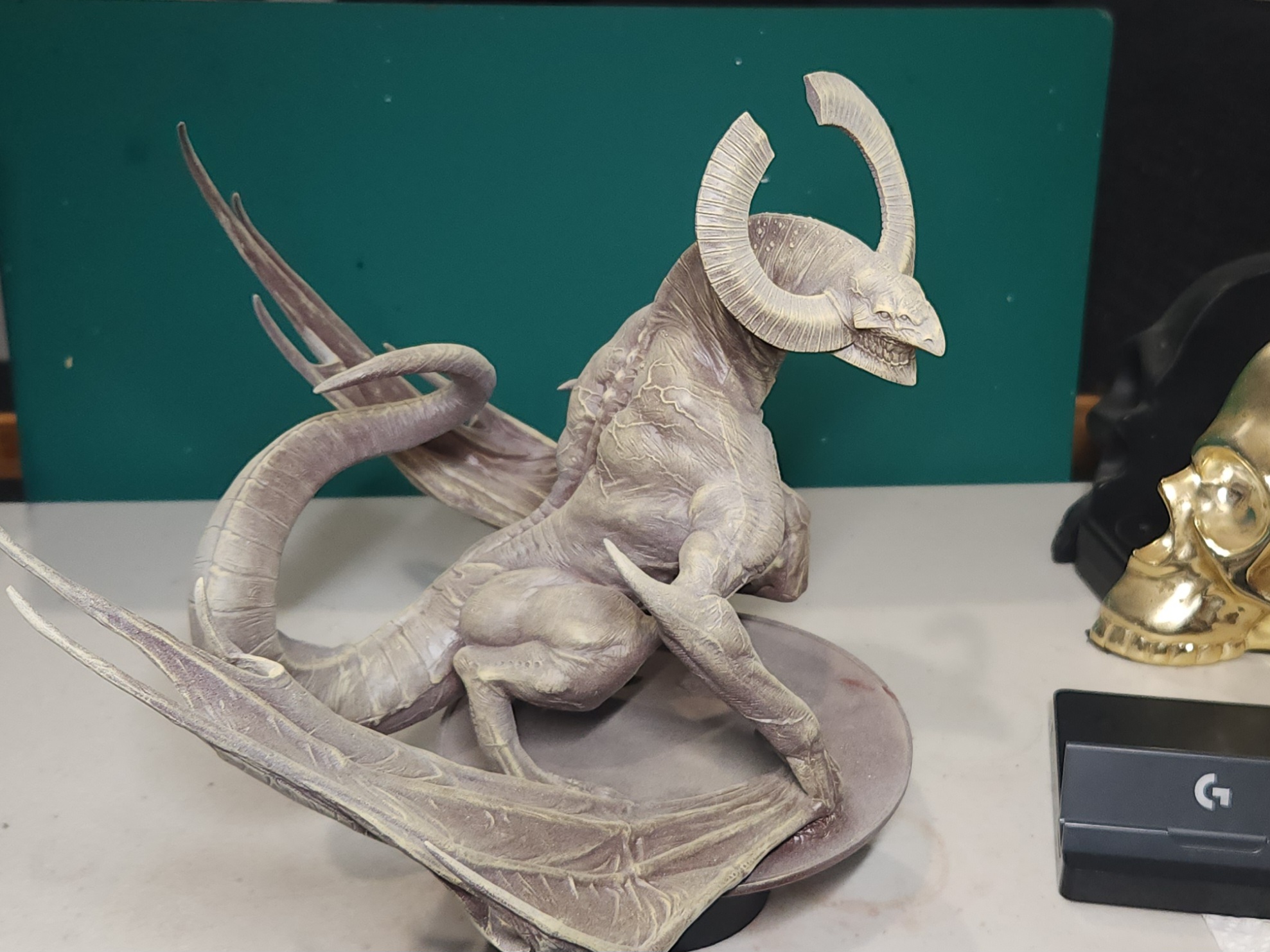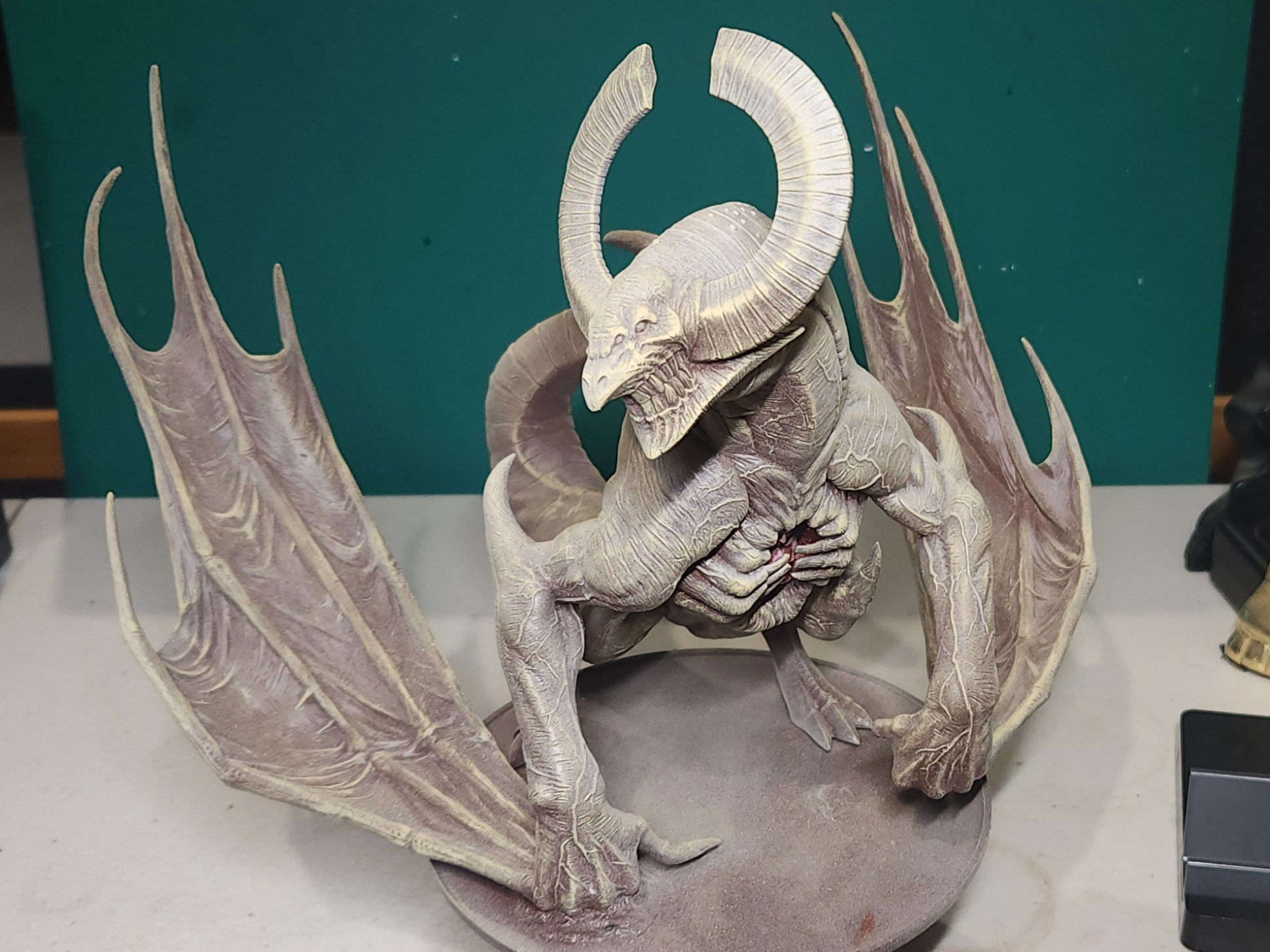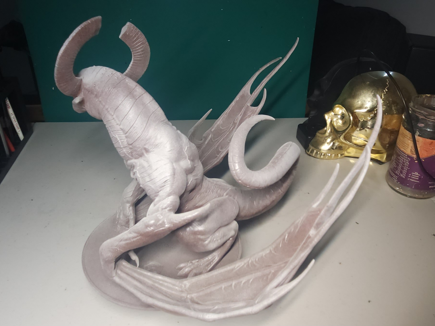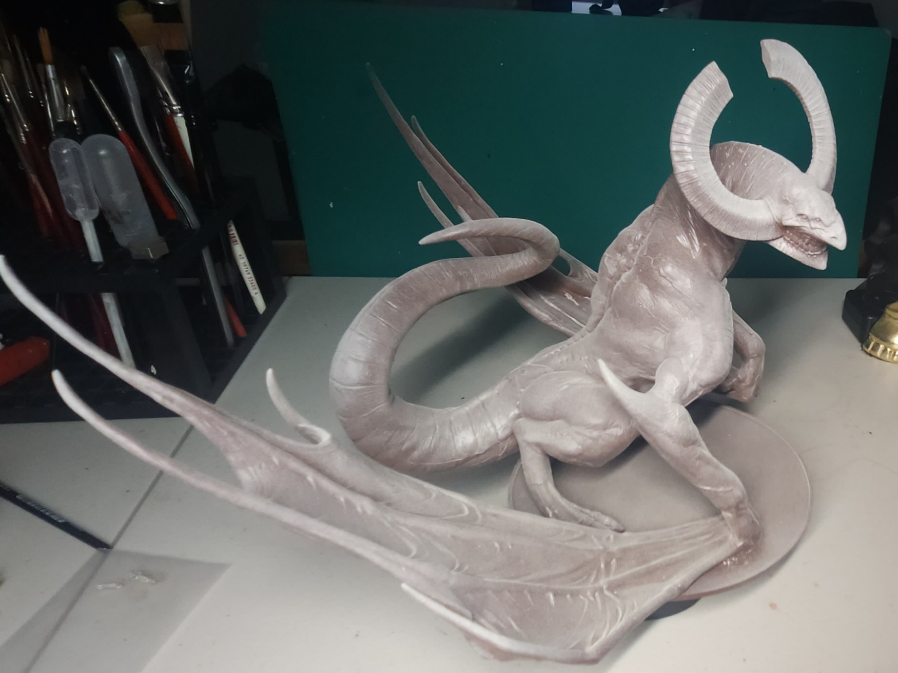 Work on the detail for the horns, claws and ribs begins.