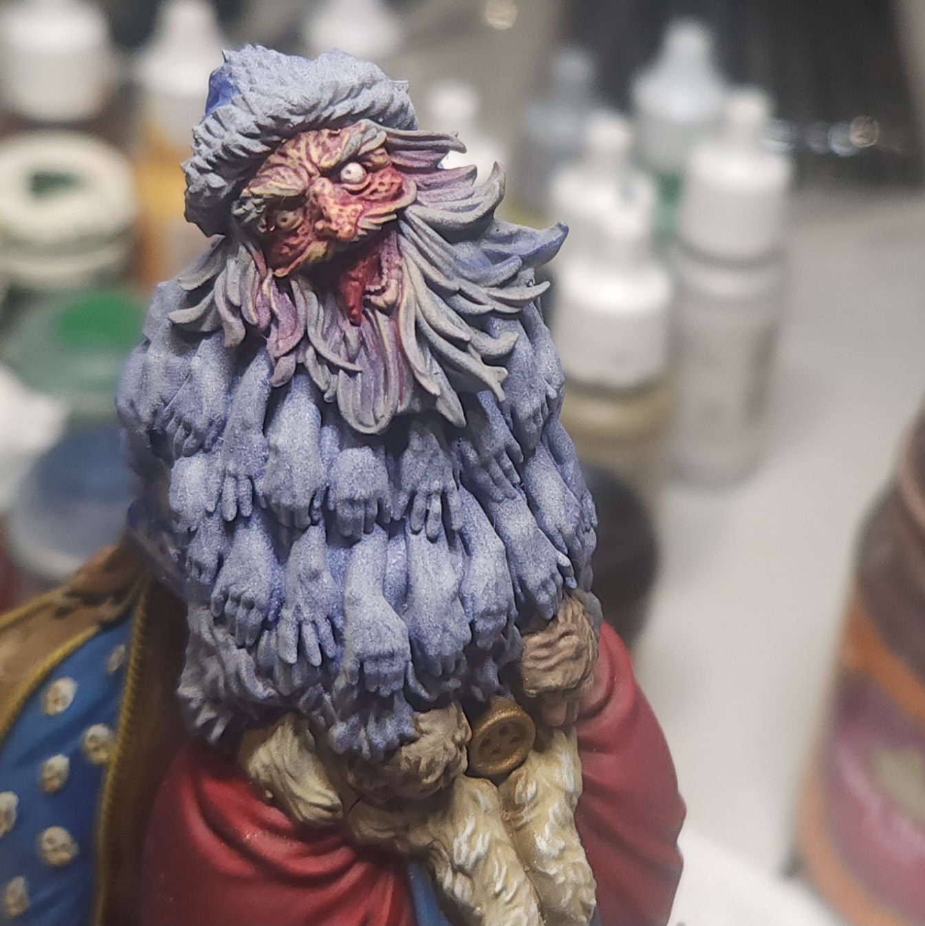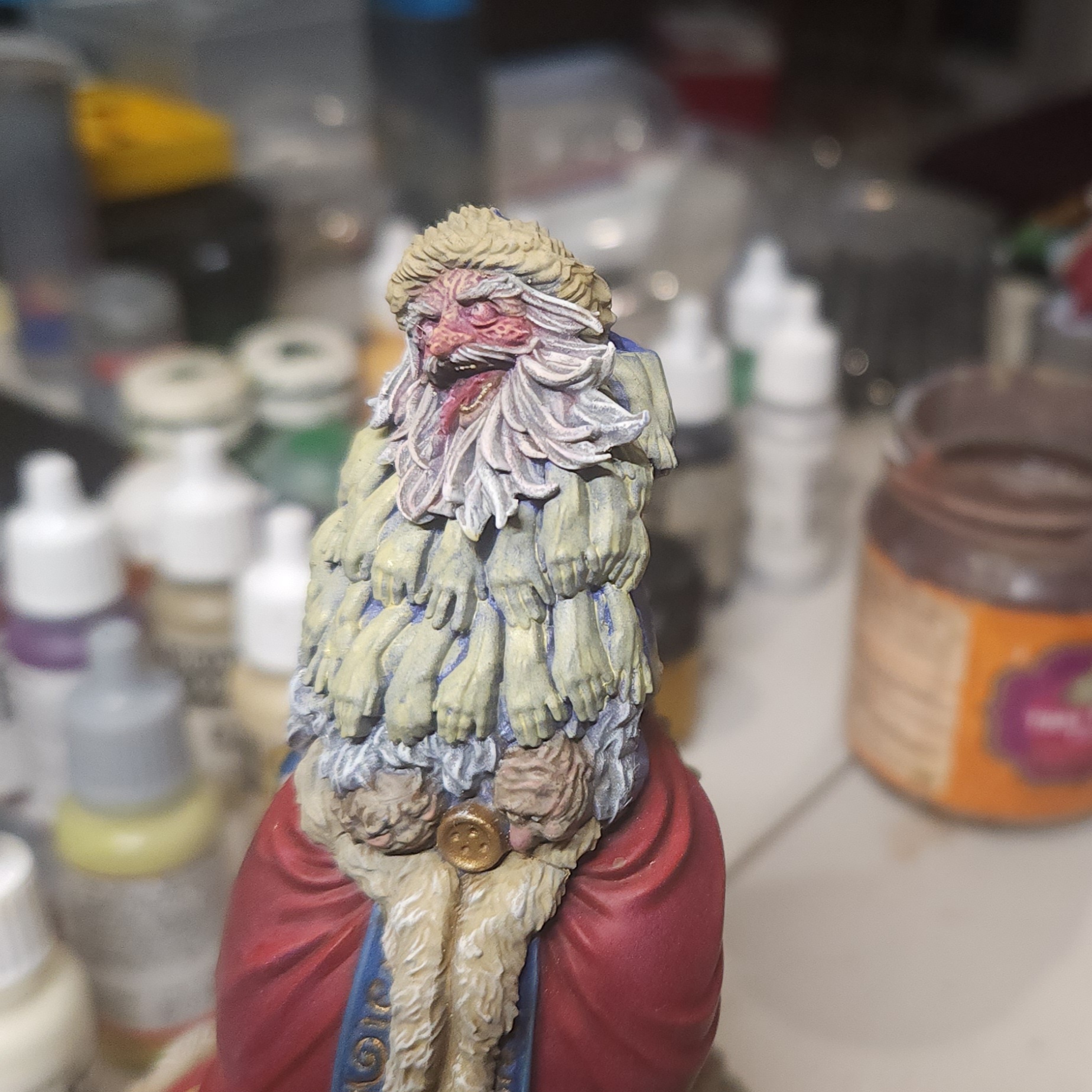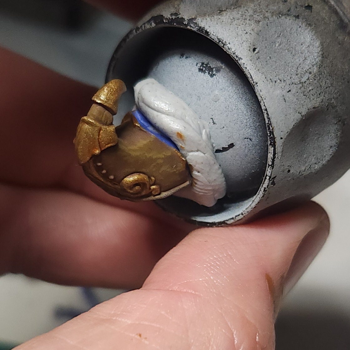 Once this was dry, I took the opportunity to glue it back on to the main body of the miniature. The next steps will include painting the beard of hands, which overlaps onto this component.