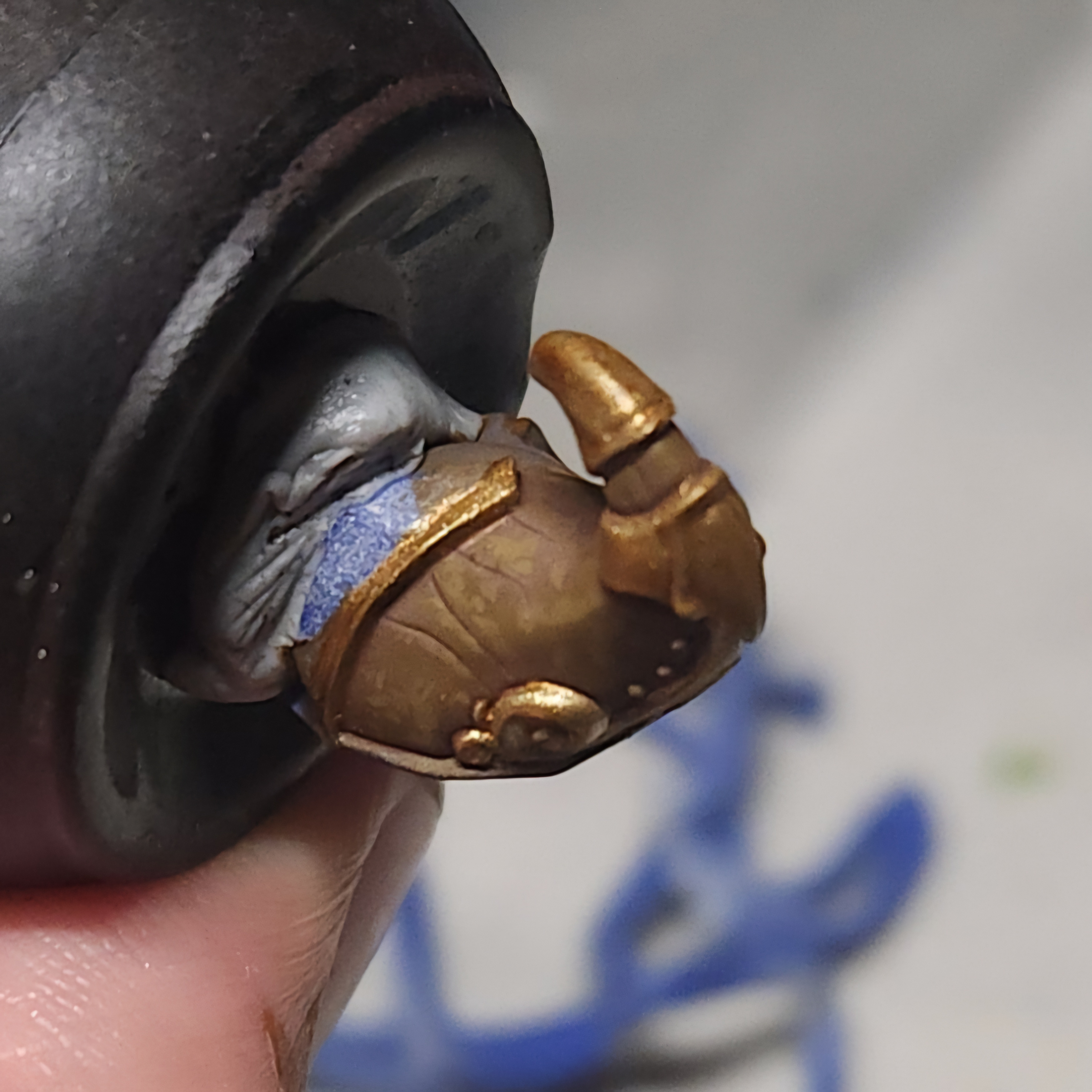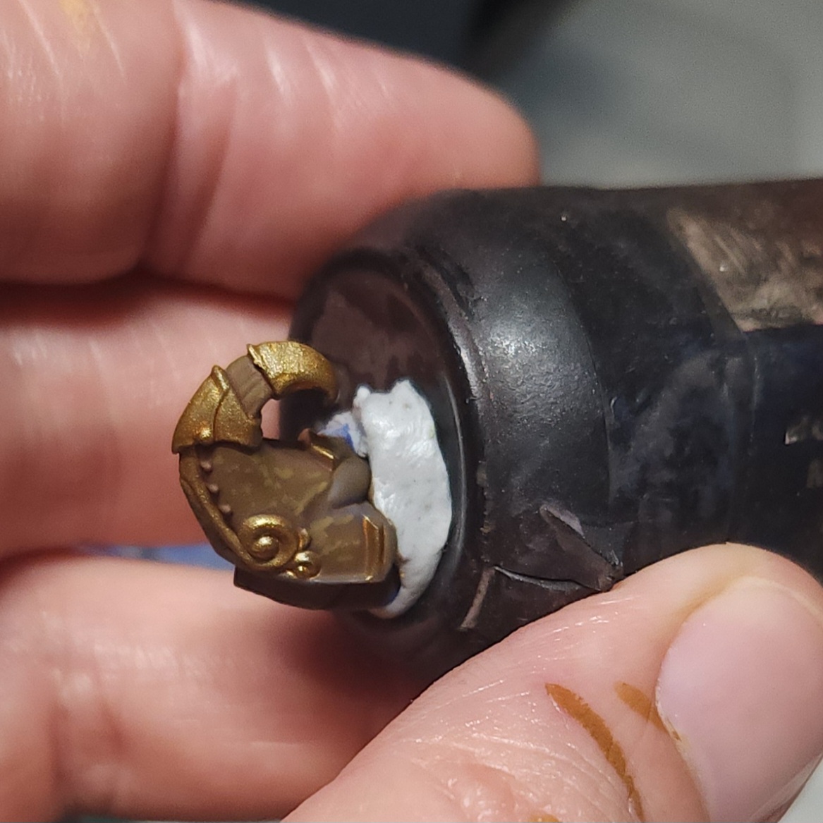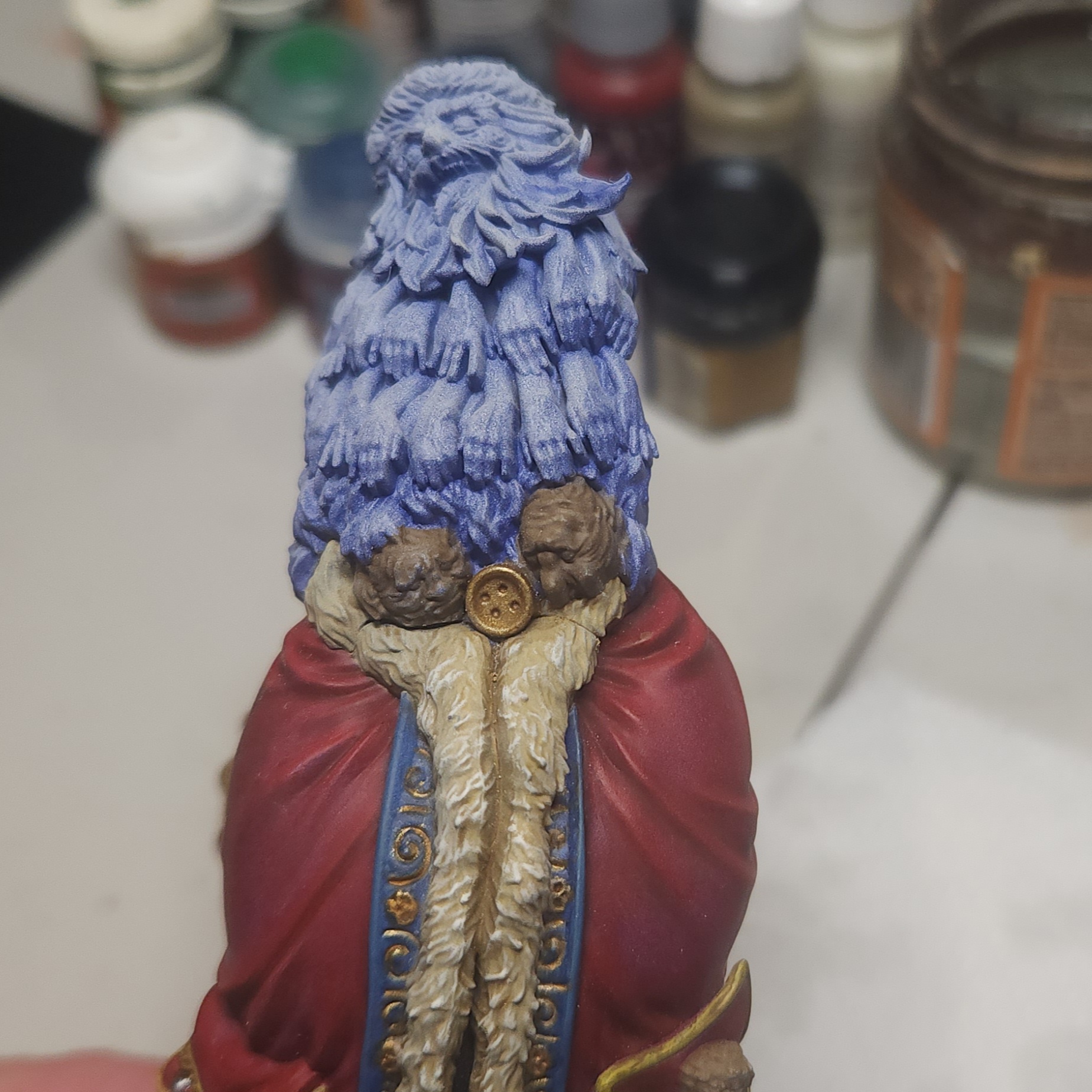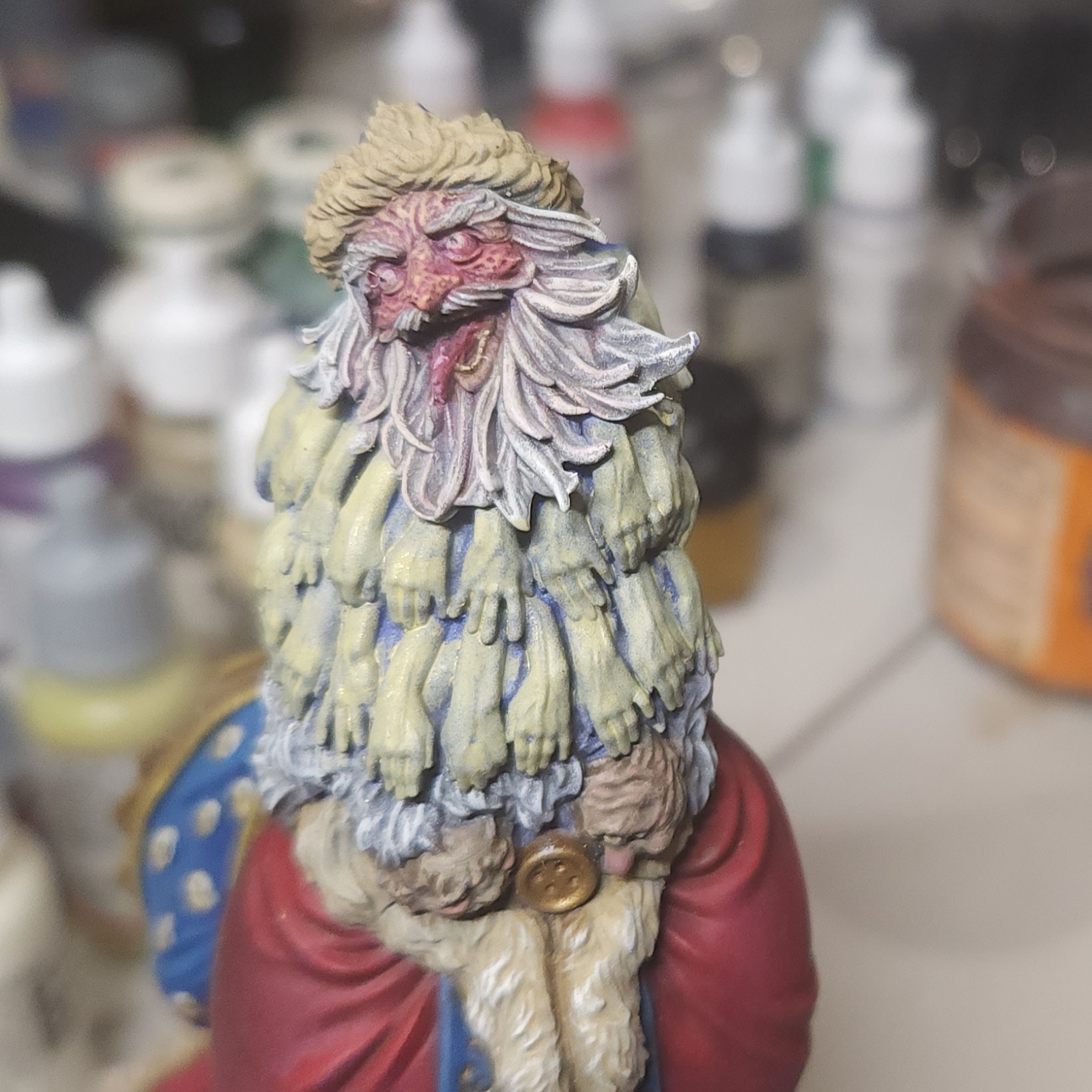 Once this was dry, I took the opportunity to glue it back on to the main body of the miniature. The next steps will include painting the beard of hands, which overlaps onto this component.