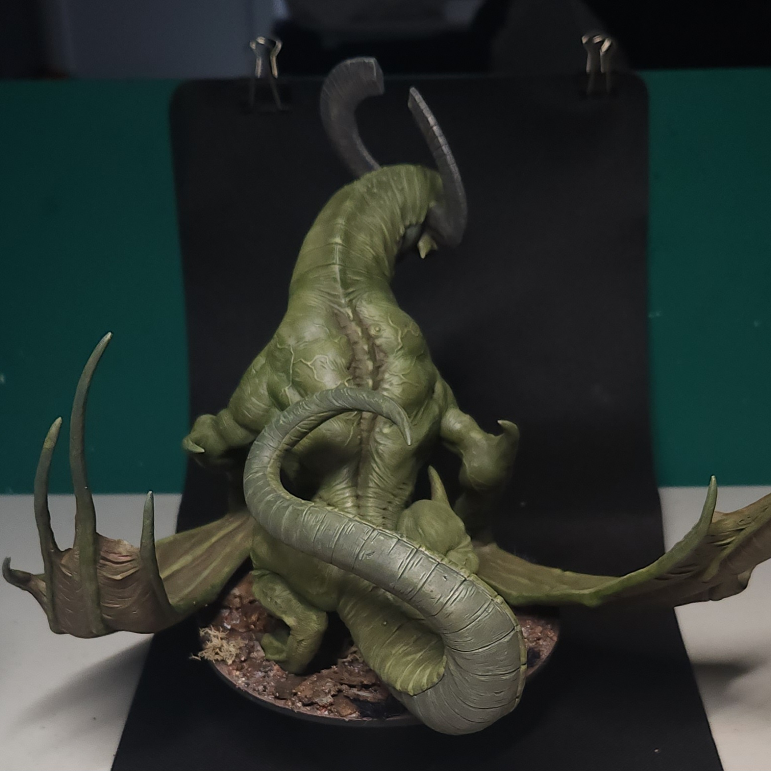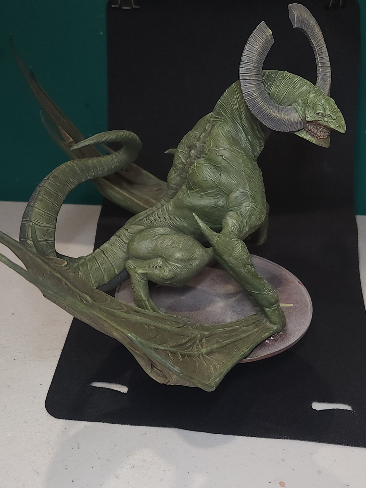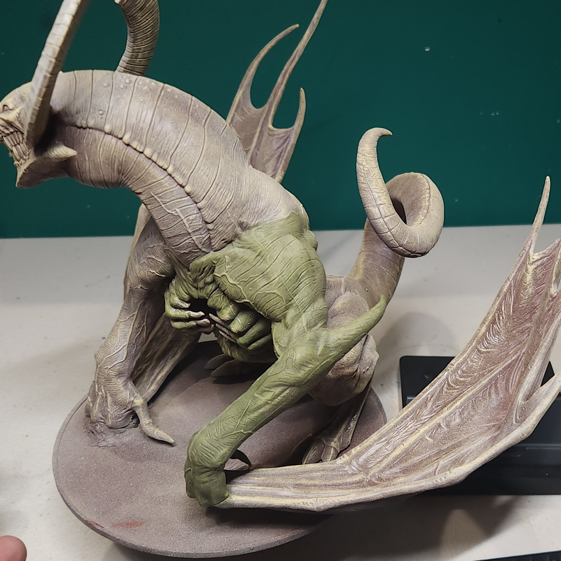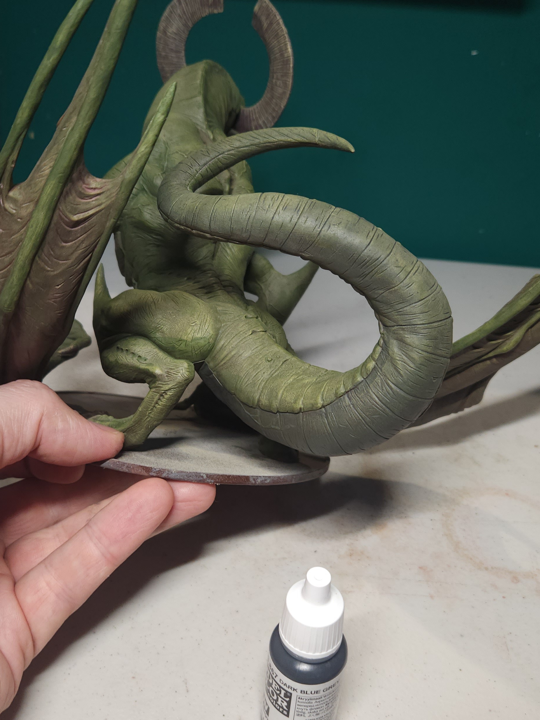 This time, I glued the wing and then pinned a 20mm slotta base to the bottom to reinforce the join. This was then pinned to the 150mm base the Dragon sits on, and all concealed with greenstuff.
