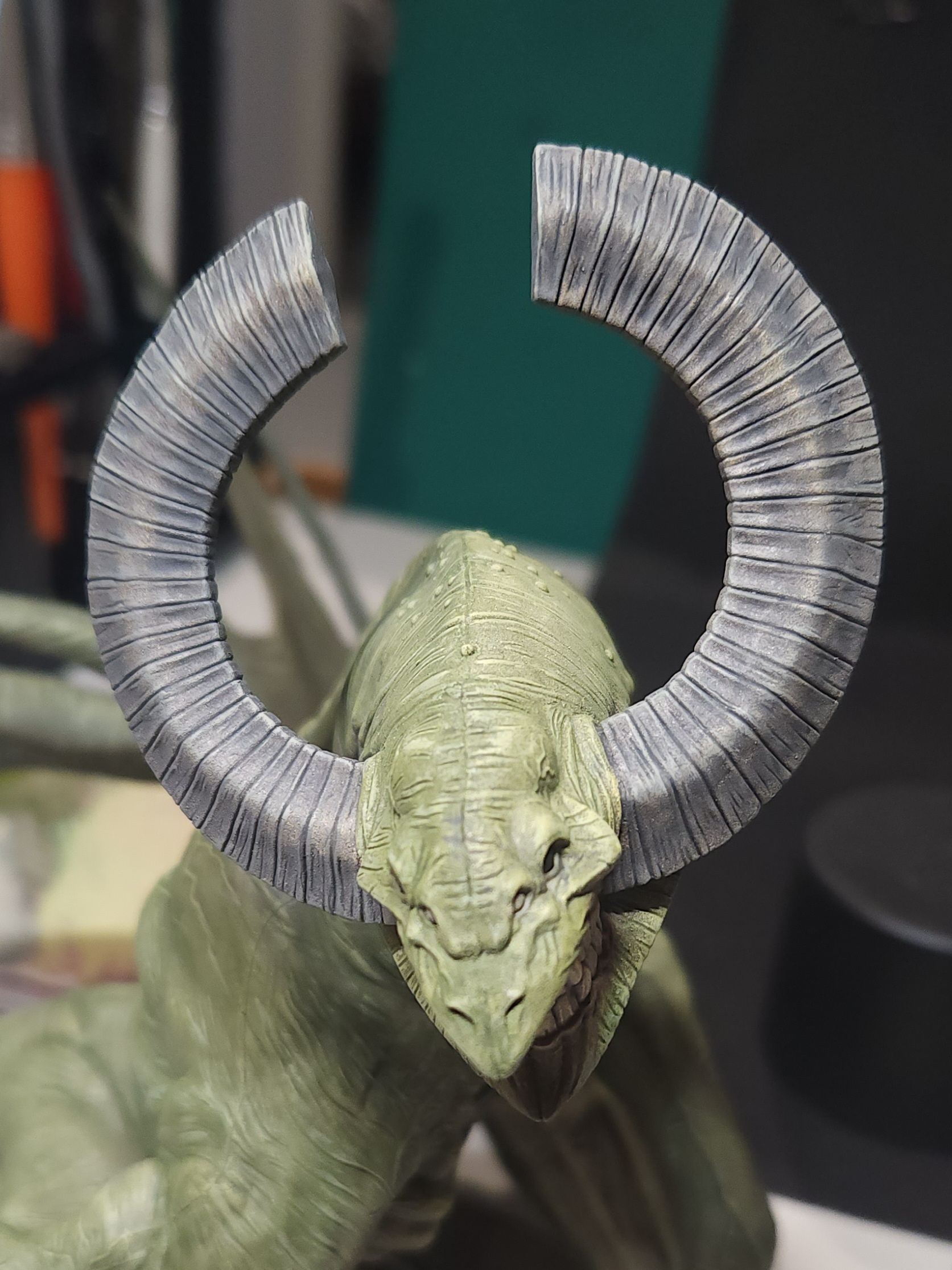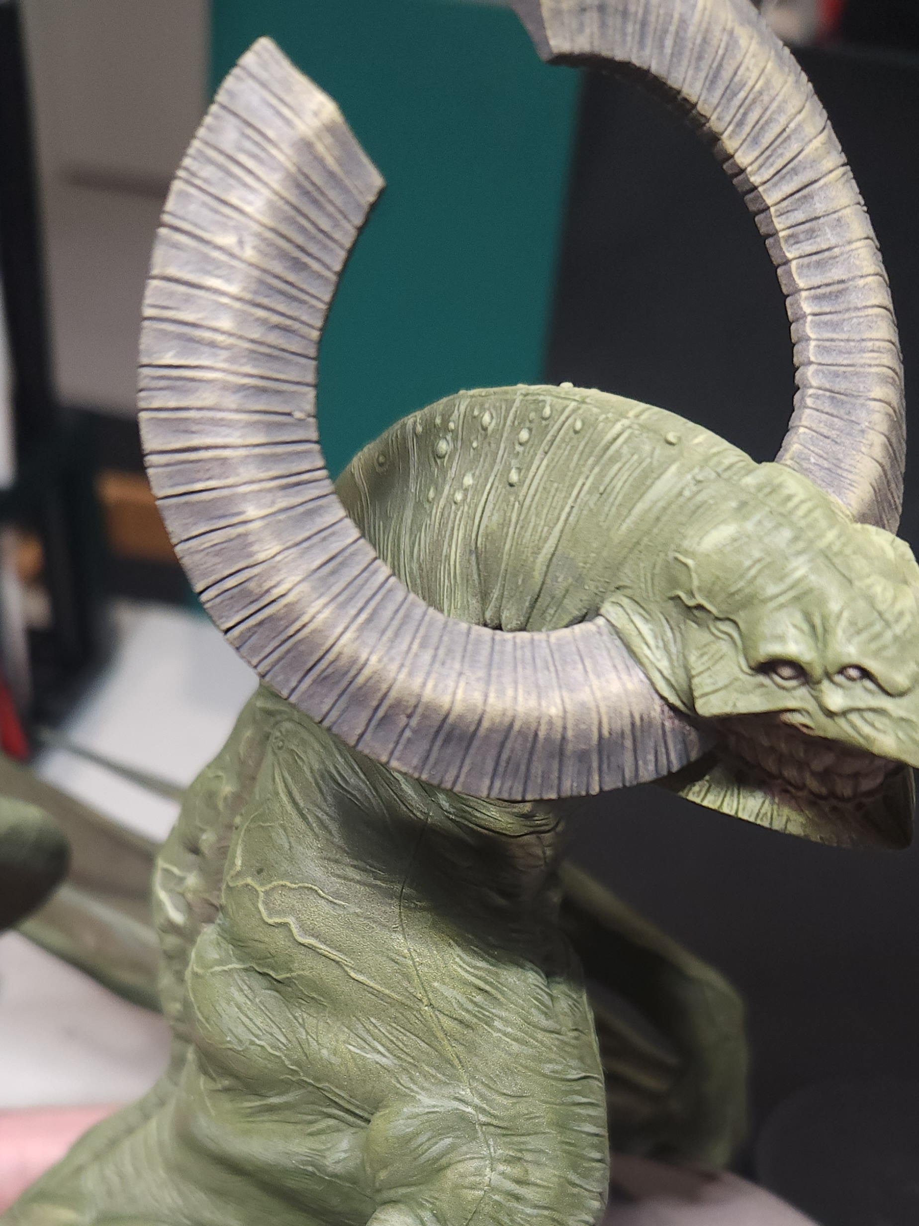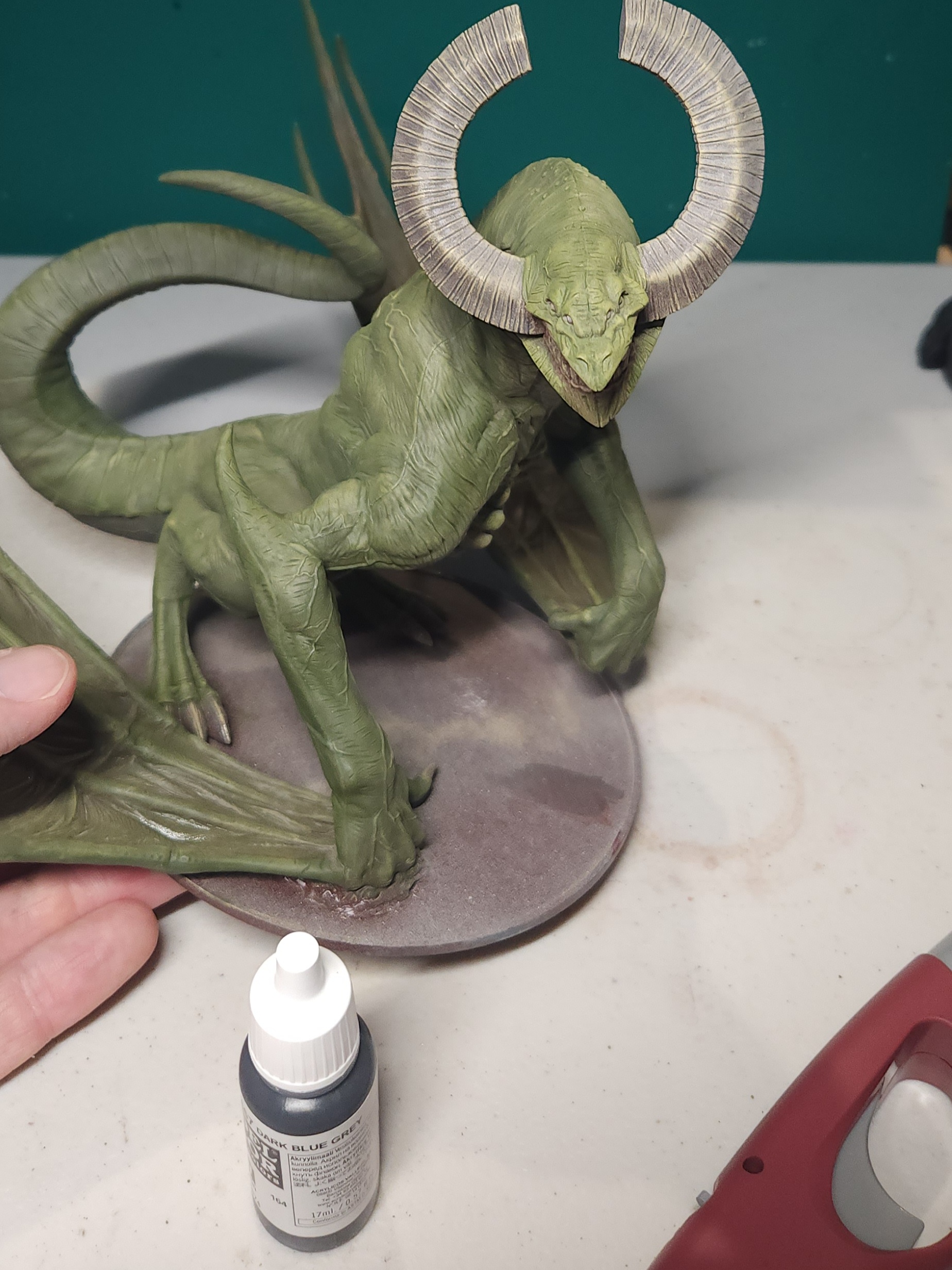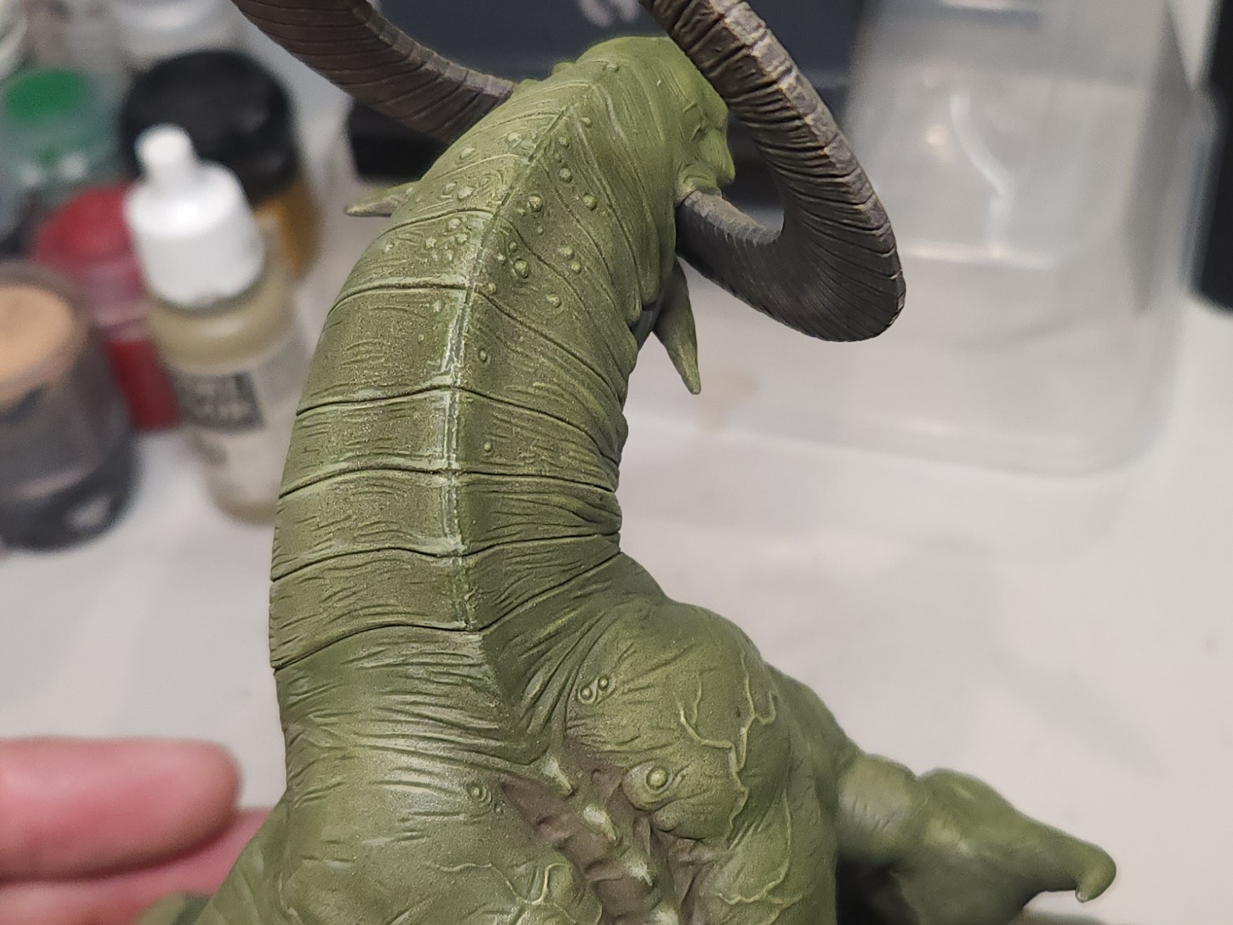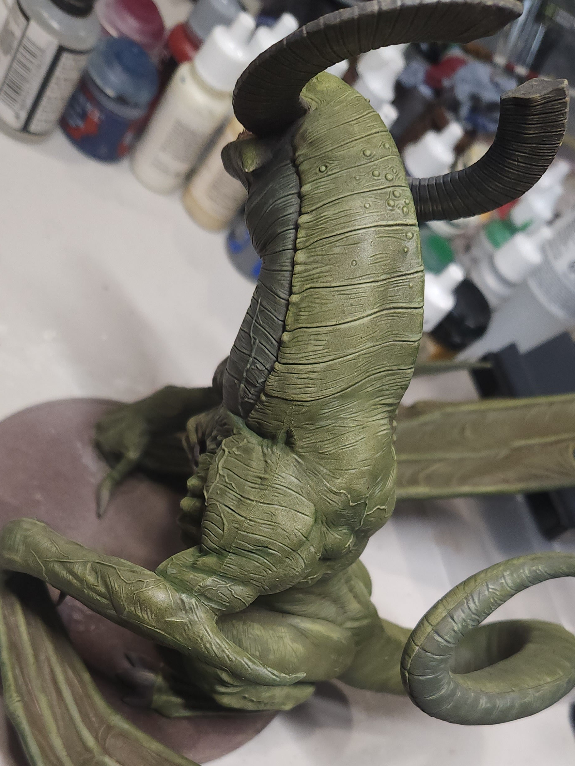 - Shots of the neck also showing highlighting on the ridges of the skin using the same colour mix. I specifically only used this mix on the skin, not the horns/claws/ribs. They’ll get done with different colours later to differentiate them.